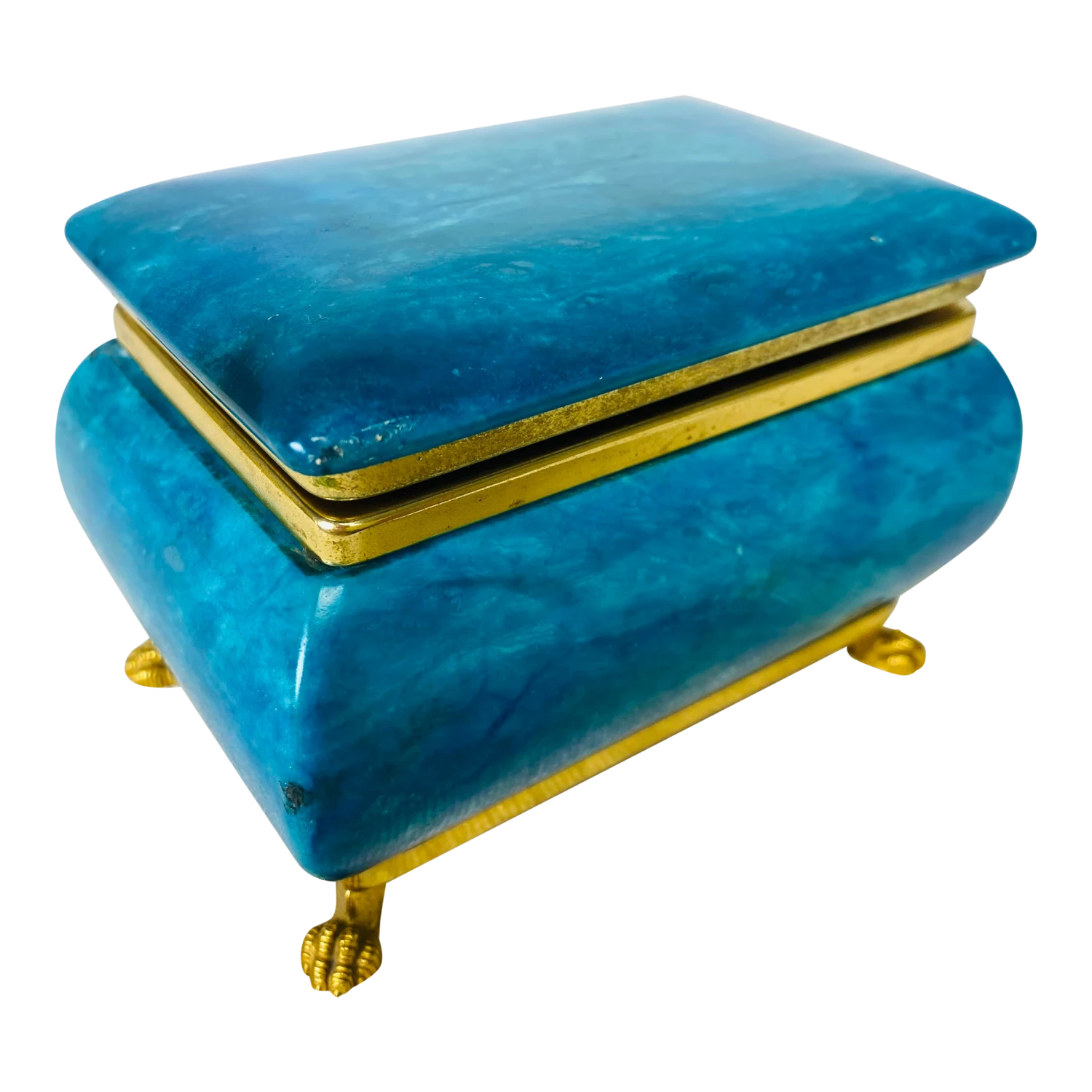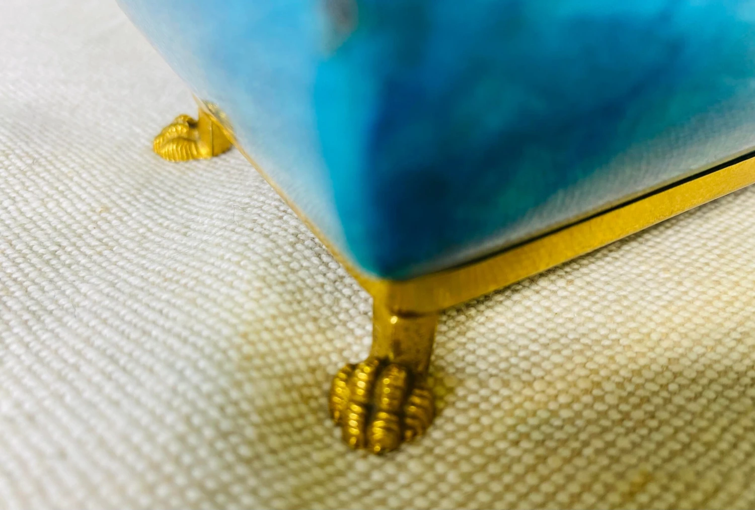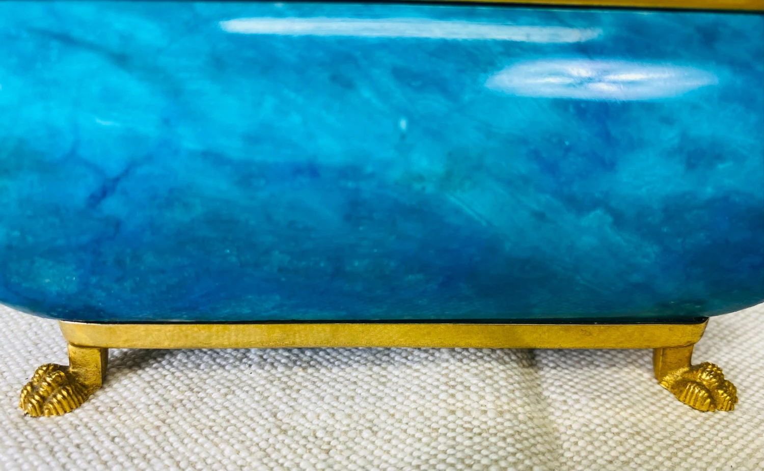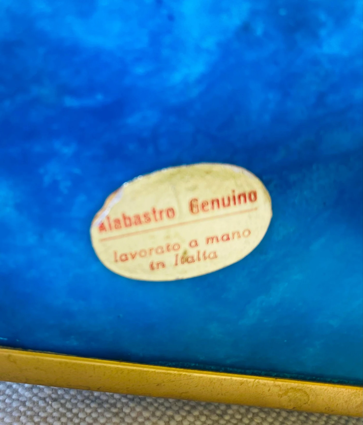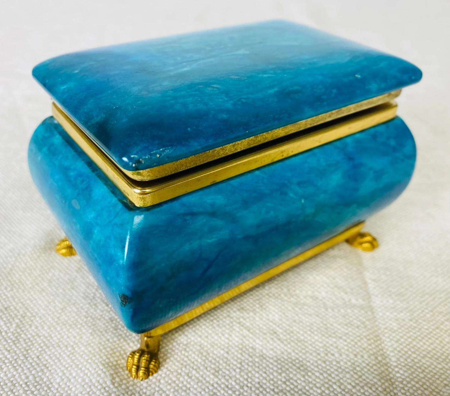 This is a handmade mid century vintage Italian alabaster trinket box. This dynamic blue alabaster box has handmade brass details at the opening rim and at the base with Lion paw feet. This trinket box has the original Italian tag on the underside and was made in Italy circa 1950.