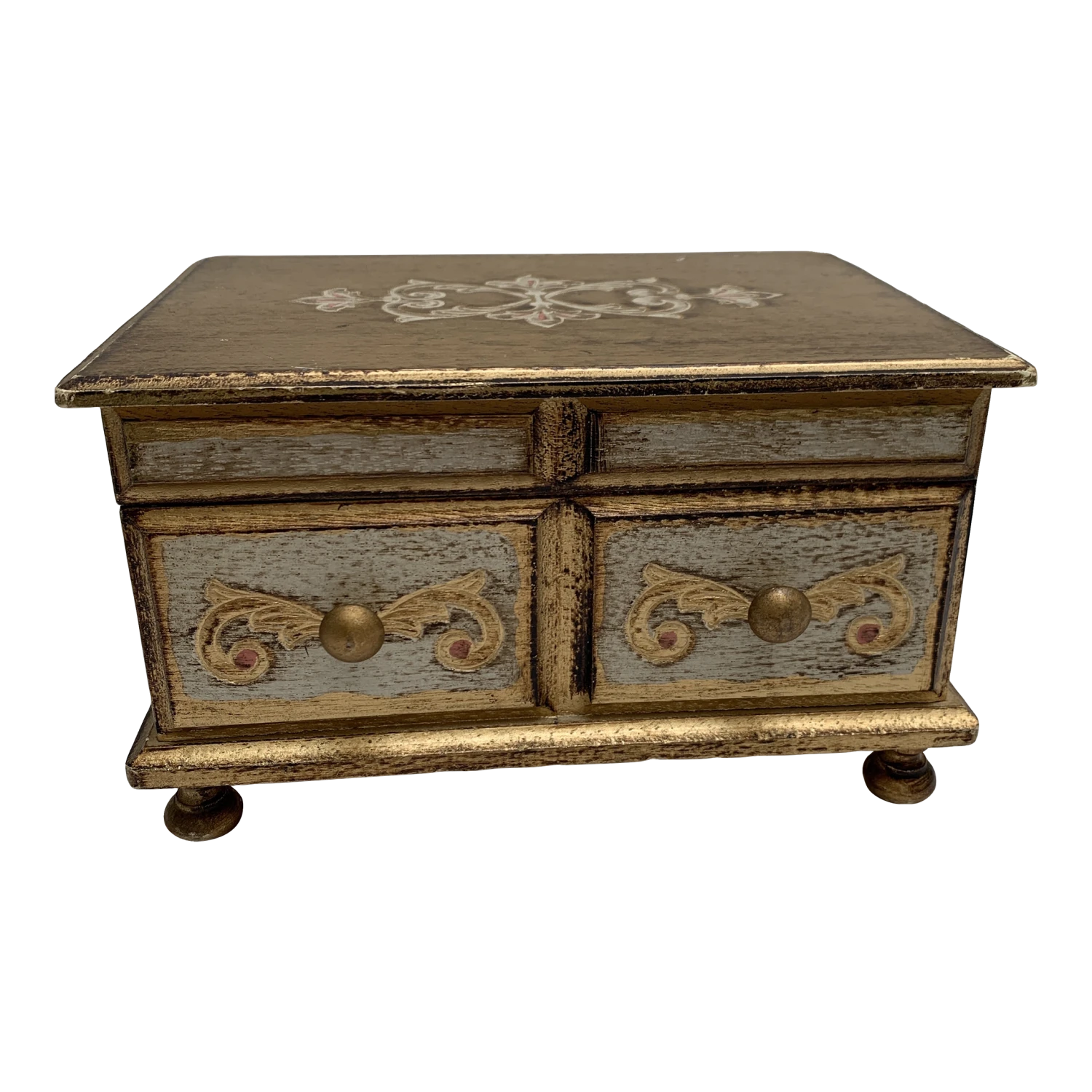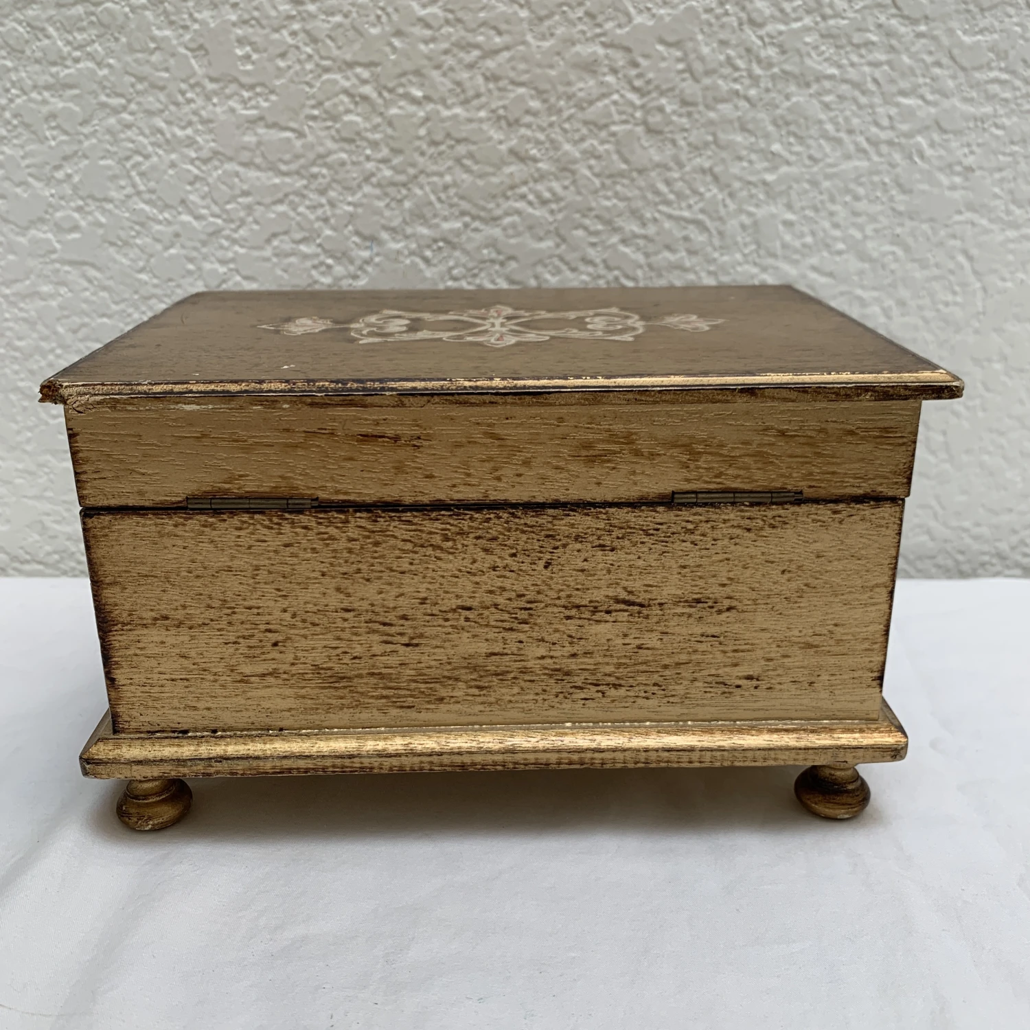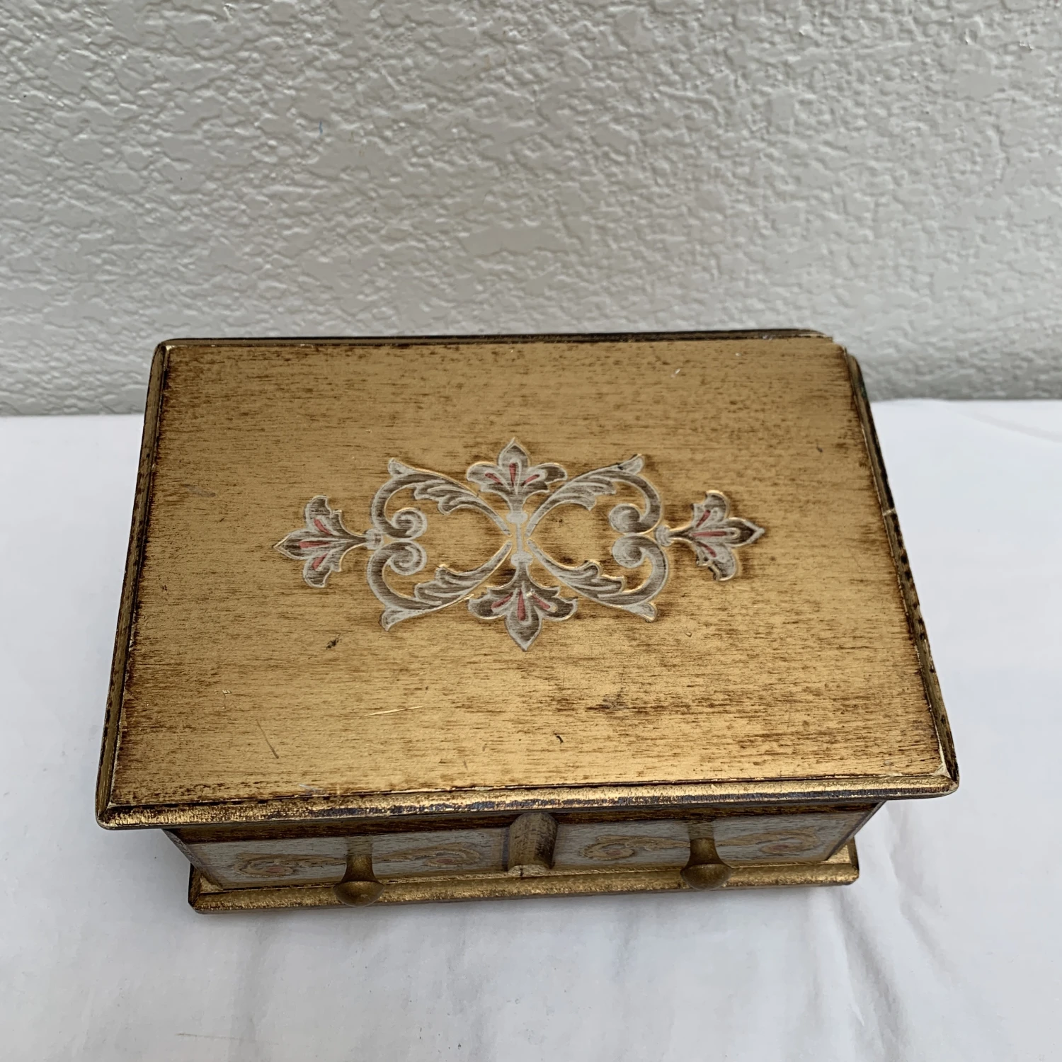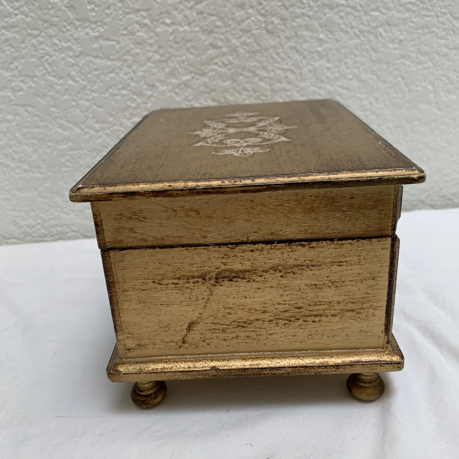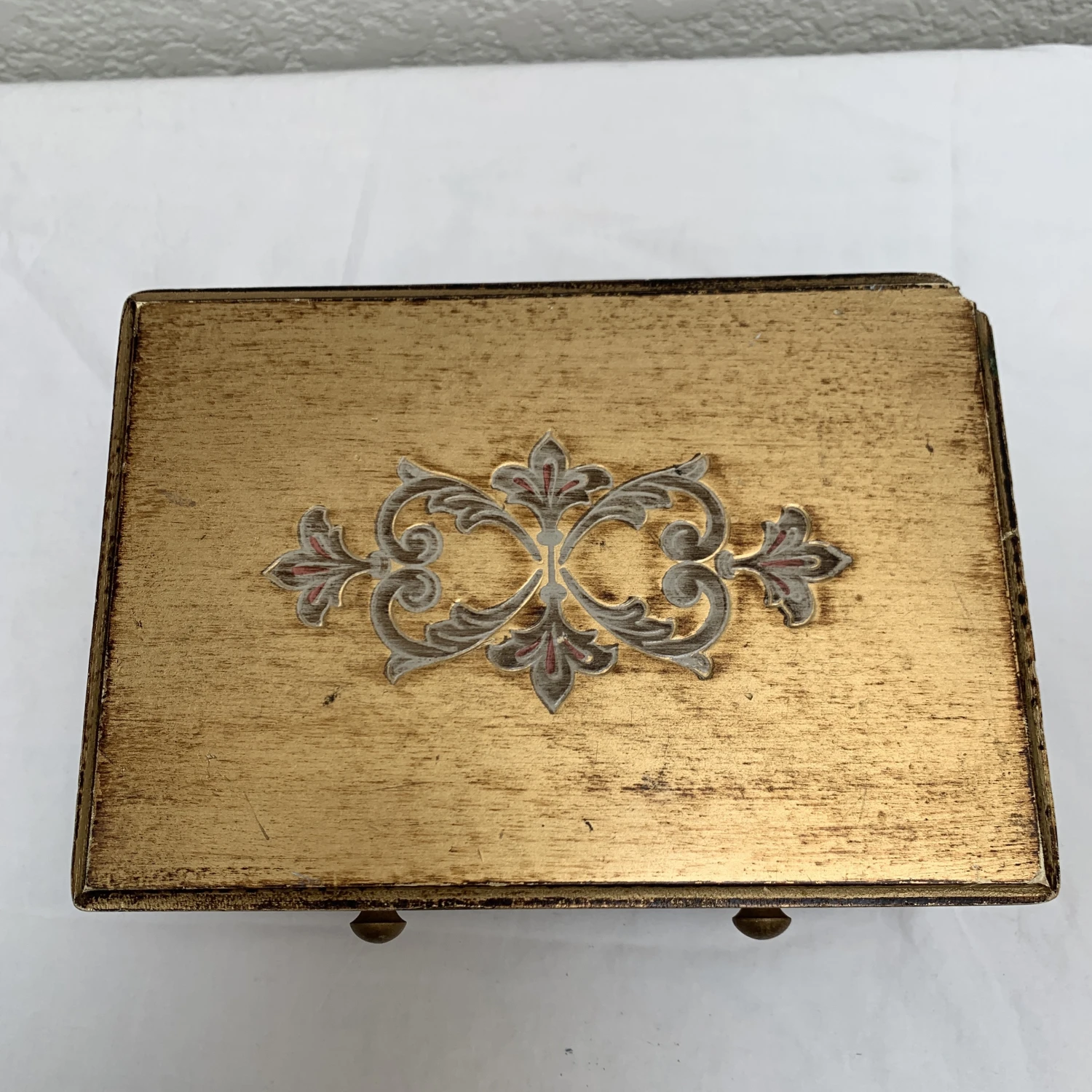 Petite vintage wood Florentine jewelry box with crimson velvet lined interior. Was a music box but it doesn’t seem to …