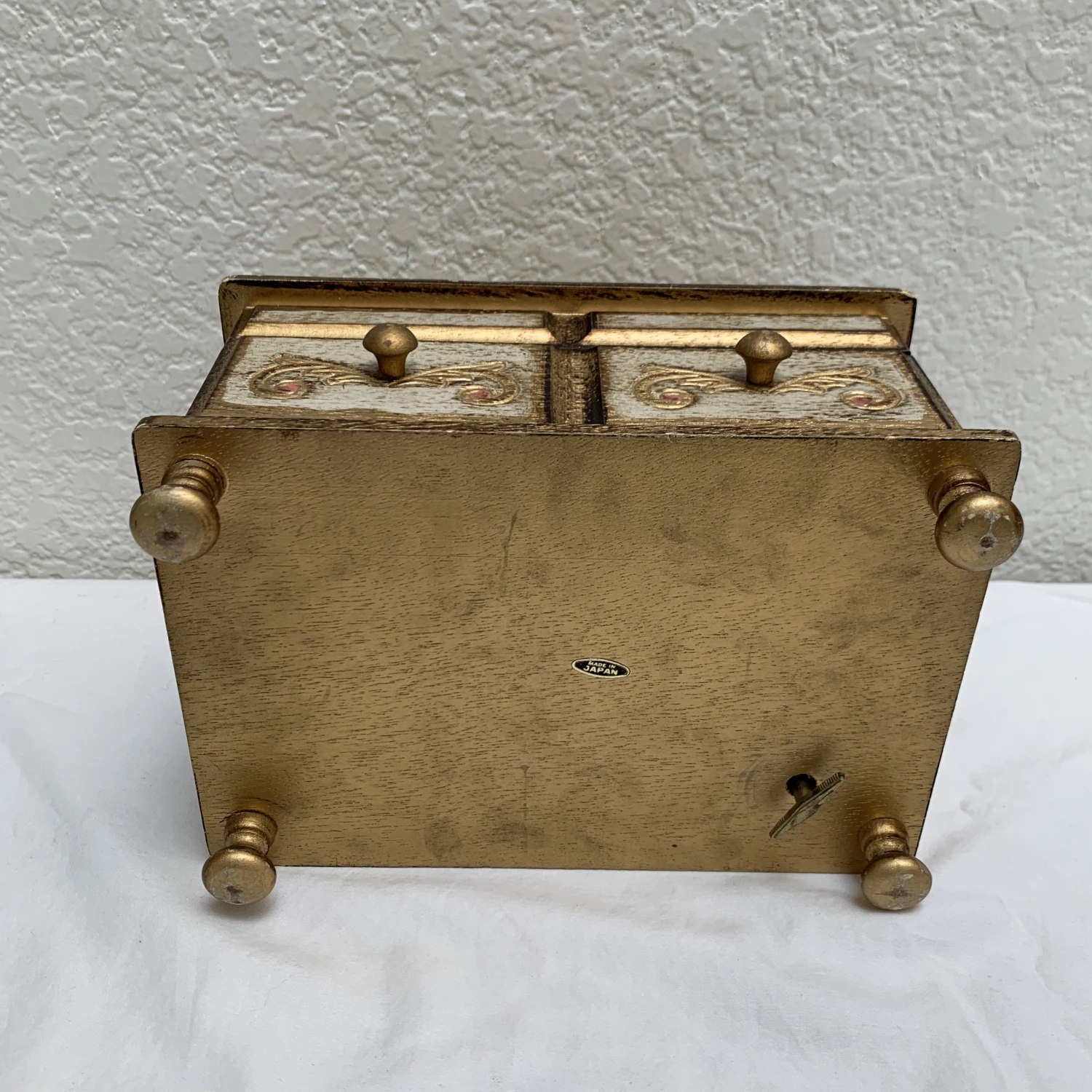 Petite vintage wood Florentine jewelry box with crimson velvet lined interior. Was a music box but it doesn’t seem to be working as to the tune. Made in Japan