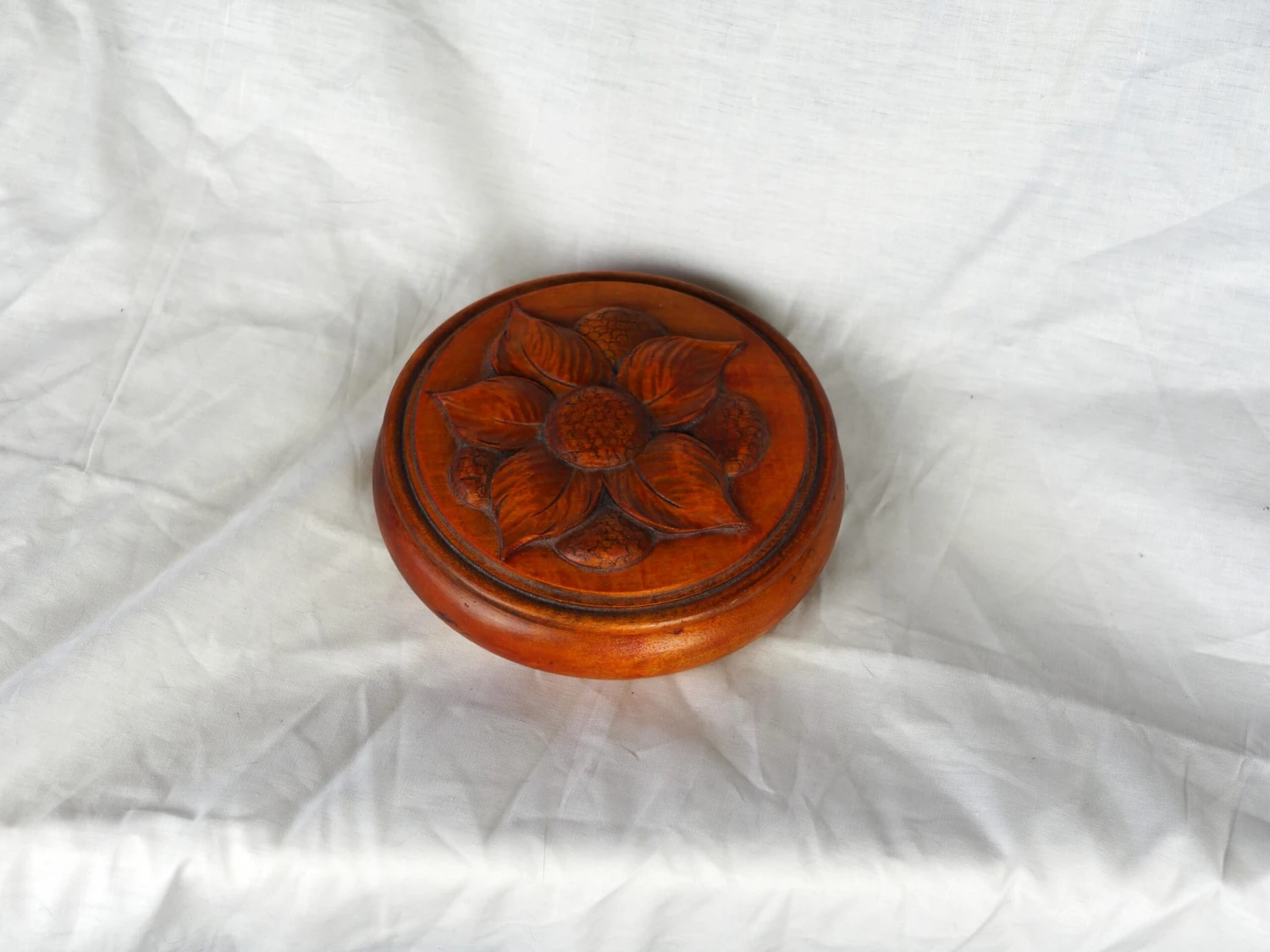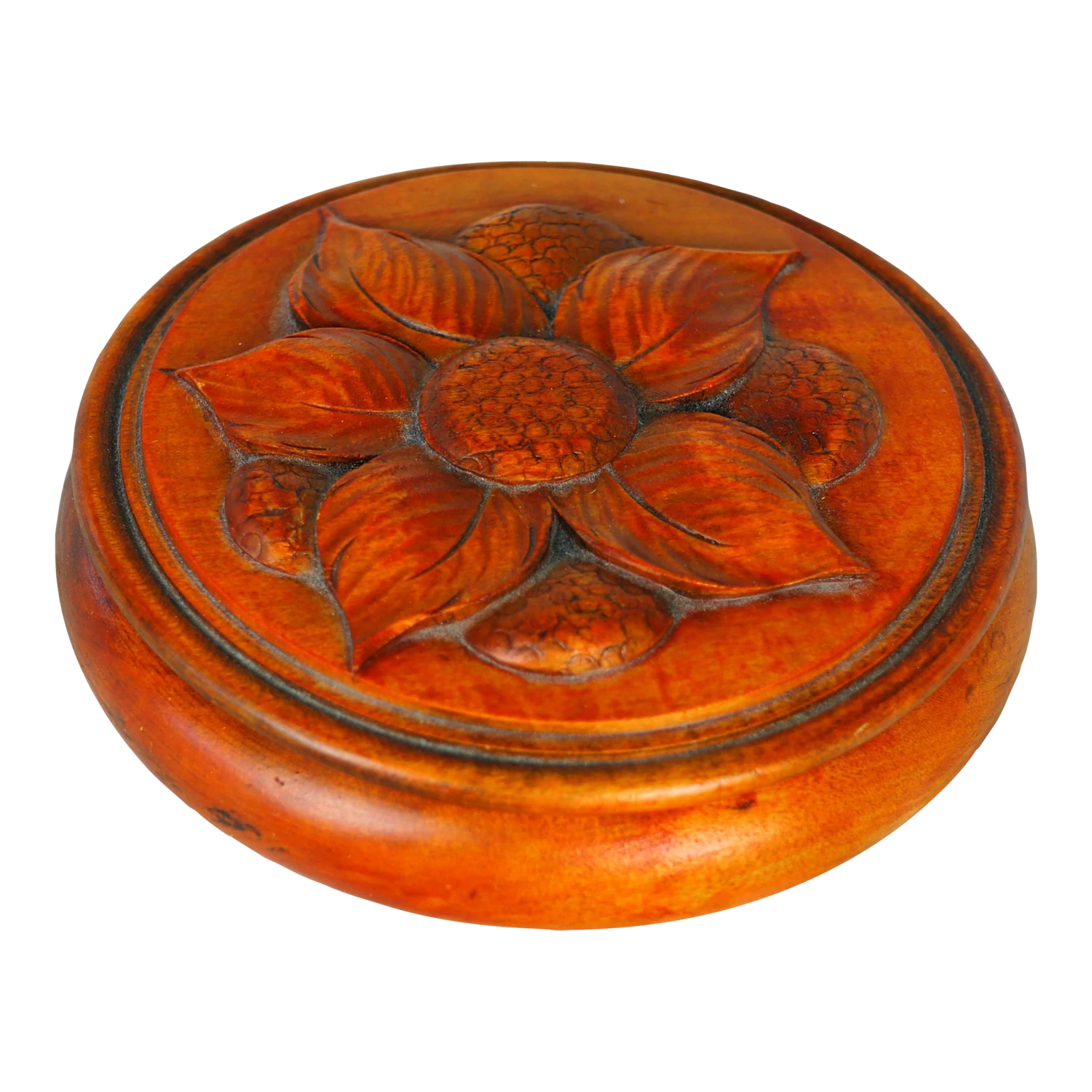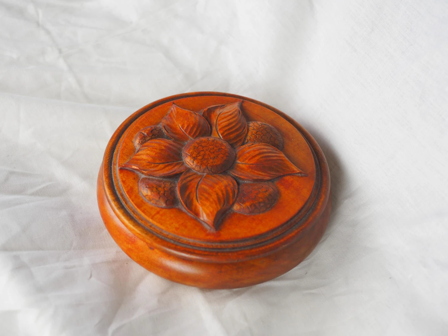 Large jewelry box in turned pink wood with a carved flower.