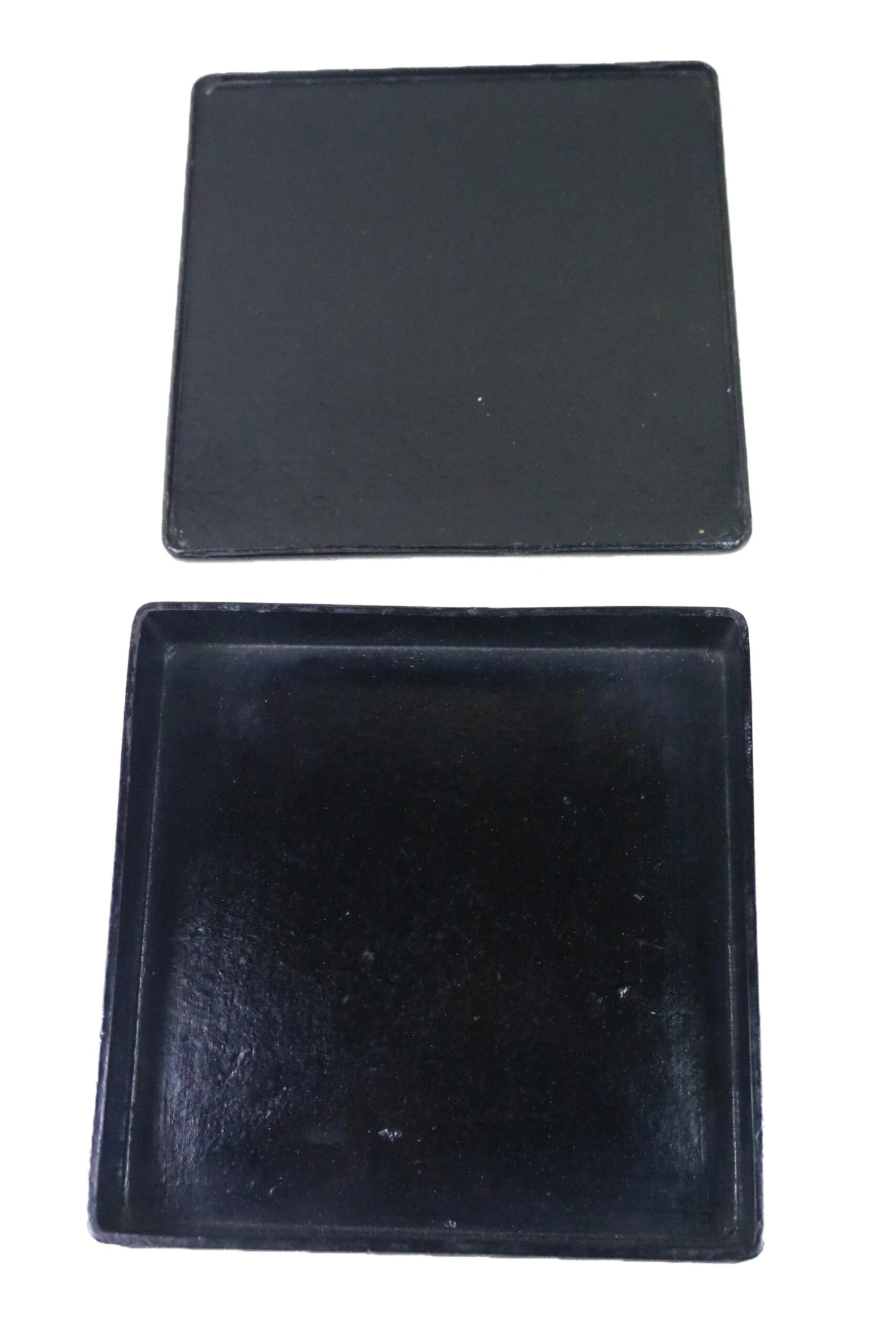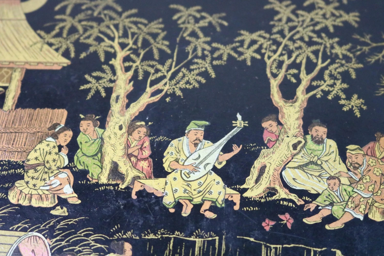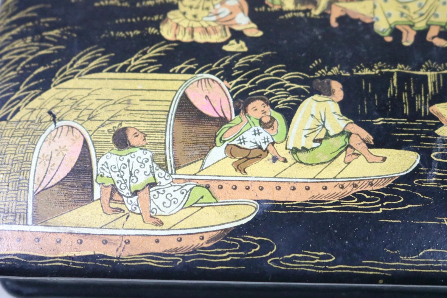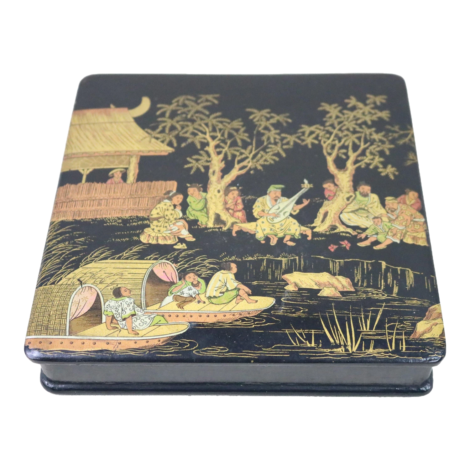 A lidded paper mache box with overall black lacquer finish and decorated in a Japenese motif. The box dates from the middle of the 19th century and was made for the French market during the reign of Napoleon III. It is in very good as found condition with only slight usage wear. It was found in Paris.