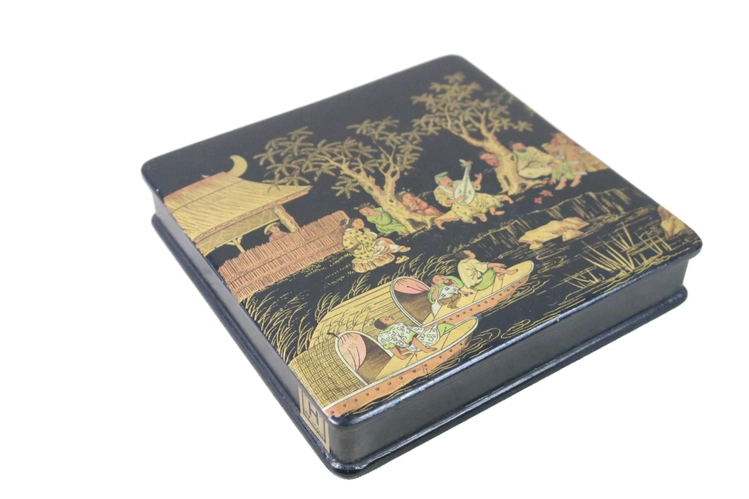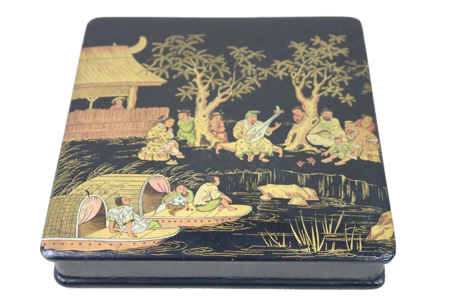 A lidded paper mache box with overall black lacquer finish and decorated in a Japenese motif. The box dates from …