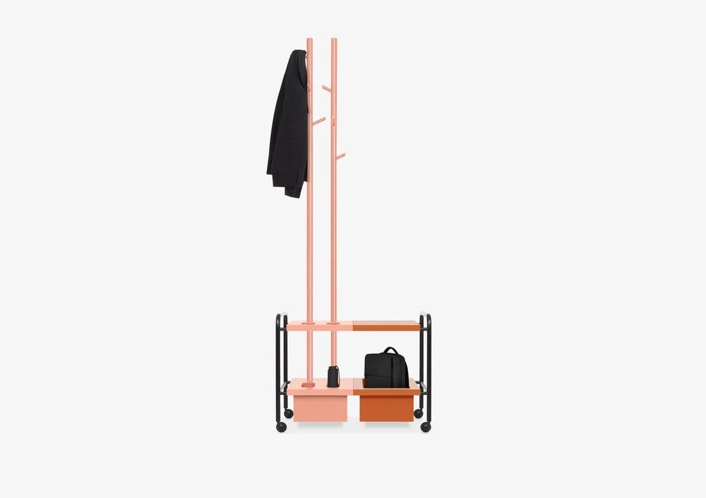 Coat stand composed of 1 lacquered steel structure with wheels and 3 tops in lacquered mdf. The living tops have a recess that allows a simple fit into the structure and you can easily change the order of placement.