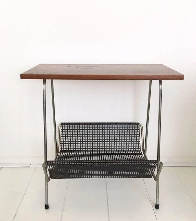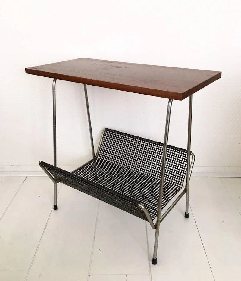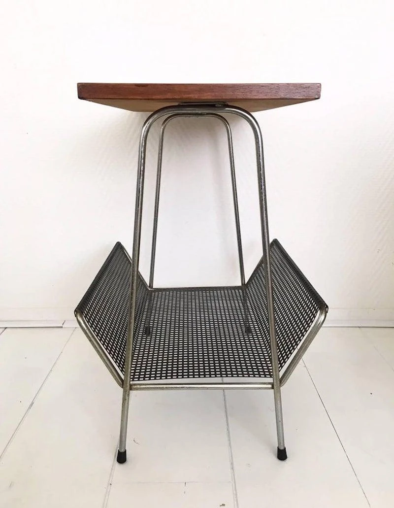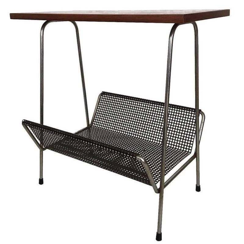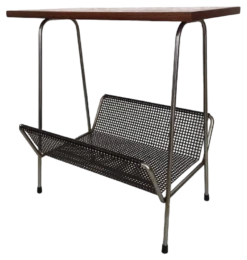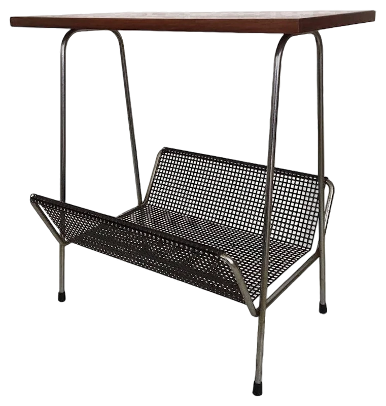This elegant magazine rack was most likely manufactured by Pilastro circa 1950s-1960s in The Netherlands. It features a Teak top and a black perforated metal basket.