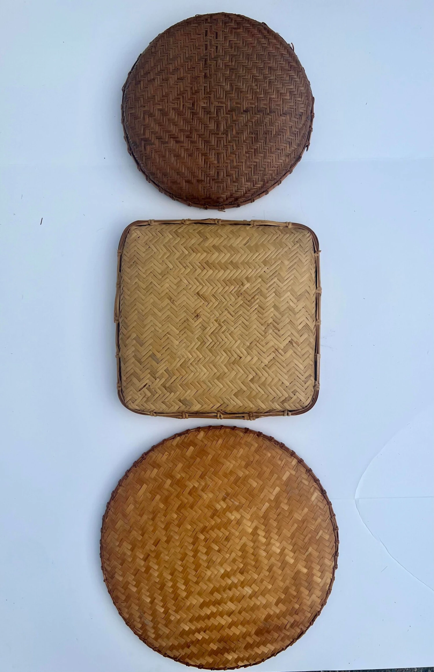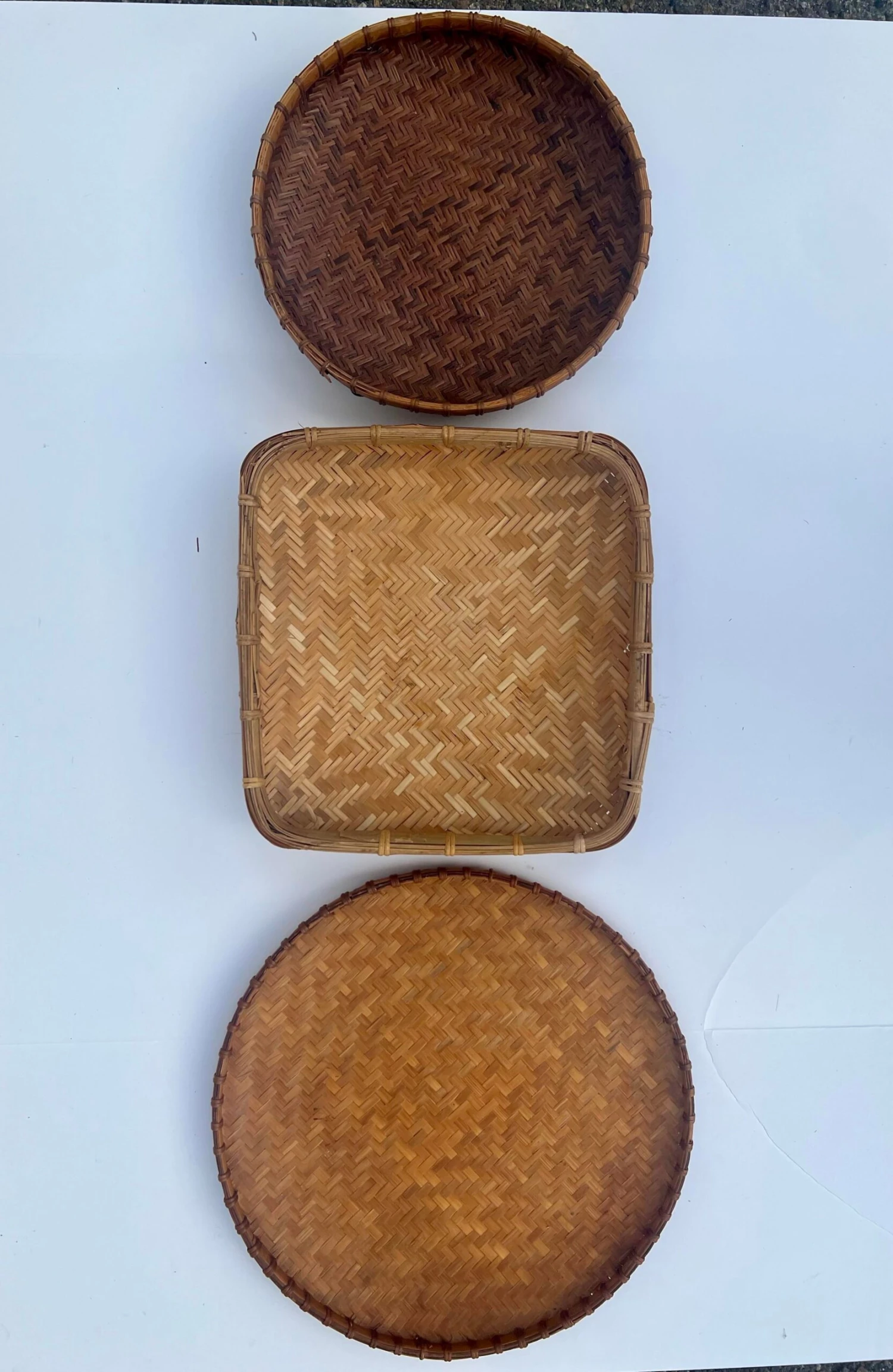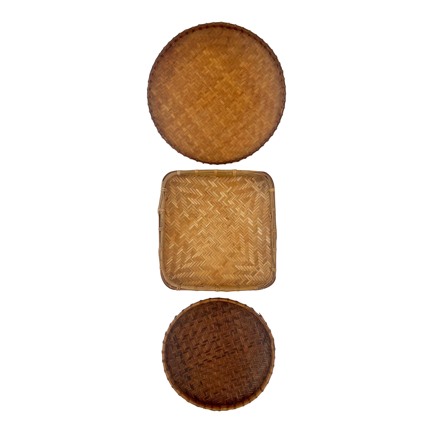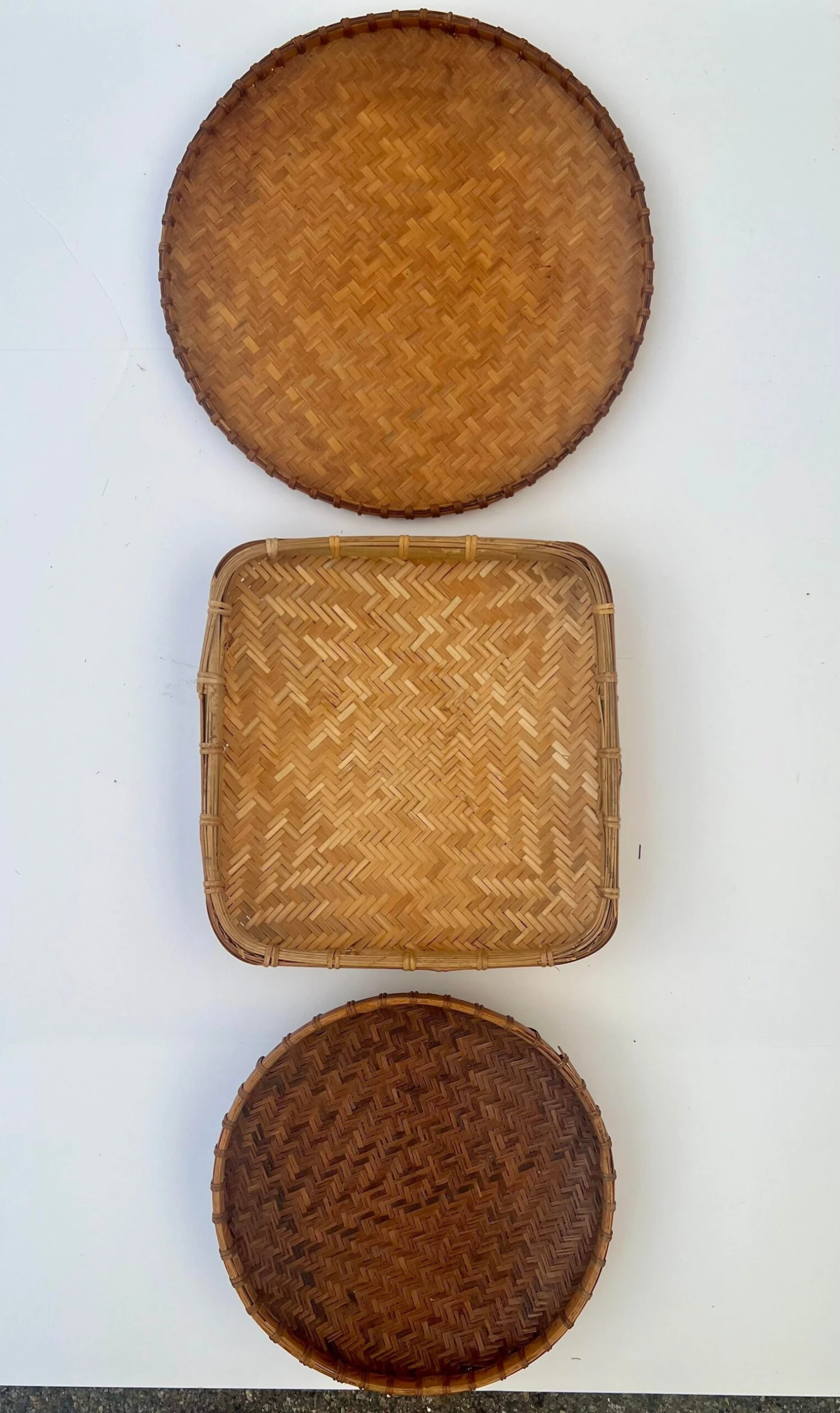 A set of three winnowing trays that would live their best life as a wall display. All are in varying …