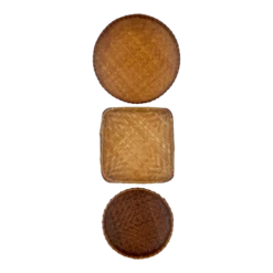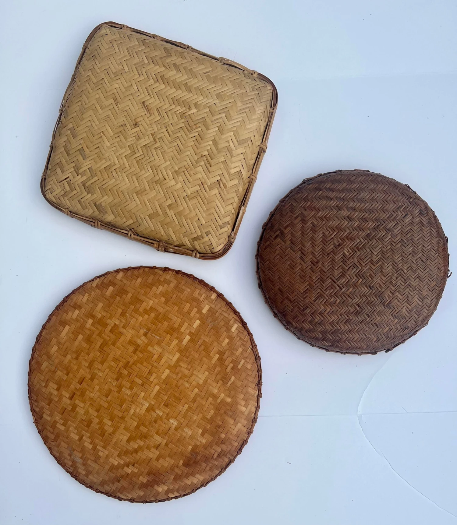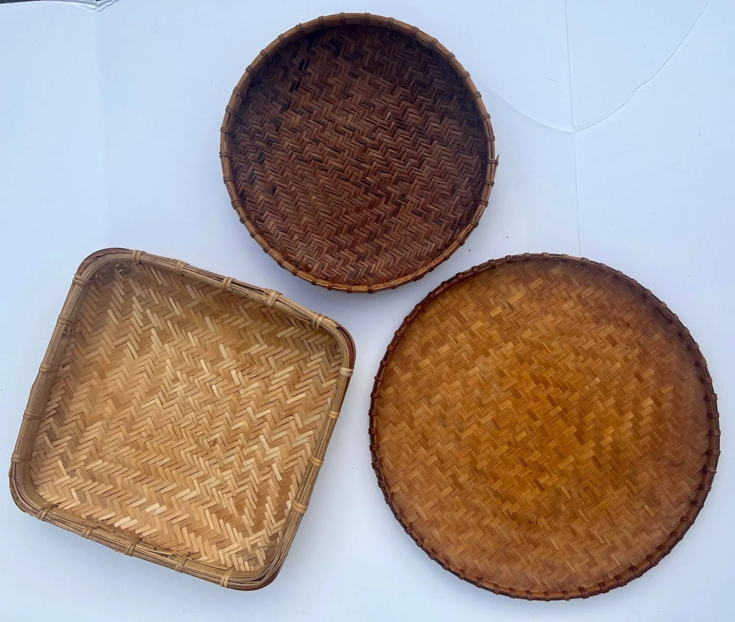 A set of three winnowing trays that would live their best life as a wall display. All are in varying shades of tan and could be arranged to your liking or added to your collection. Excellent condition. Perfect for any boho or rustic home. Please do not hesitate to ask any further questions, thanks!