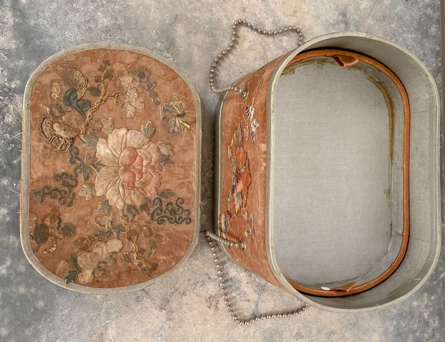 A late 19th Century French sewing box with antique Chinese embroidery