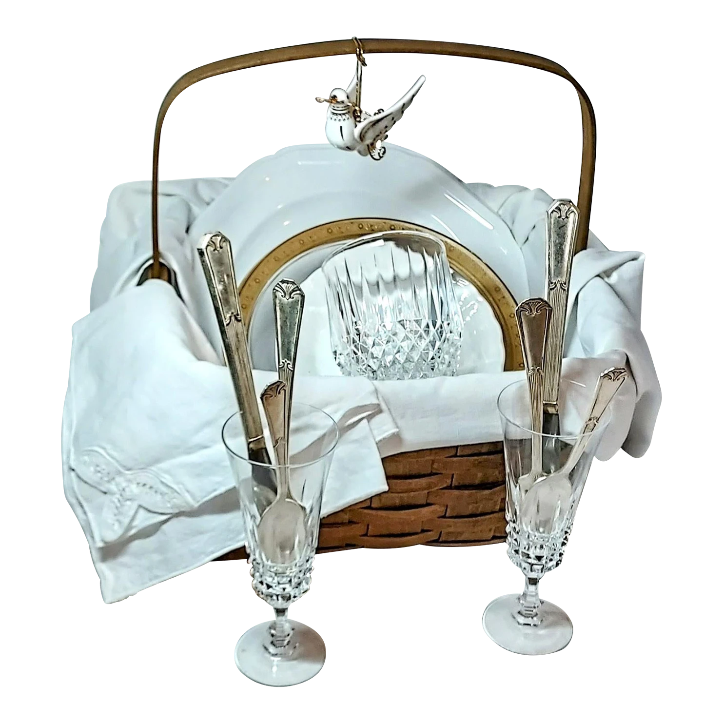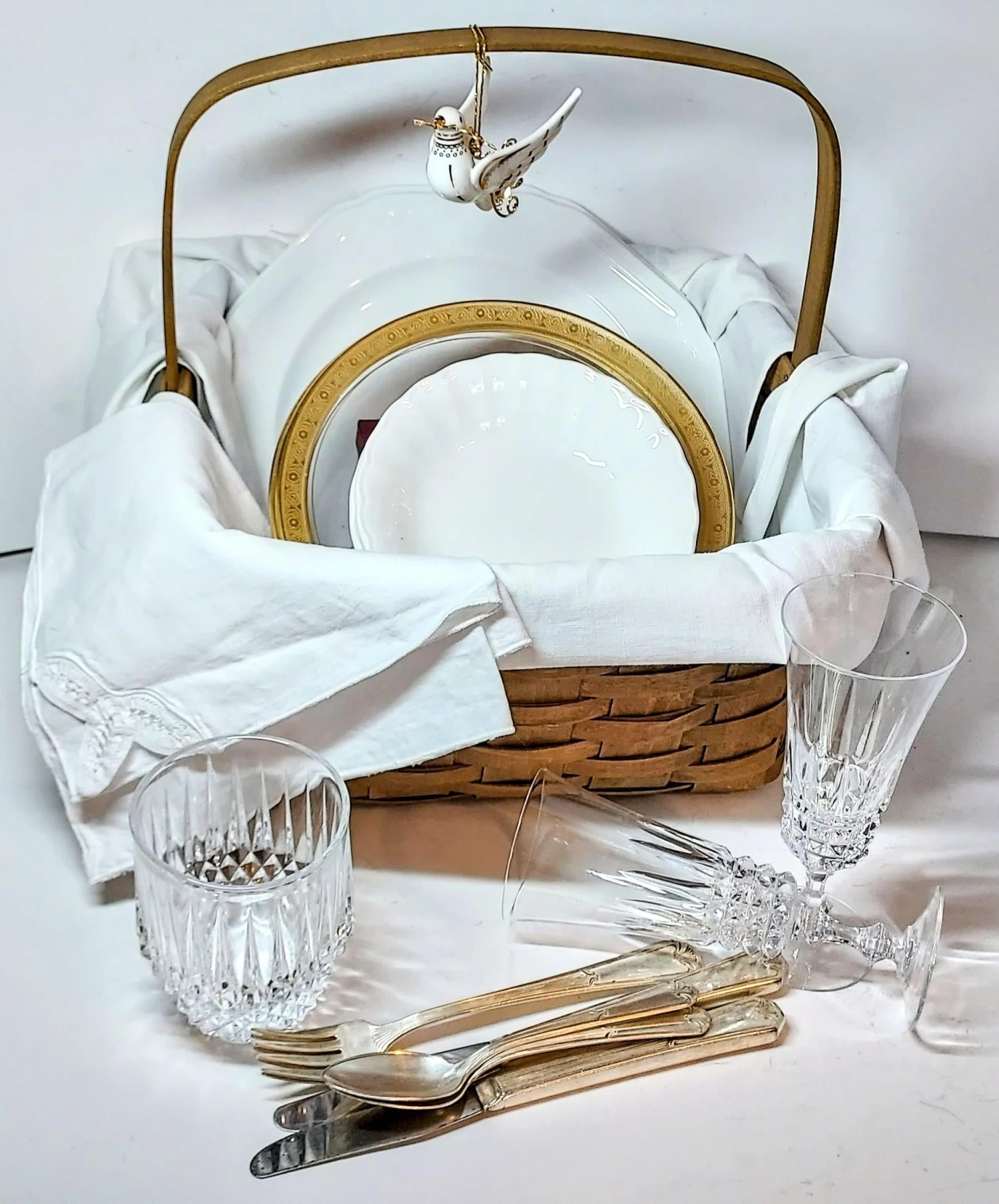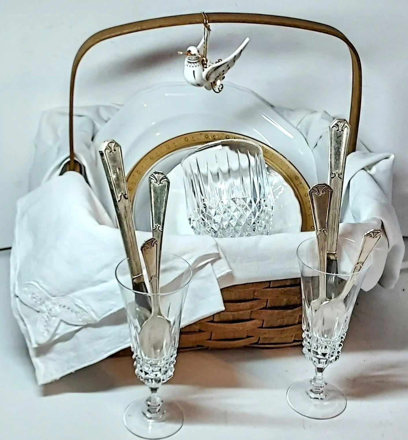 If you need a truly spectacular picnic for 2, I’ve got you covered. Add a catered meal from the restaurant of your choice, a card table and two folding chairs and you have a high end restaurant for two in any location. The basket consists of two each Mikasa bone china dinner plates and dessert bowls in simple white designs. The look is ironstone, the durability is far beyond. Bone china is the hardest form of china made. These are actually freezer to oven to microwave safe. It’s paired with two glass salad plates embossed with a 24 kt gold art deco design. Two French crystal champagne toasting flutes are set off by the single crystal double old fashioned that serves as candle holder. The shimmer, glimmer and shine of the crystal can only be further set afire by the light of a candle. The silverware is from William Rogers, the design is Guild – Cadence c. 1932 and is extra plate silver, accented with harps with two 3 piece place settings. Table cloth is vintage -either high count cotton or linen monogramed with TEG, with strings on all 4 edges to tie to the card table. Coordinating napkins with Battenberg lace trim are included. The 11.75″ cubed Basket is a signed Longaberger from 1988, made of their signature maple with metal nails. All this is topped with a Baldwin Brass porcelain and 24 kt gold art deco dove of peace Christmas ornament still in original box. Long after the Dove adorns the tree- or takes it’s place in your home- this quality date basket can be kept for special occasions- either out and about or for a special table for two at home. Followers of my store get notifications of new listings and discounts.