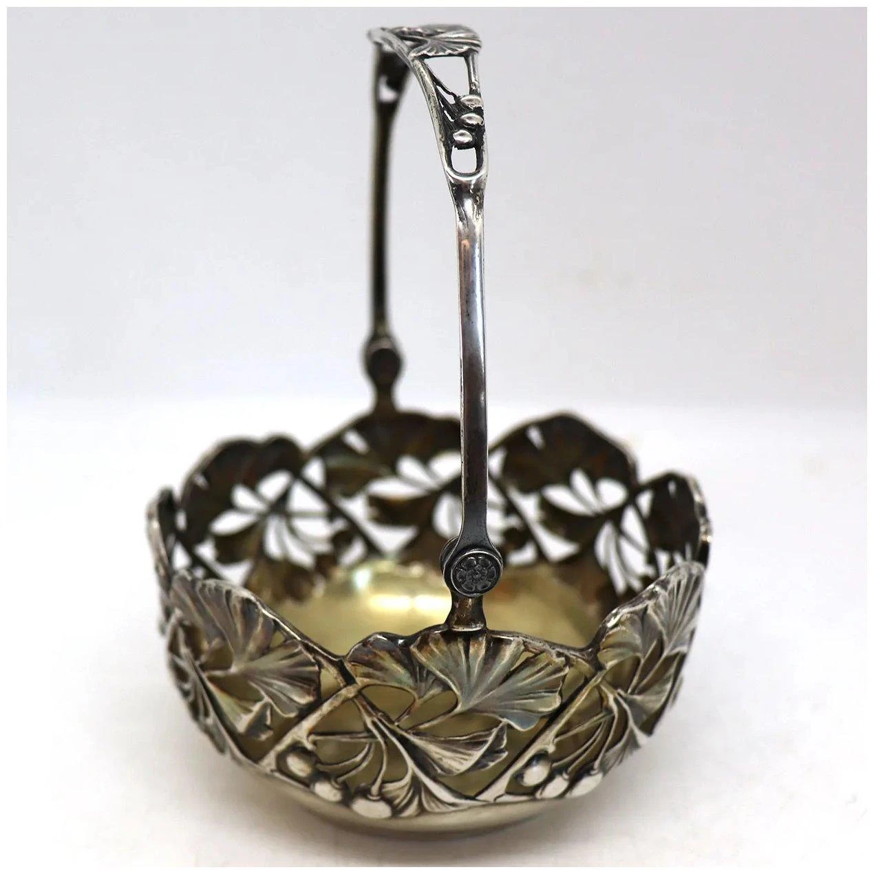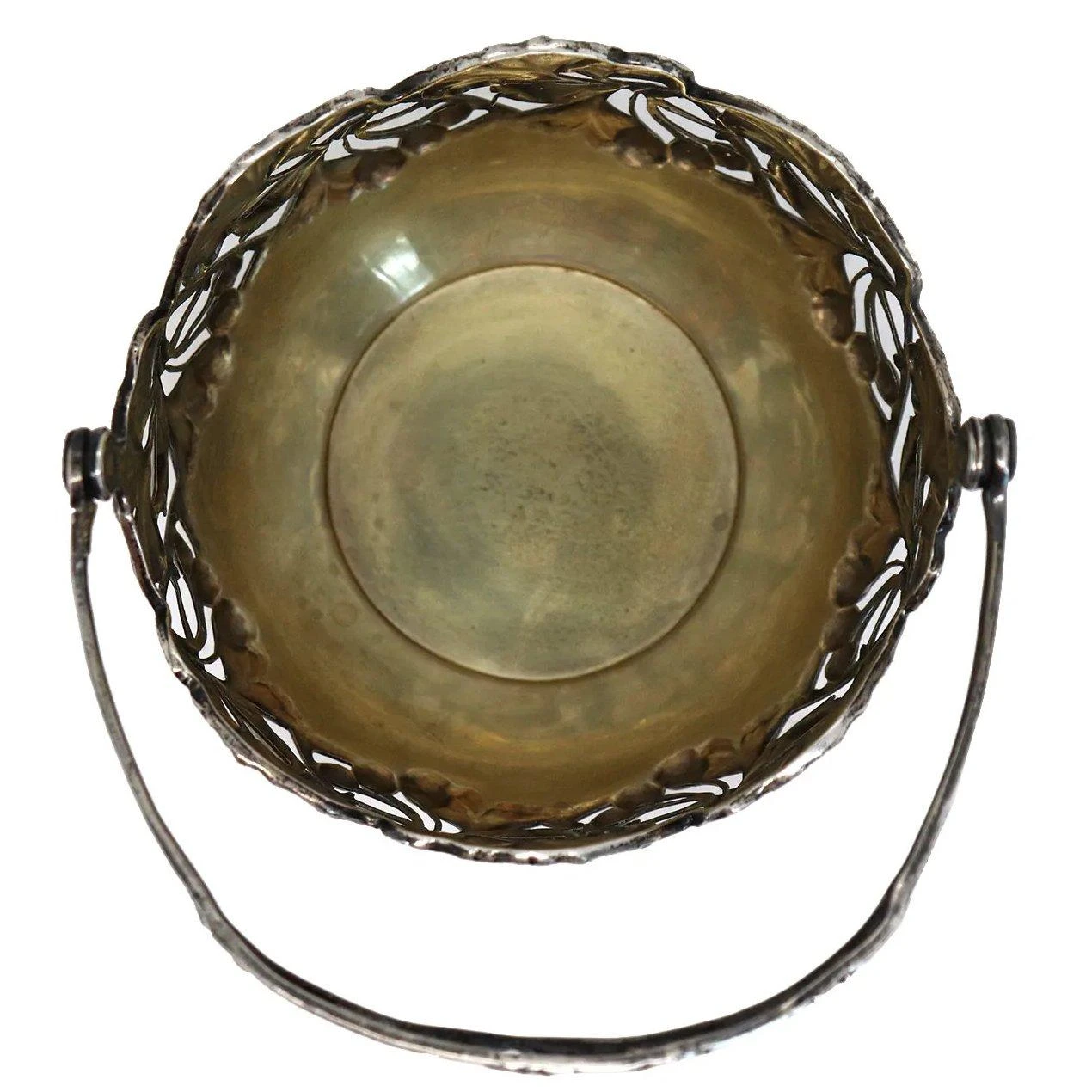 An antique openwork basket with ginkgo leaves and berries and swing handle.
