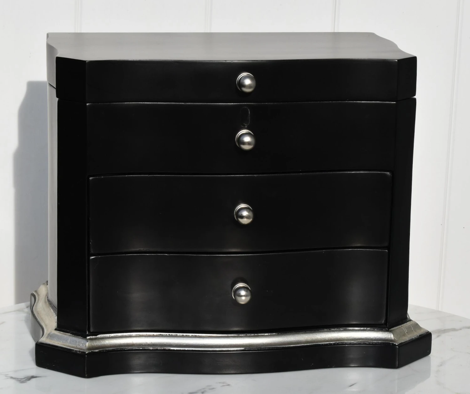 New Jewelry Box (2000s) has a Transitional Style. Made of Wood & Composite. It Features a Mirrored Back, Two Drawers, and Fitted Interior. The Finish is Black & Silver. The Measurements: 16″W x 10″D x 12″H.