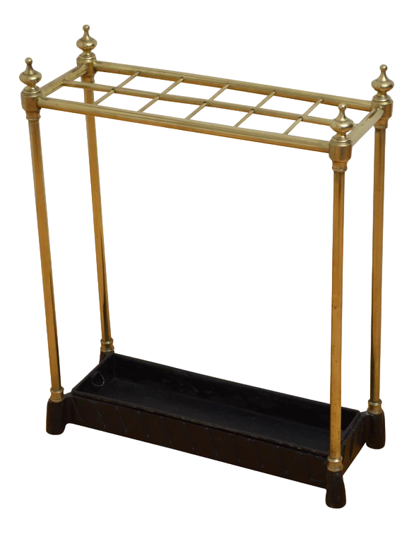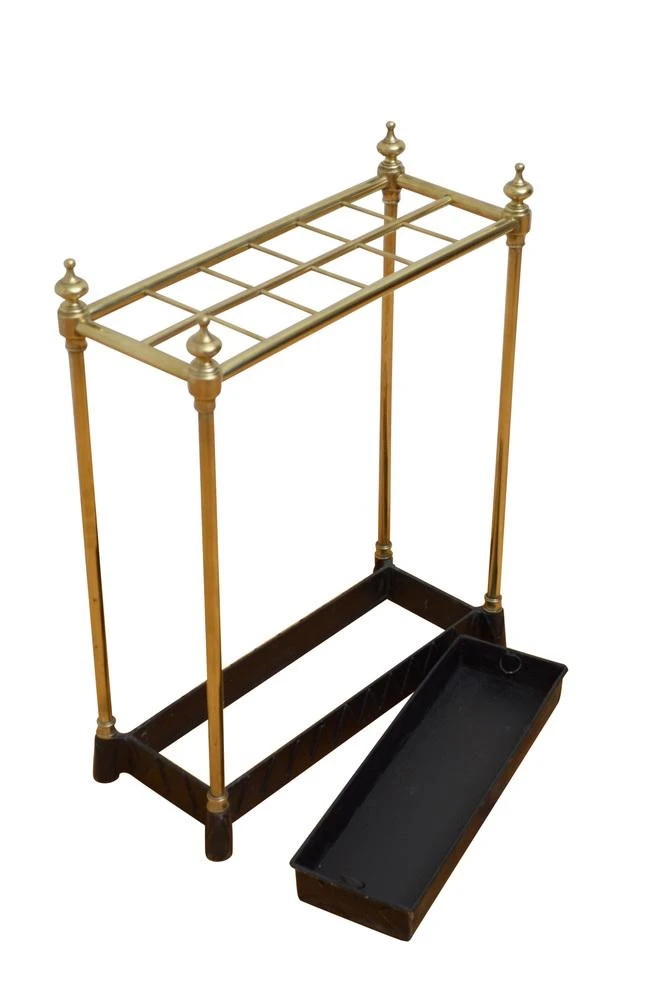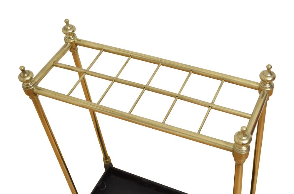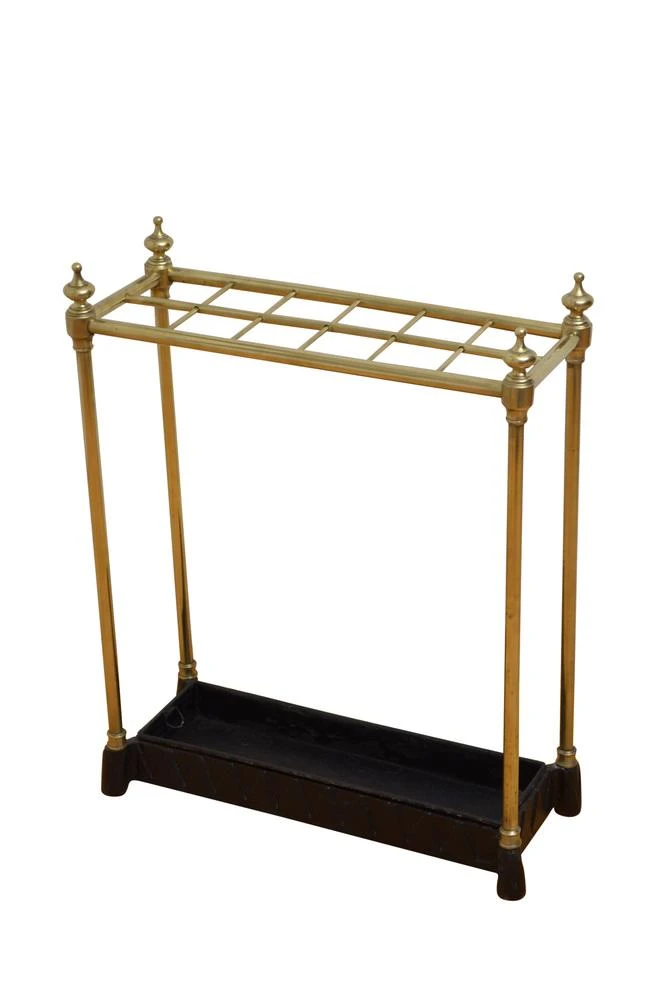 Victorian umbrella stand in brass having twelve umbrella or walking sticks divisions flanked by finials and cast iron drip tray …