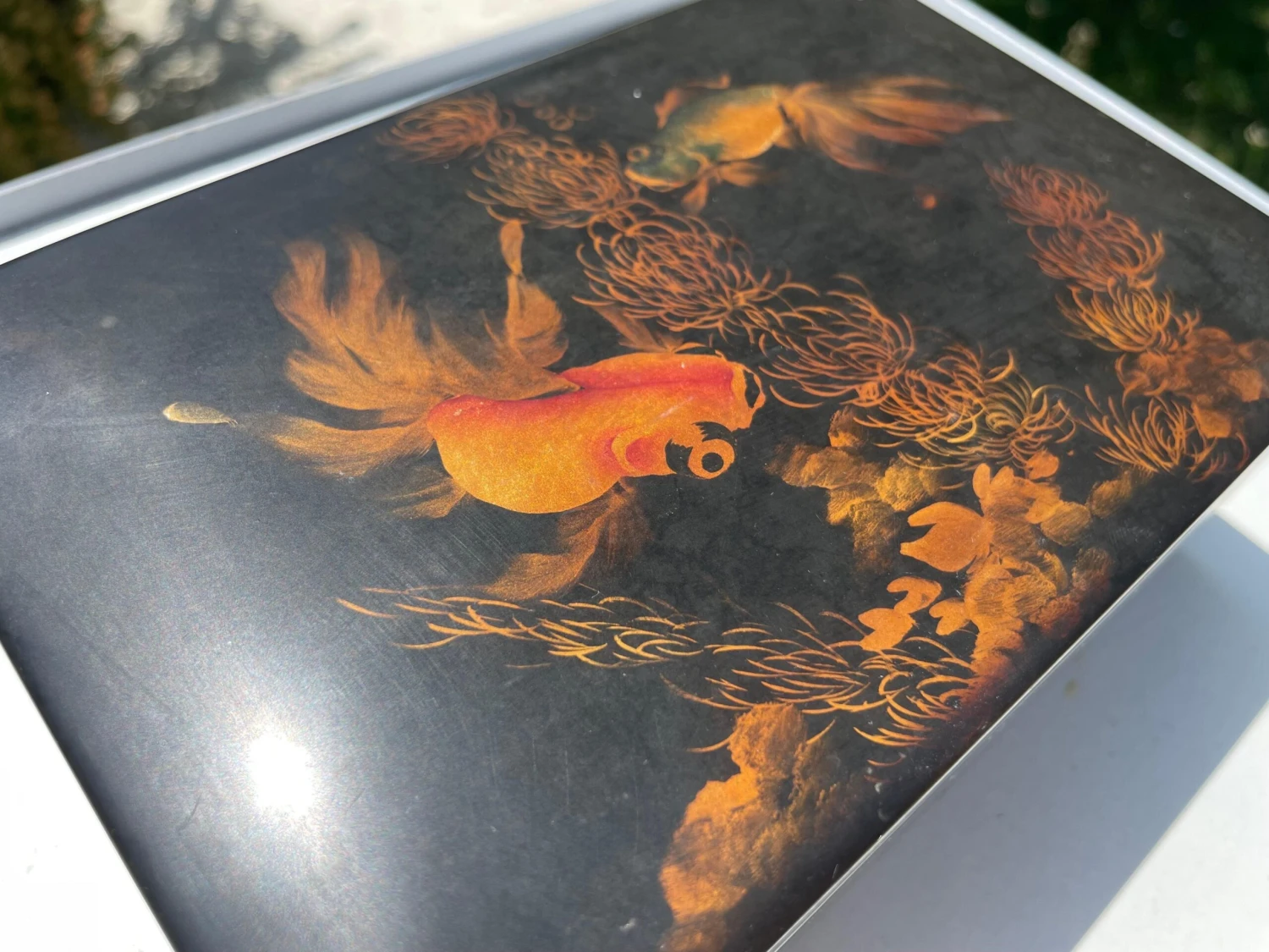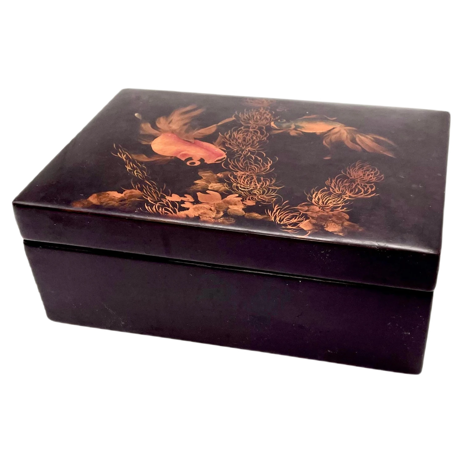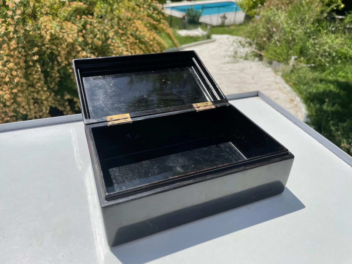 This box is in a black and Orange lacque. It has been made in Vietnam circa 1970. The decorative pattern is with fishes under the water. The hinges of the box are in brass.