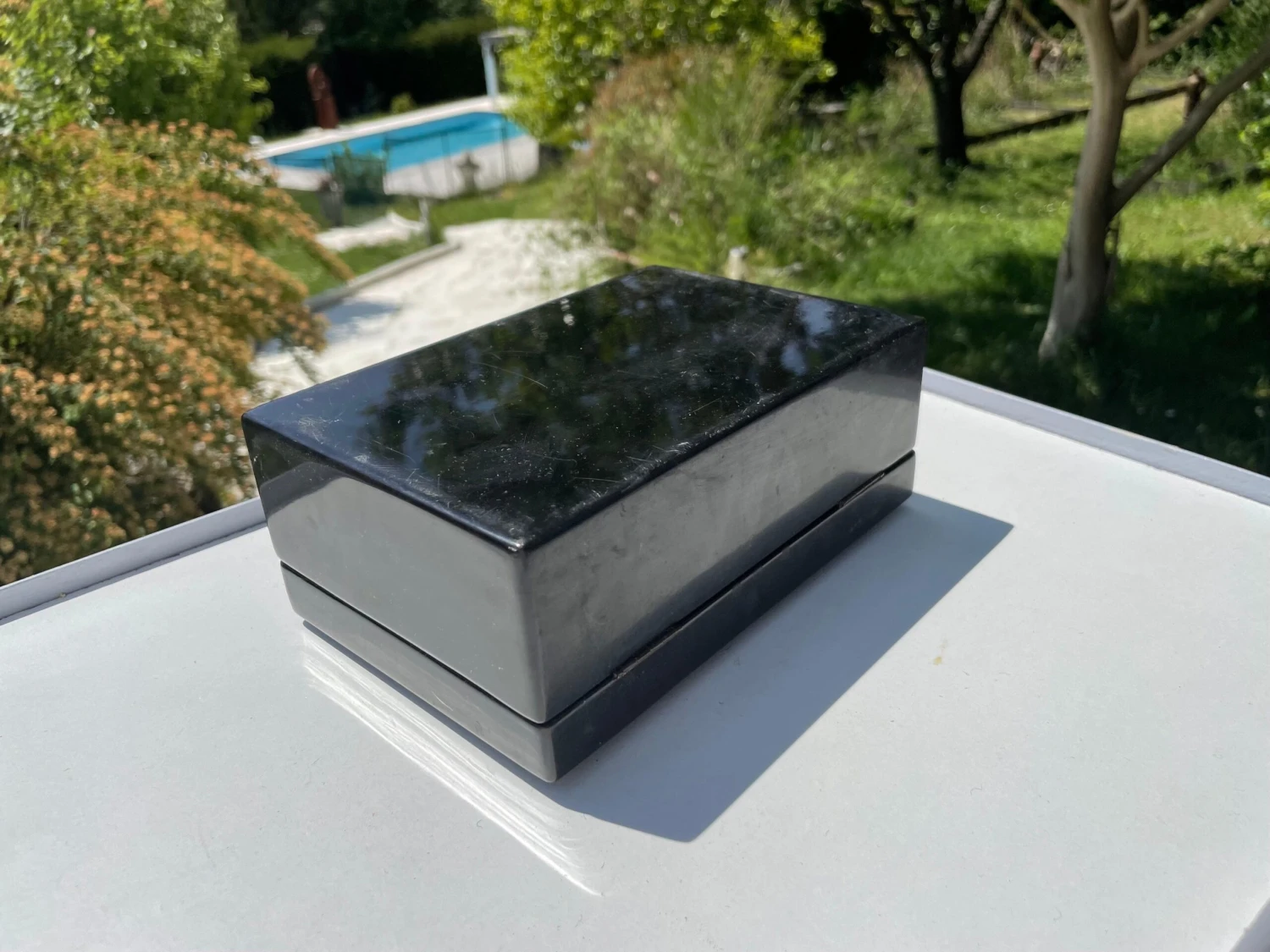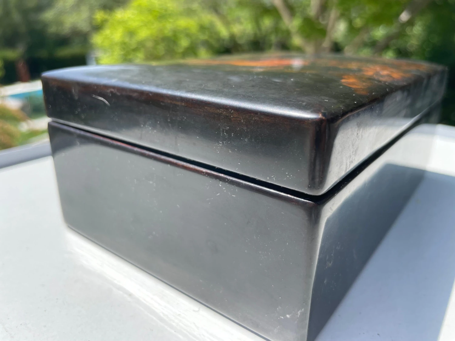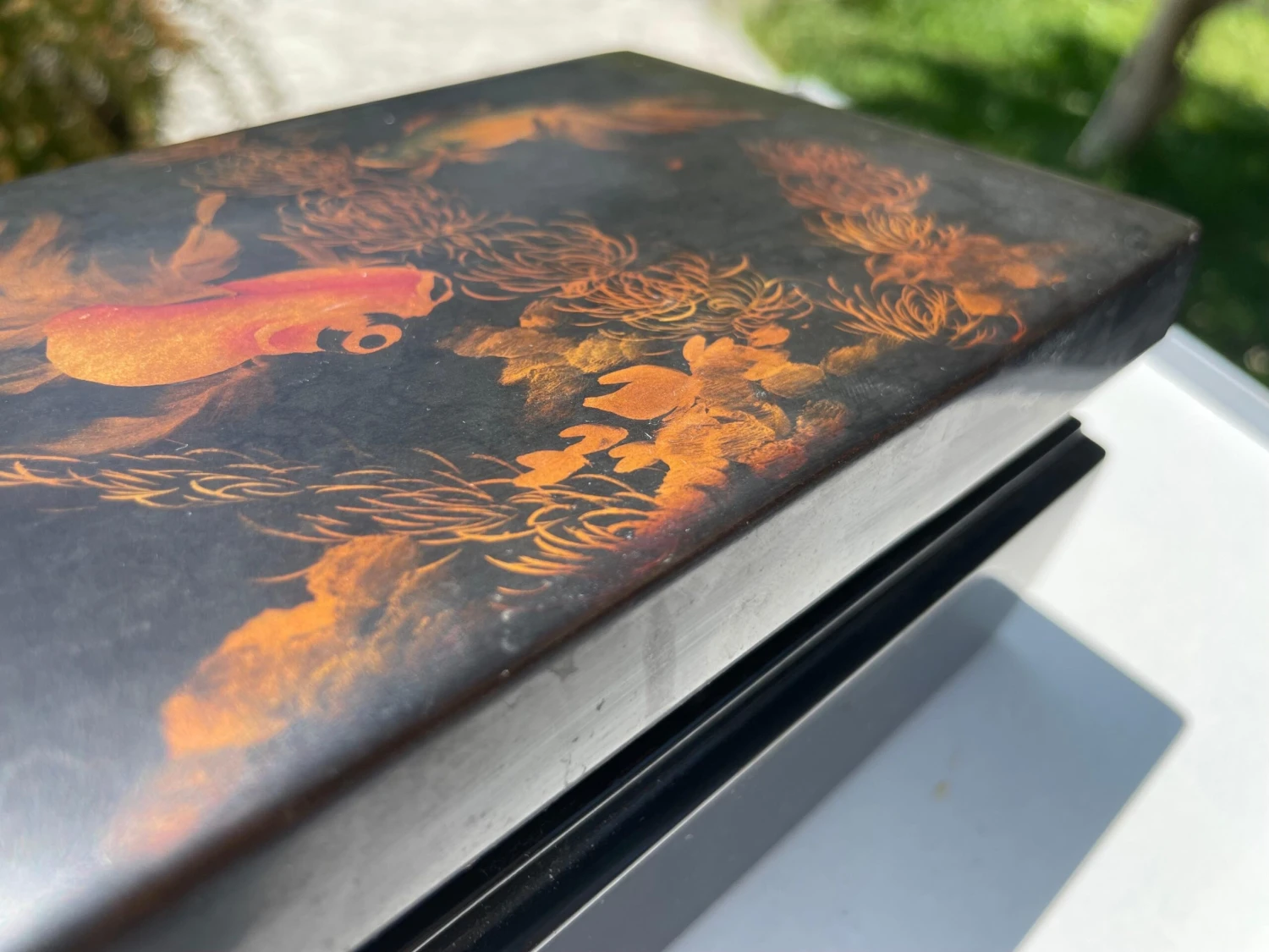 This box is in a black and Orange lacque. It has been made in Vietnam circa 1970. The decorative pattern is with fishes under the water. The hinges of the box are in brass.