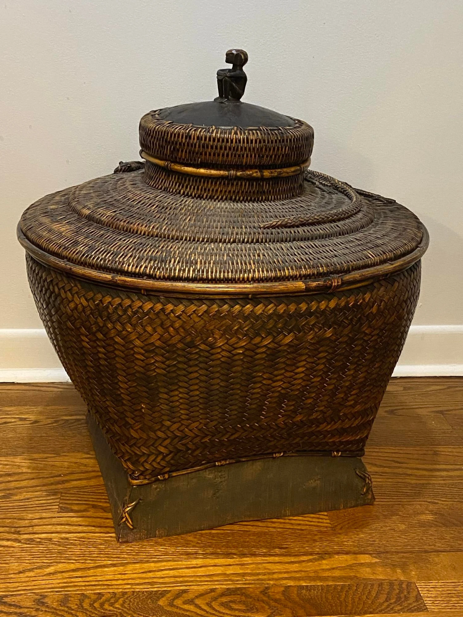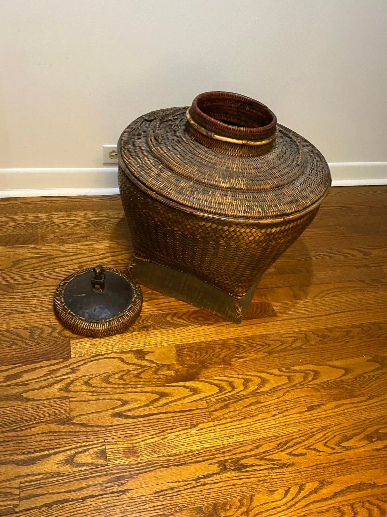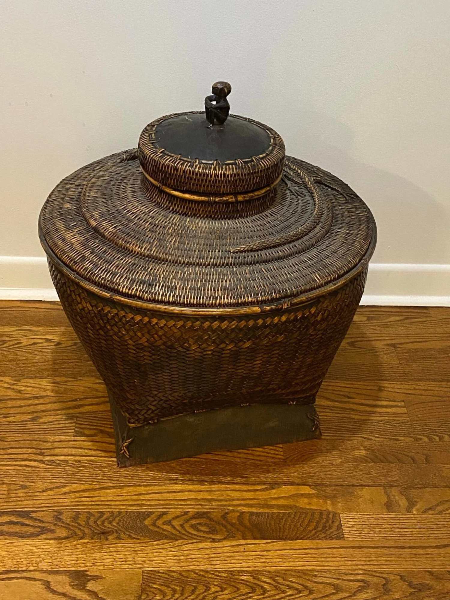 Vintage 19th Century Asian Woven Bamboo Rattan handwoven storage basket. Gorgeous rustic look. Lightweight yet very solid piece.