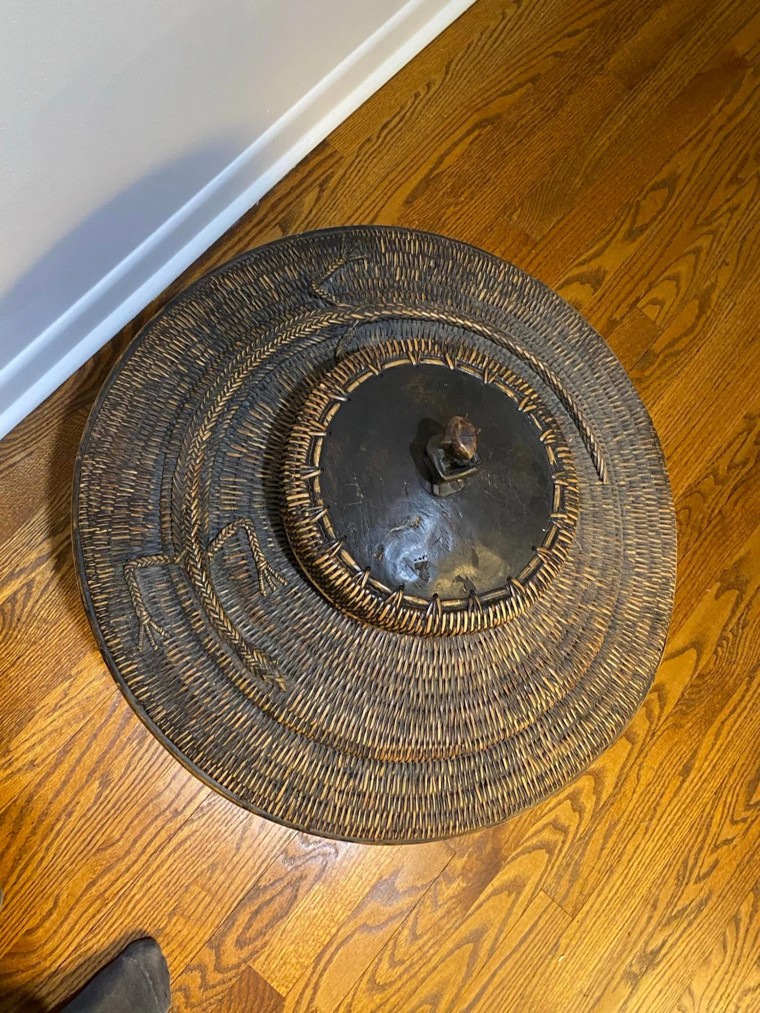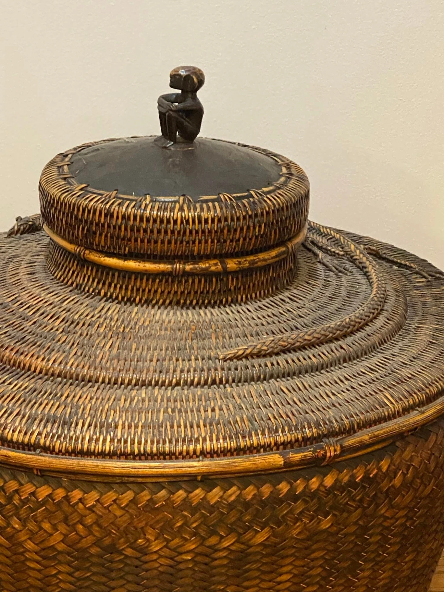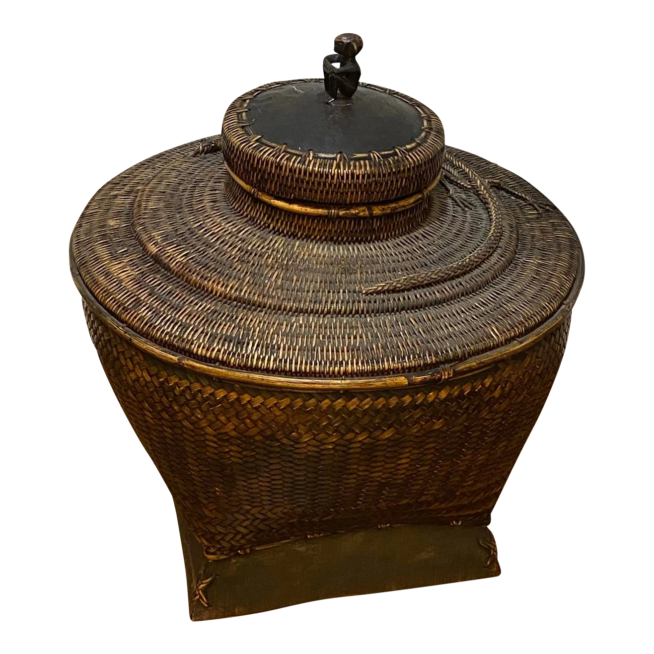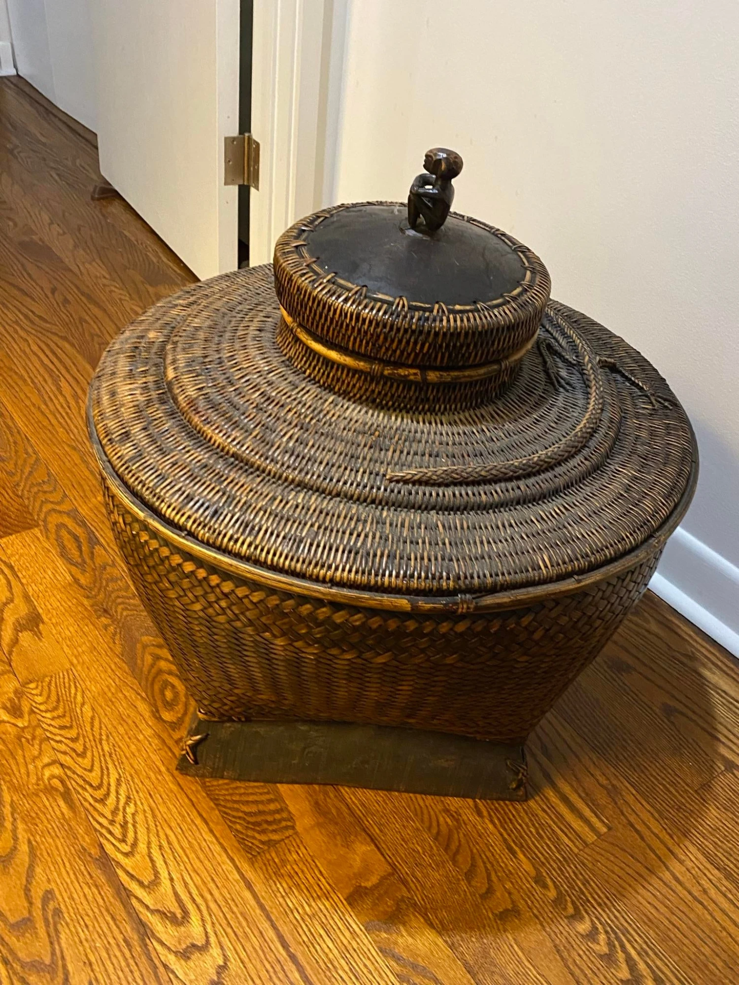 Vintage 19th Century Asian Woven Bamboo Rattan handwoven storage basket. Gorgeous rustic look. Lightweight yet very solid piece.