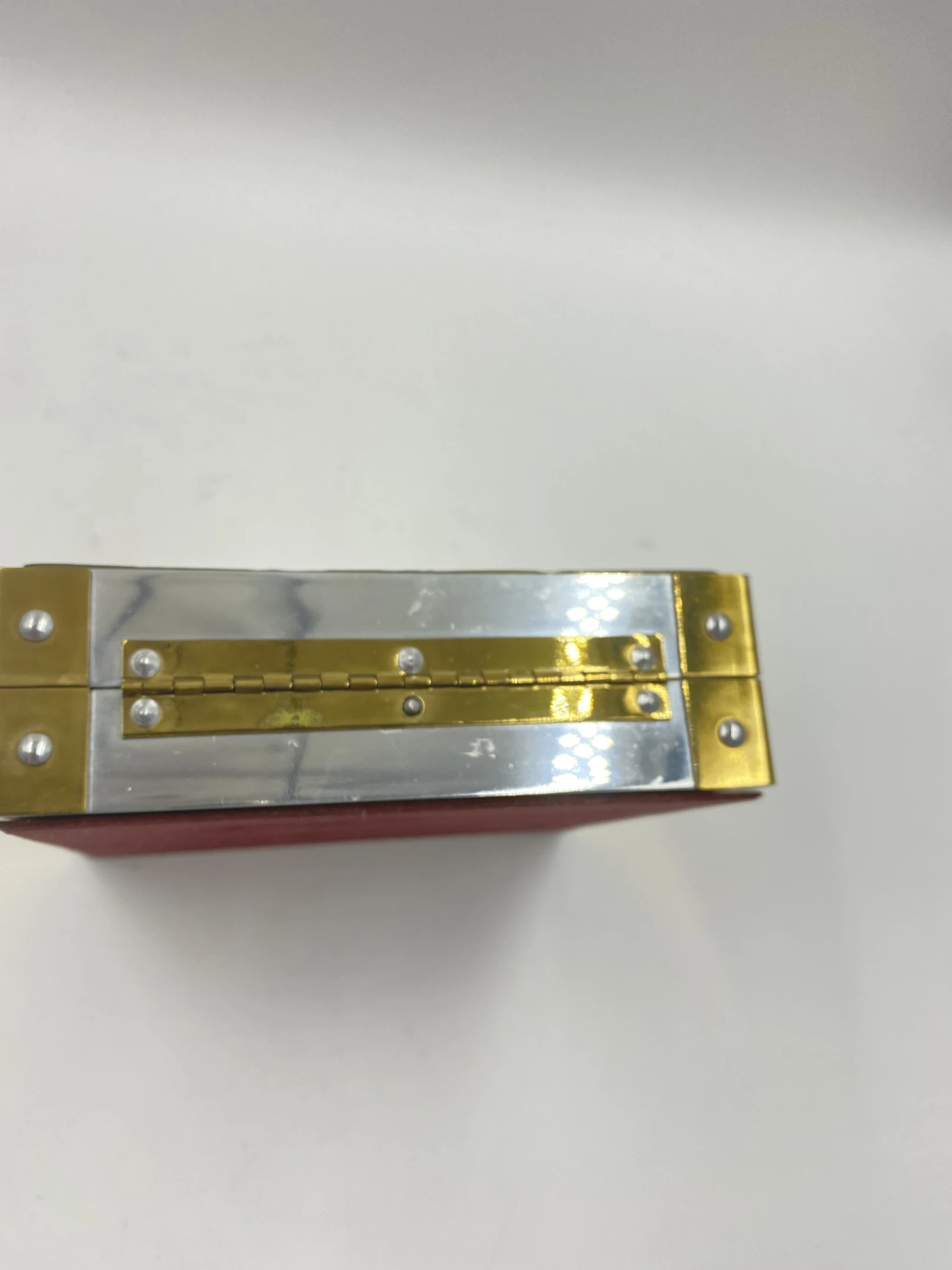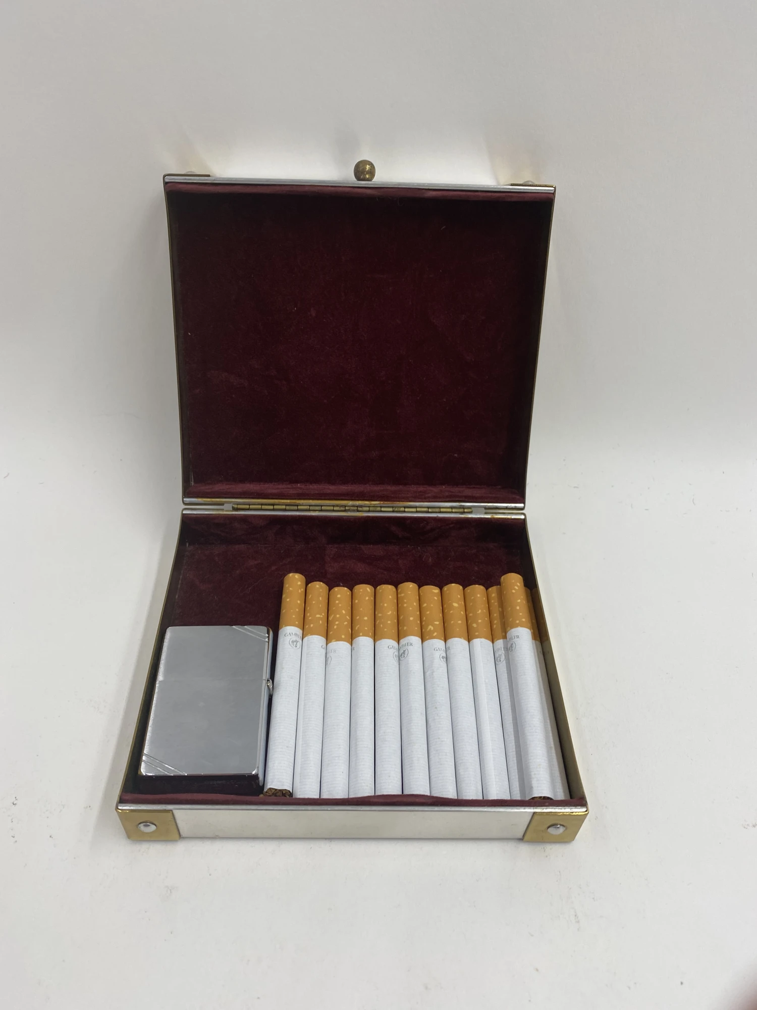 Brass Plated valet box or cigarette box for tabletop or dresser. Has hinged top & burgundy velvet lined interior and bottom. Cigarettes and lighter used for illustration purposes only.