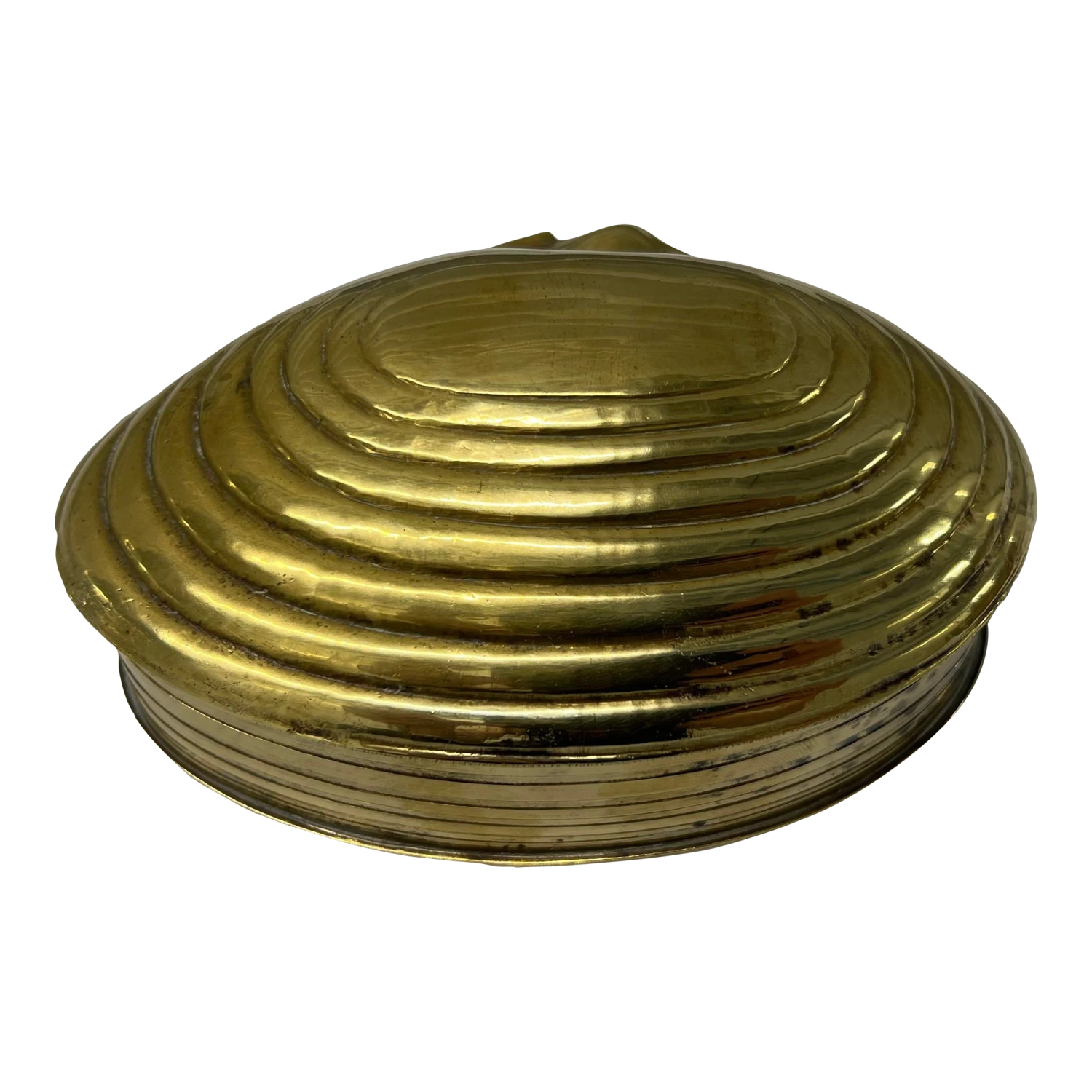 Vintage hinged brass shell trinket or jewelry box in the shape of a clamshell.