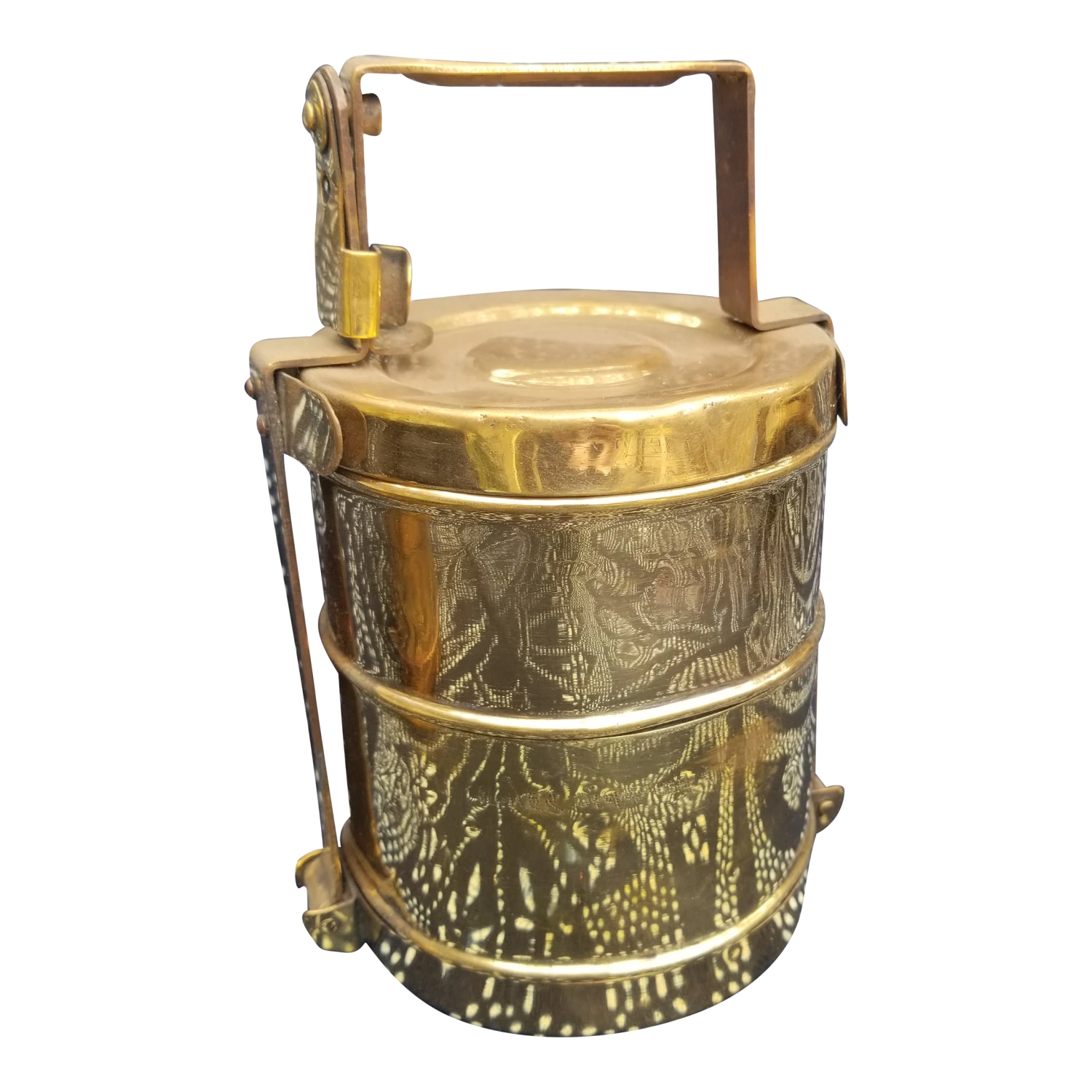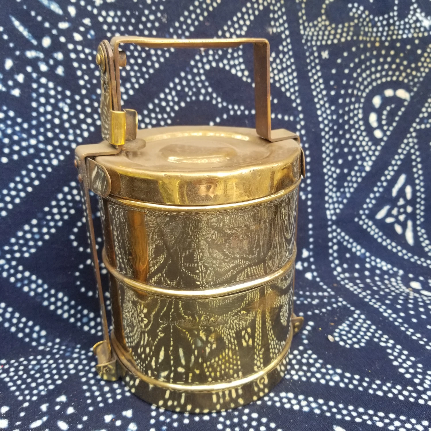 An original old Indian tiffin lunch box. Totally useable or great for display. Really fine quality. Ech box stacks on top of each other.