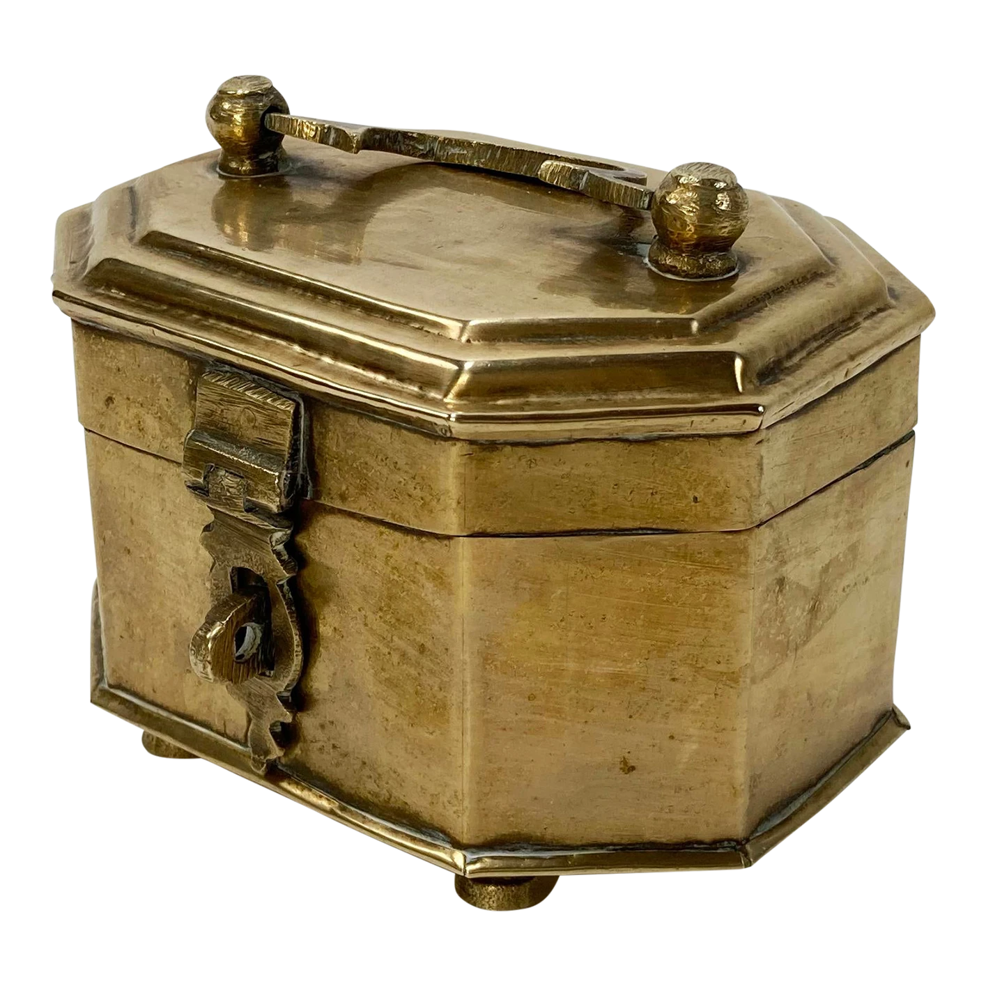 Vintage decorative hinged lid brass trinket box with front clasp and handle. Very similar look to traditional “cricket boxes” but without the piercings.