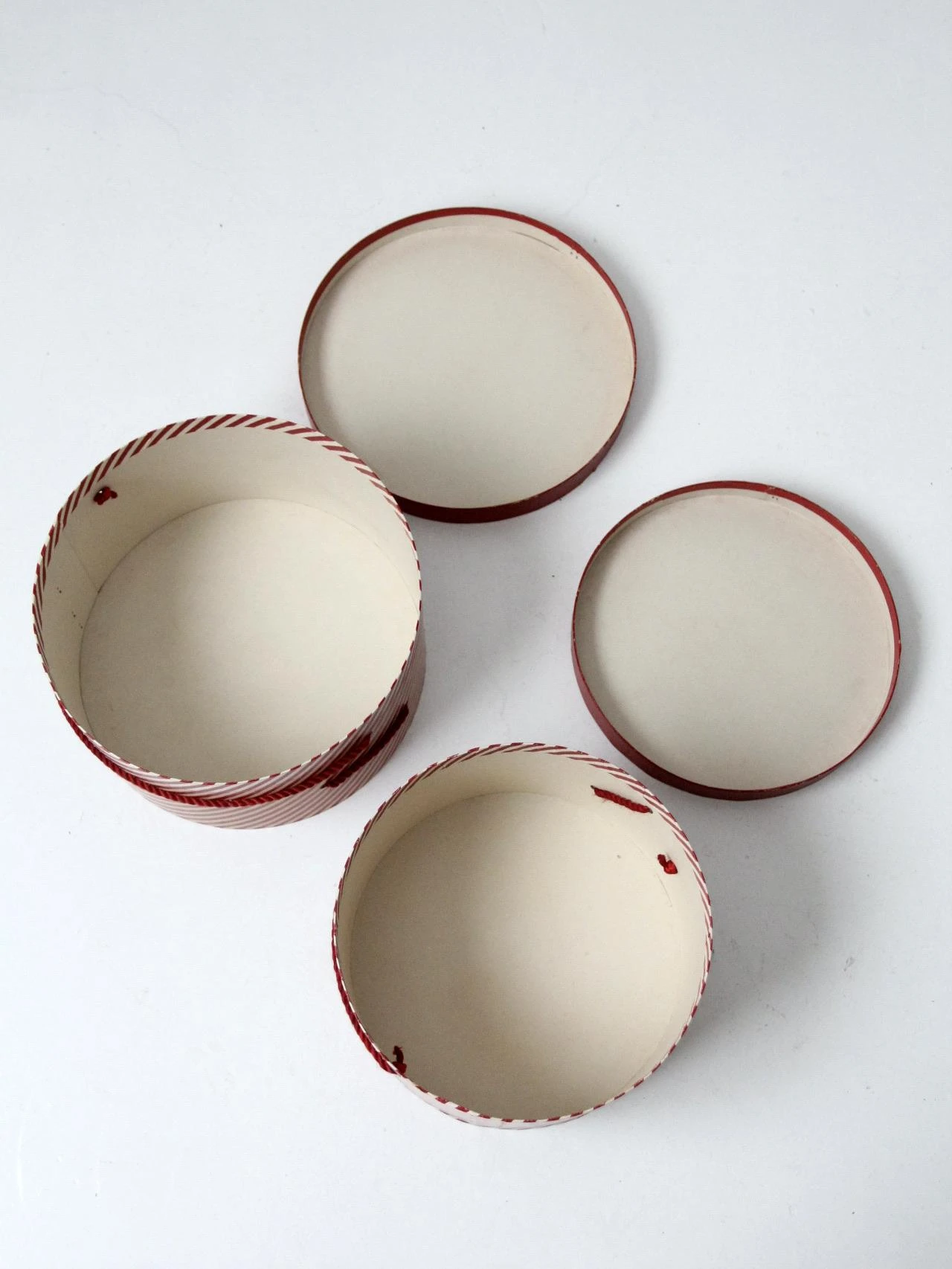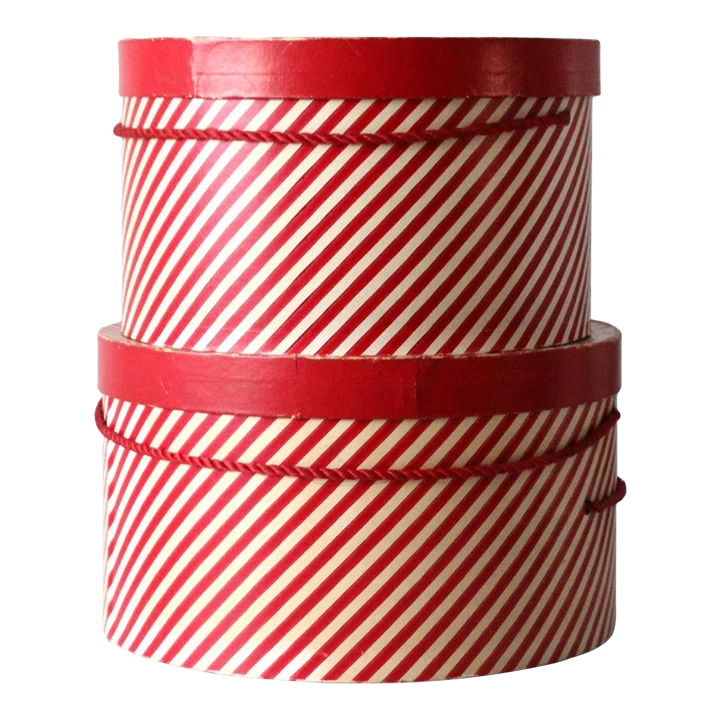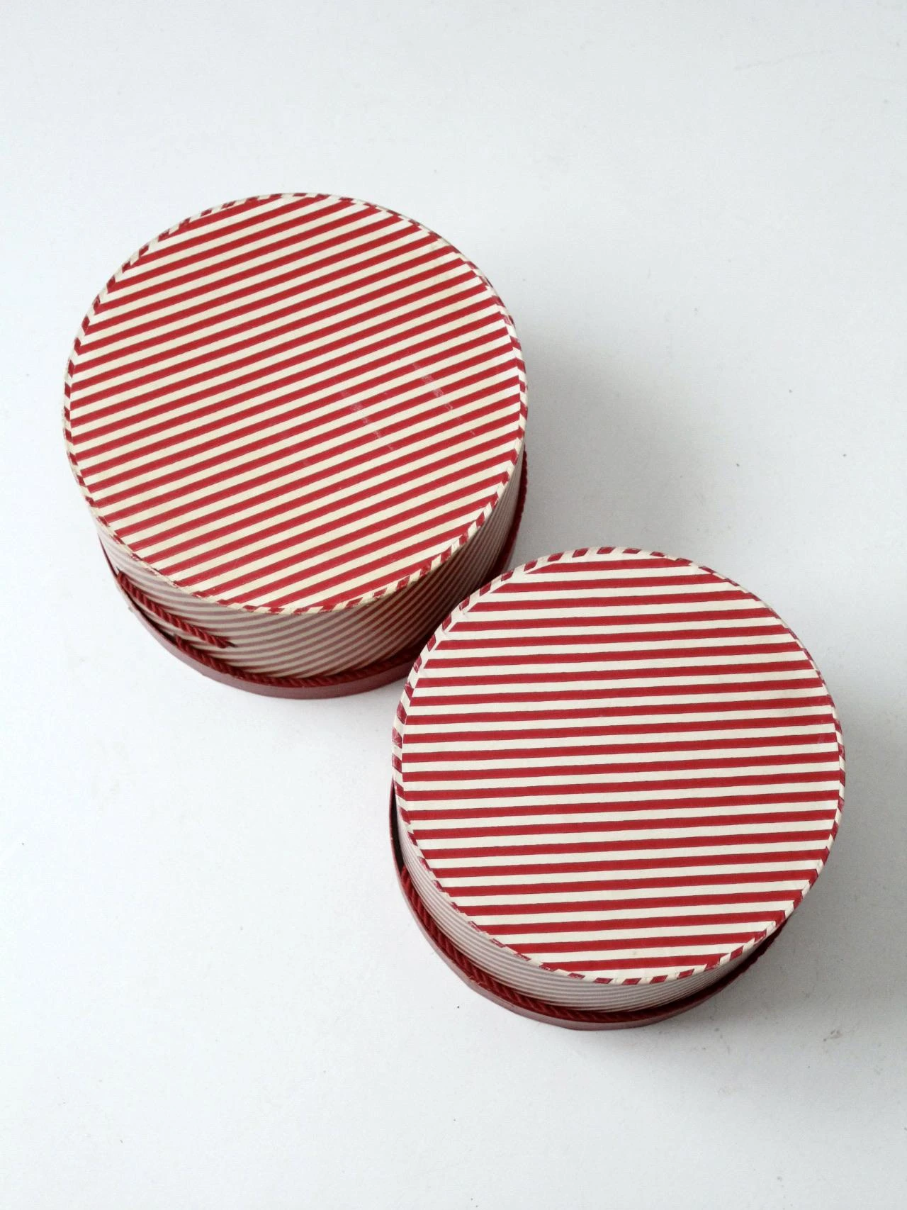 This is a pair of vintage hat boxes. Red and white “candy cane” striped paper colors the round hat boxes. They have red woven ribbon handles.