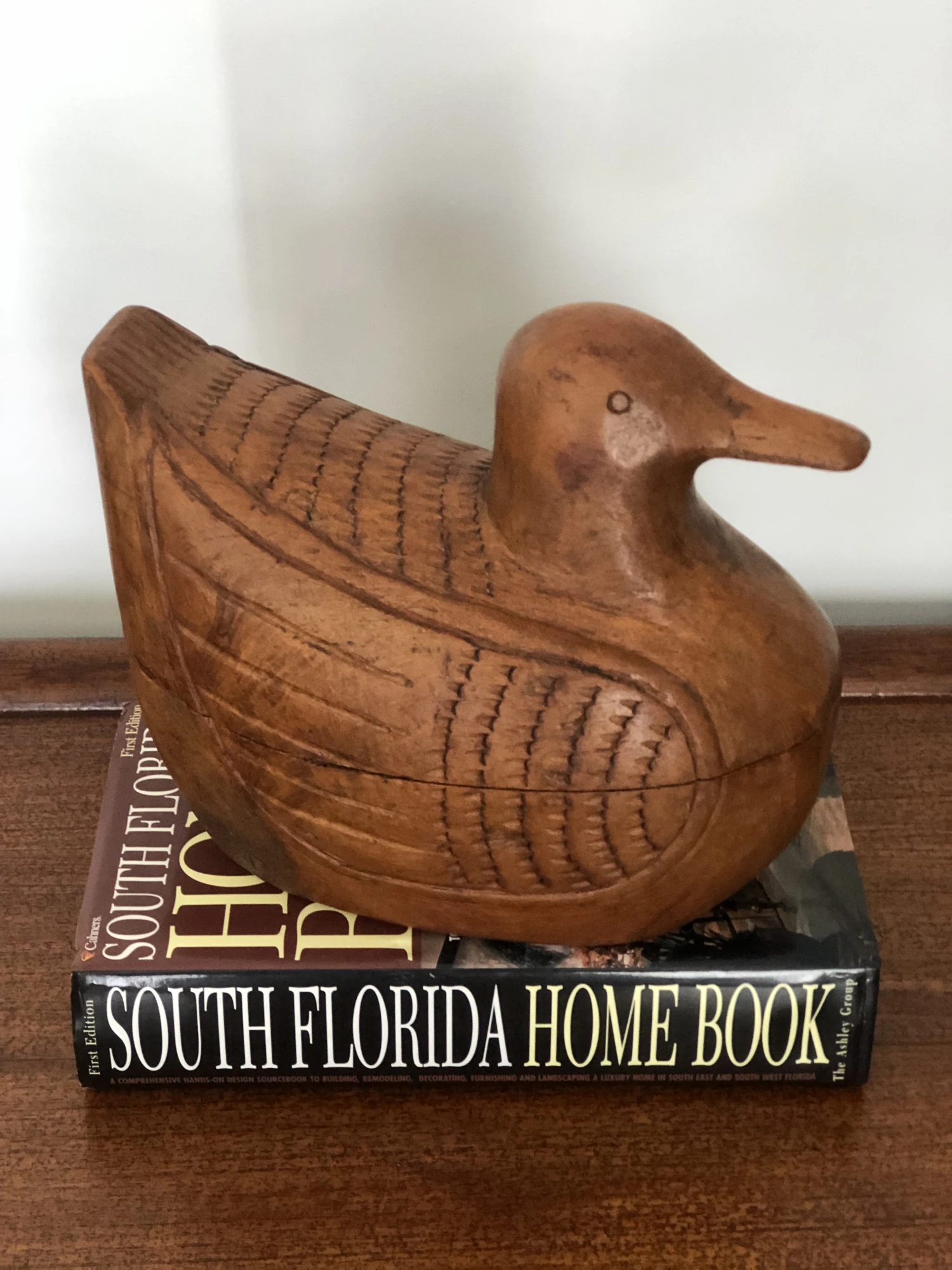 Beautiful wood duck handcrafted box a perfect addition on a console or with books.