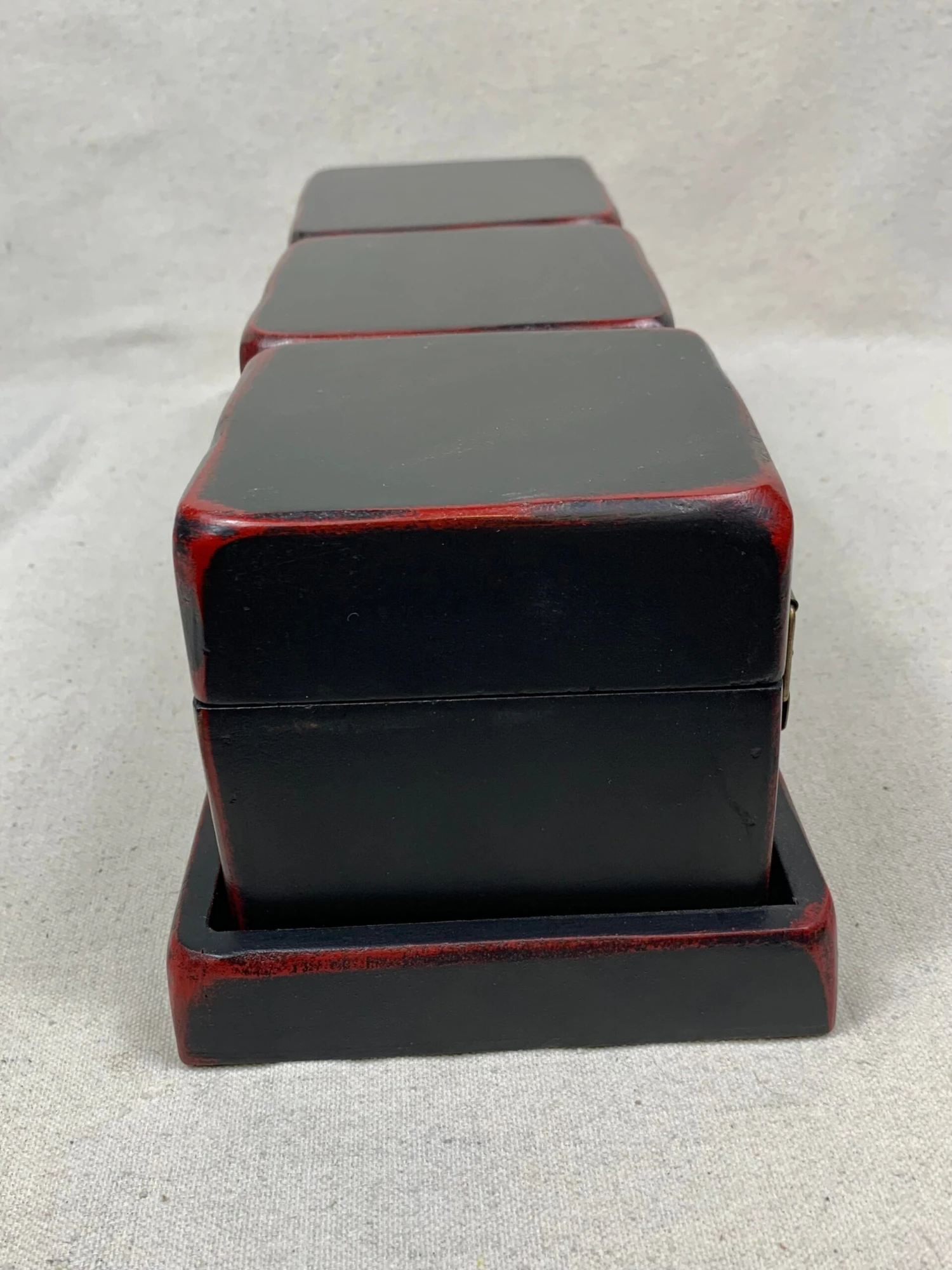 Lovely chinoiserie style box set. Features three boxes that fit into a tray. Four pieces total. Boxes are made of wood and are black with red edging. Perfect to use in an office, for jewelry or even in a bathroom for storage. Look unused!!! Box dimensions: 4.75”w x 4.75”d x 5”h. Tray dimensions: 15.25”w x 5.25”d x 1.25”h. These are pre-owned items so please see all pictures and ask any questions.