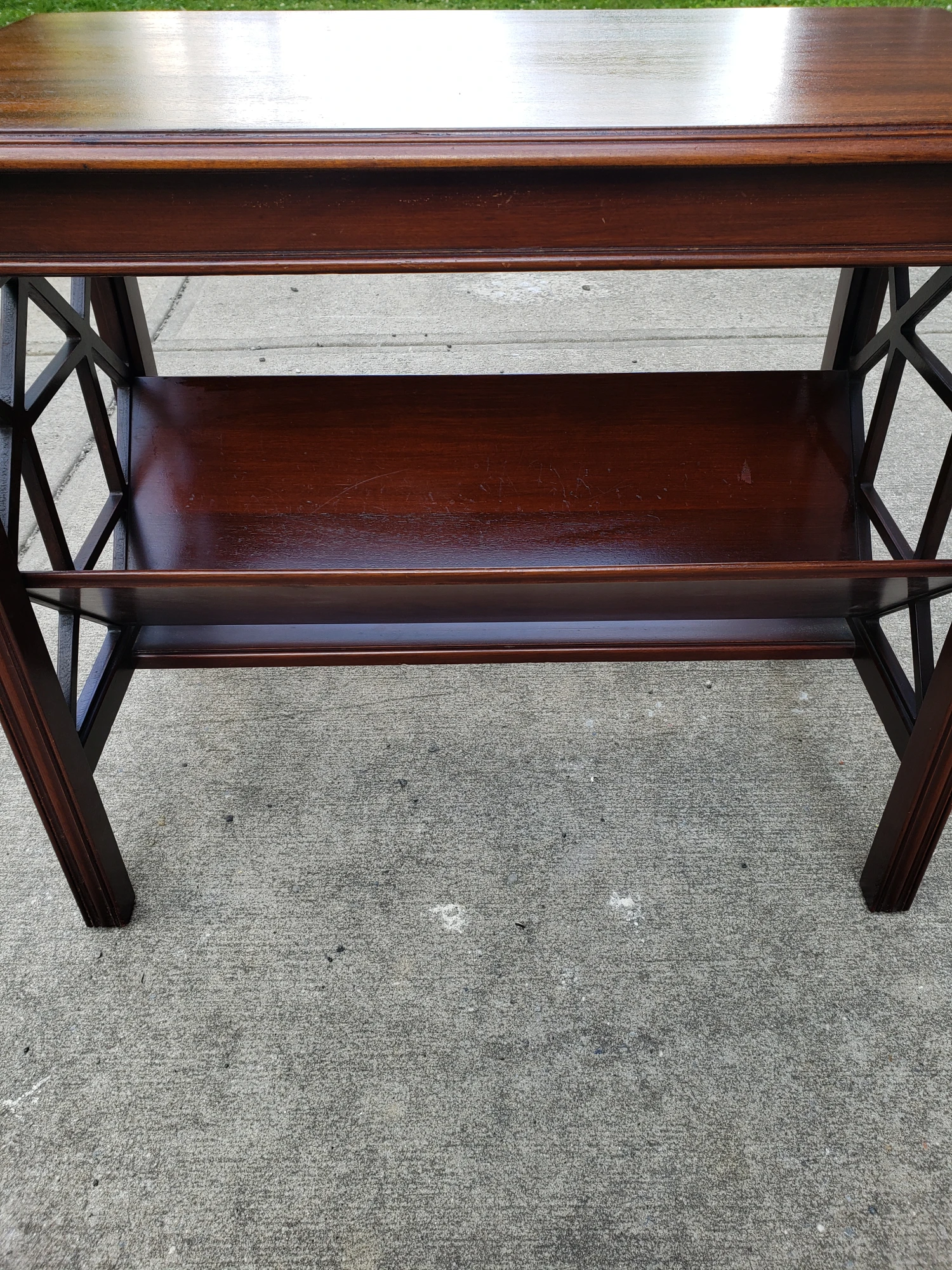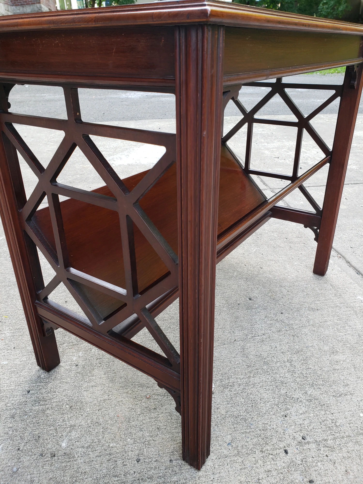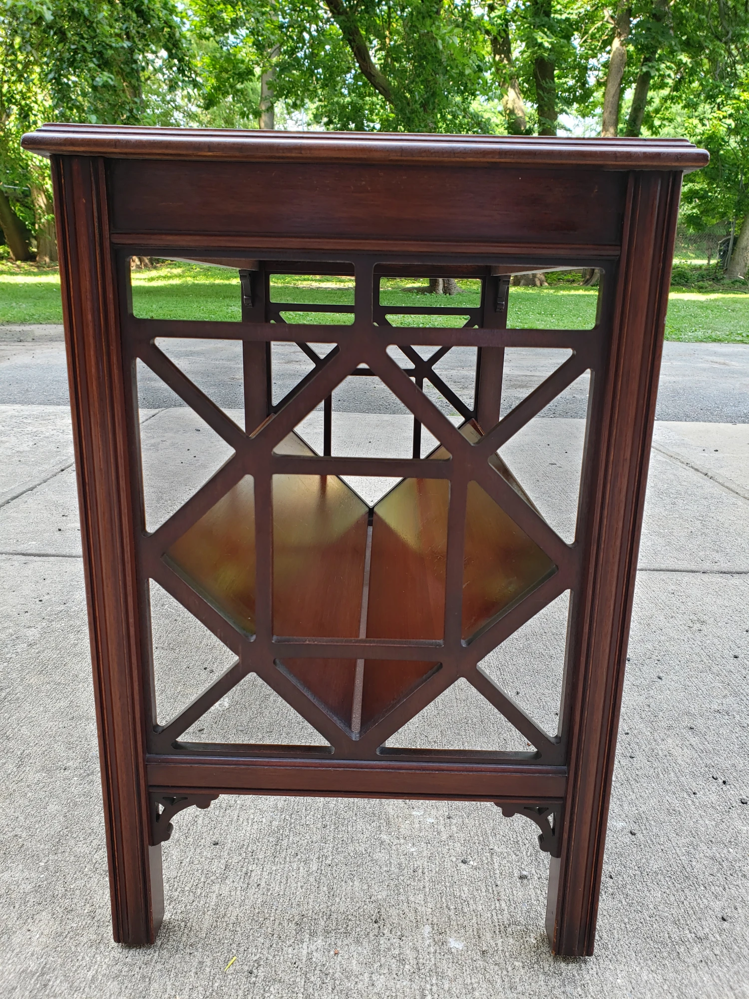 Offering a vintage mahagony Chippendale Style book mahagony rack with occasional table.