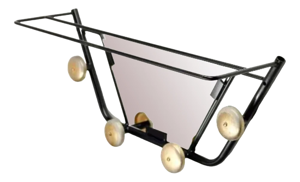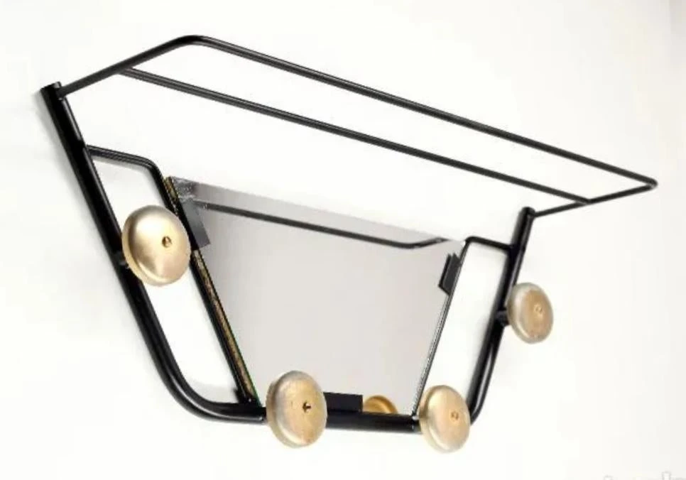 Nice wall percher with mirror, made of black metal, with 4 golden hangers. Manufactured in France in the 50s.