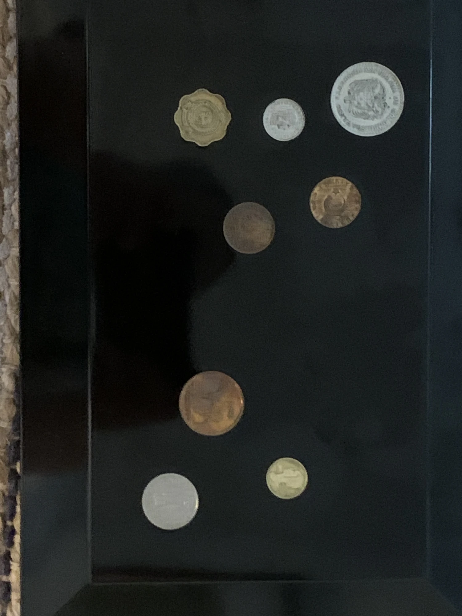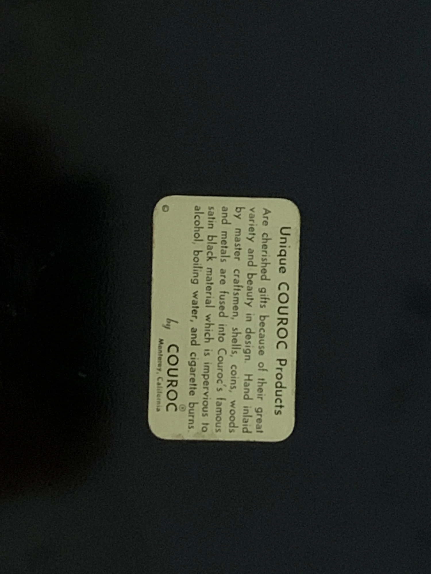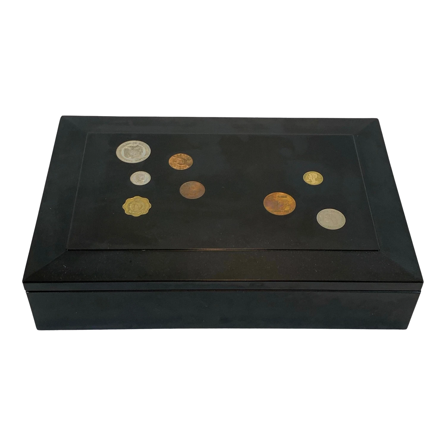 Chic vintage box by Couroc of Monterey inlaid coins on black resin.