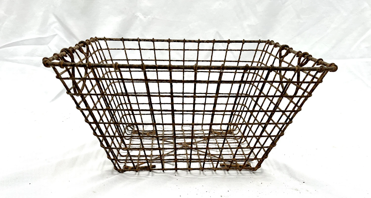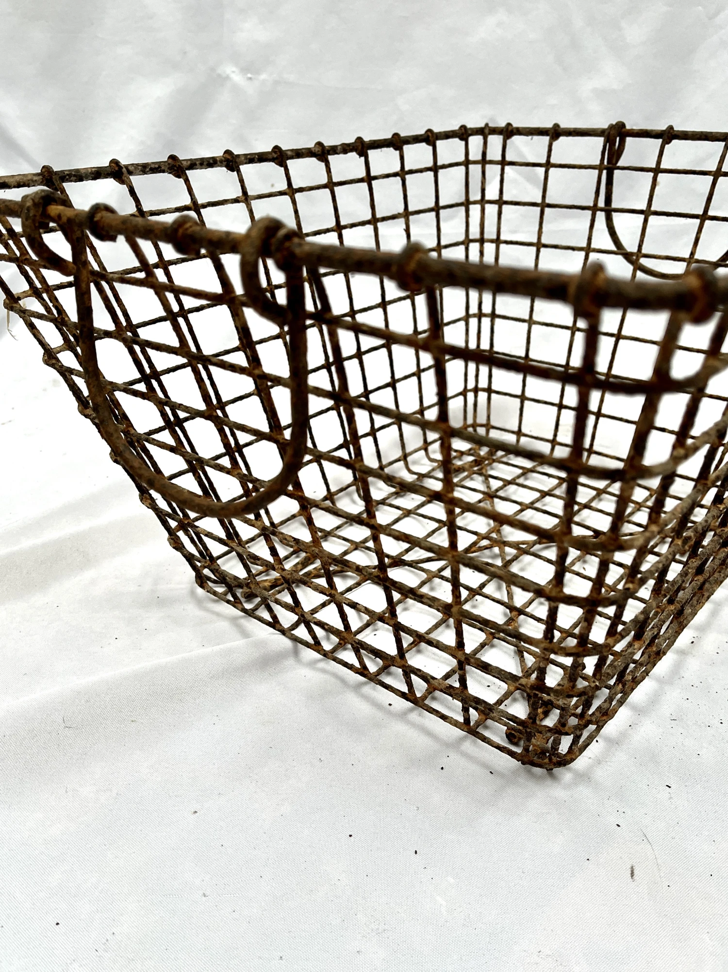 Early 1900s French metal wire oyster basket. Stackable with folding handles at each end. Originally created to grow oysters in the sea beds off the coast of France. Circa 1920s – 1930s featuring an aged weathered patina.