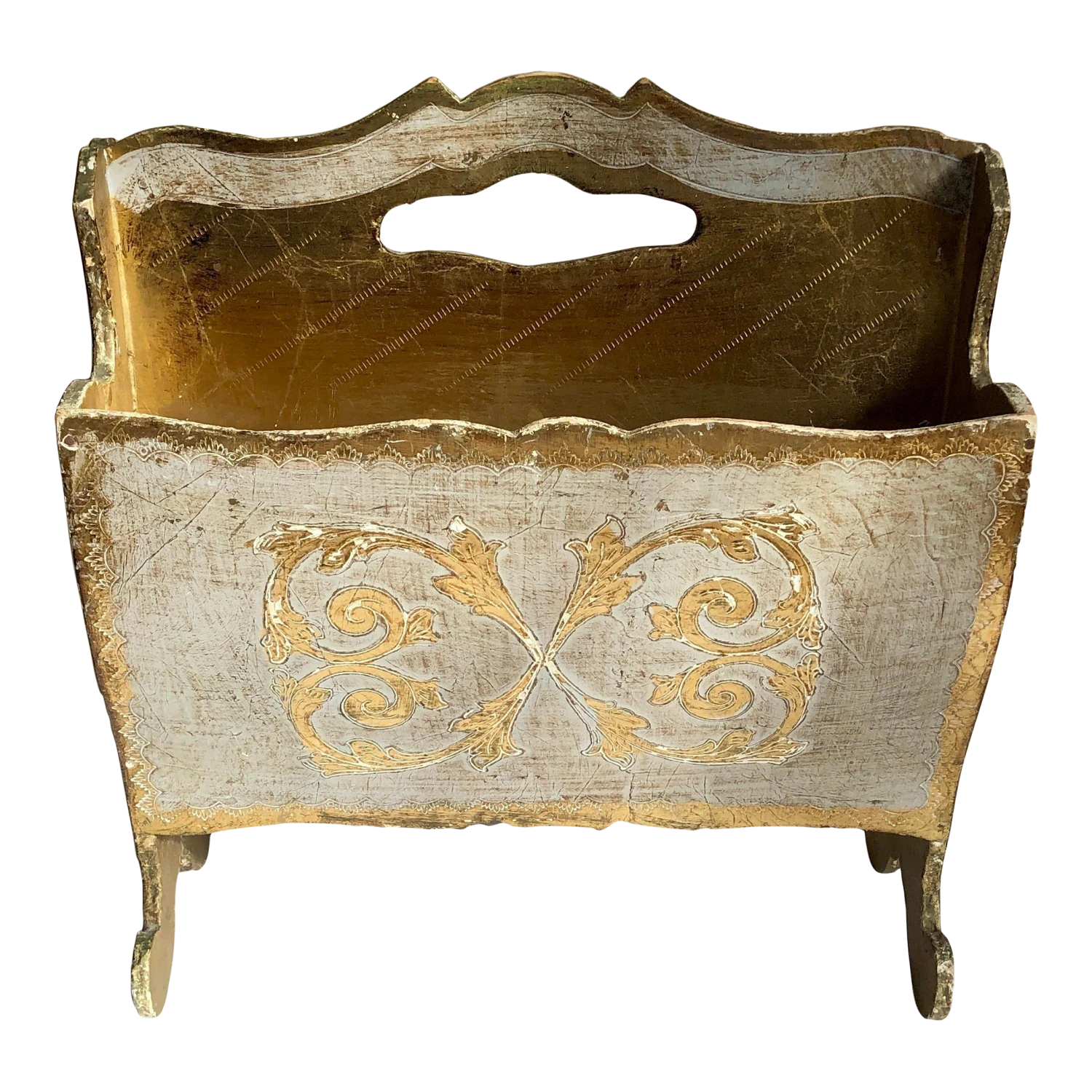 Vintage Florentine Italian gilt wood and lacquer magazine rack.