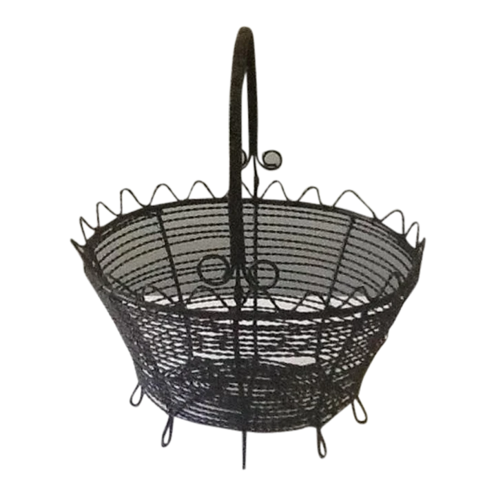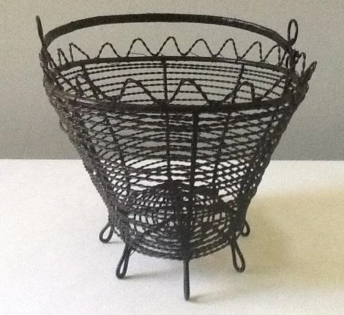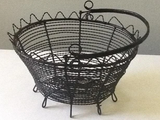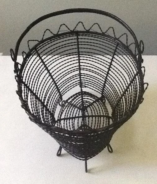 While this beautiful basket is obviously old and ornate, it is very well-made of black, heavy gauge wire. Very versatile, this vintage piece is a perfect meld of decorative display and organizational object in any space of your home, indoors or outdoors. For instance, It would look great in a bathroom filled with towels, or on a porch or patio filled with plants or even fresh flowers. Hm-m — what about using it as an egg or fruit basket in a kitchen or dining area?