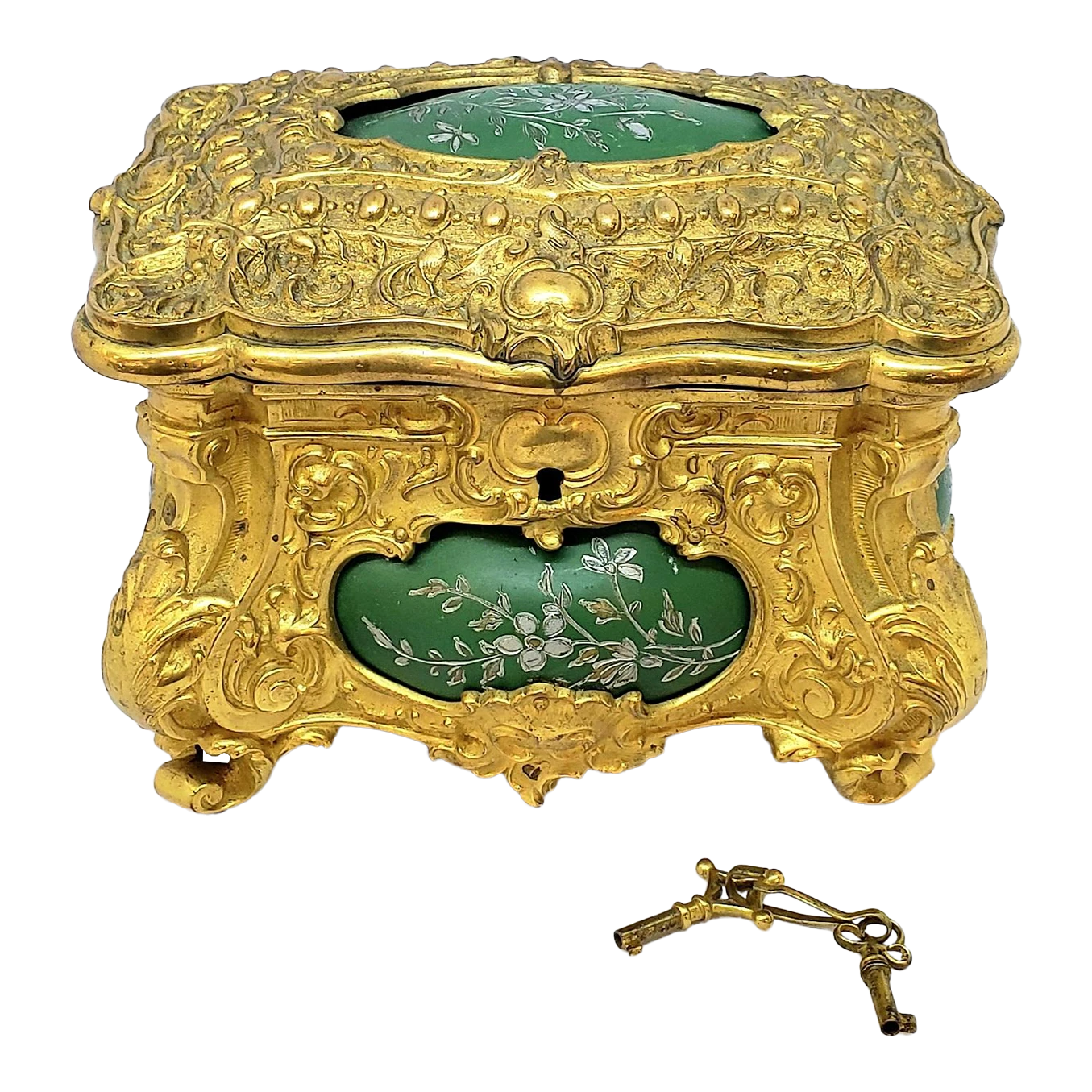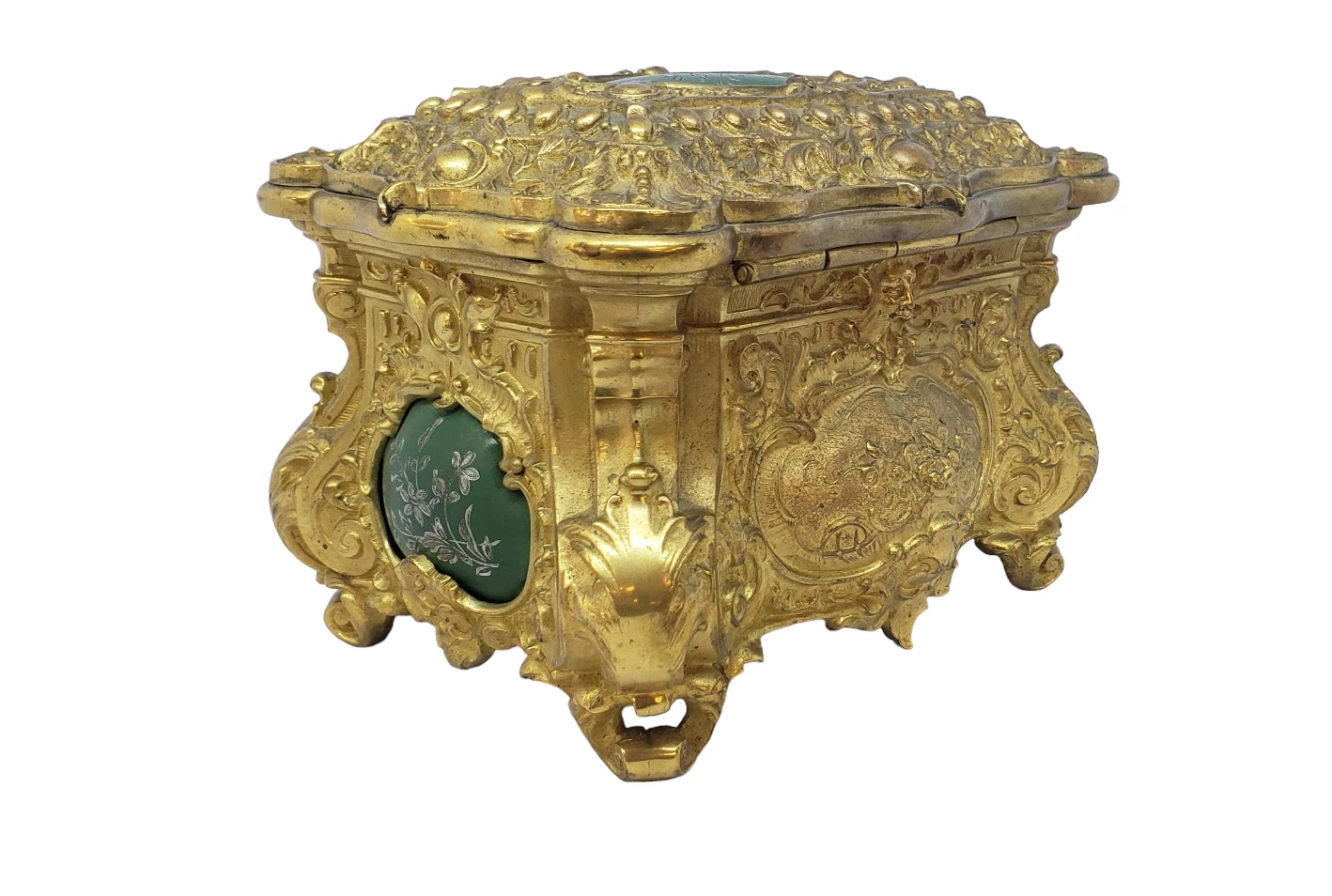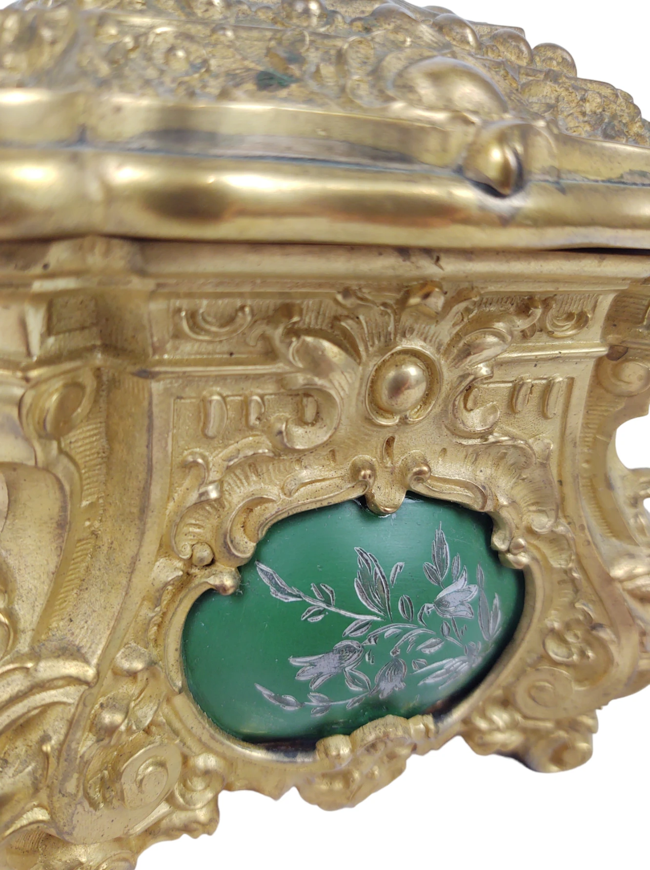 Beautiful French Gilt Bronze Dore box. The box features a hinged cover, with a working lock and two keys included. The inside is lined in purple velvet; the outside is ornately decorated with scrolling foliage and embellished with four resin inlays in olive green that are etched with flowers.