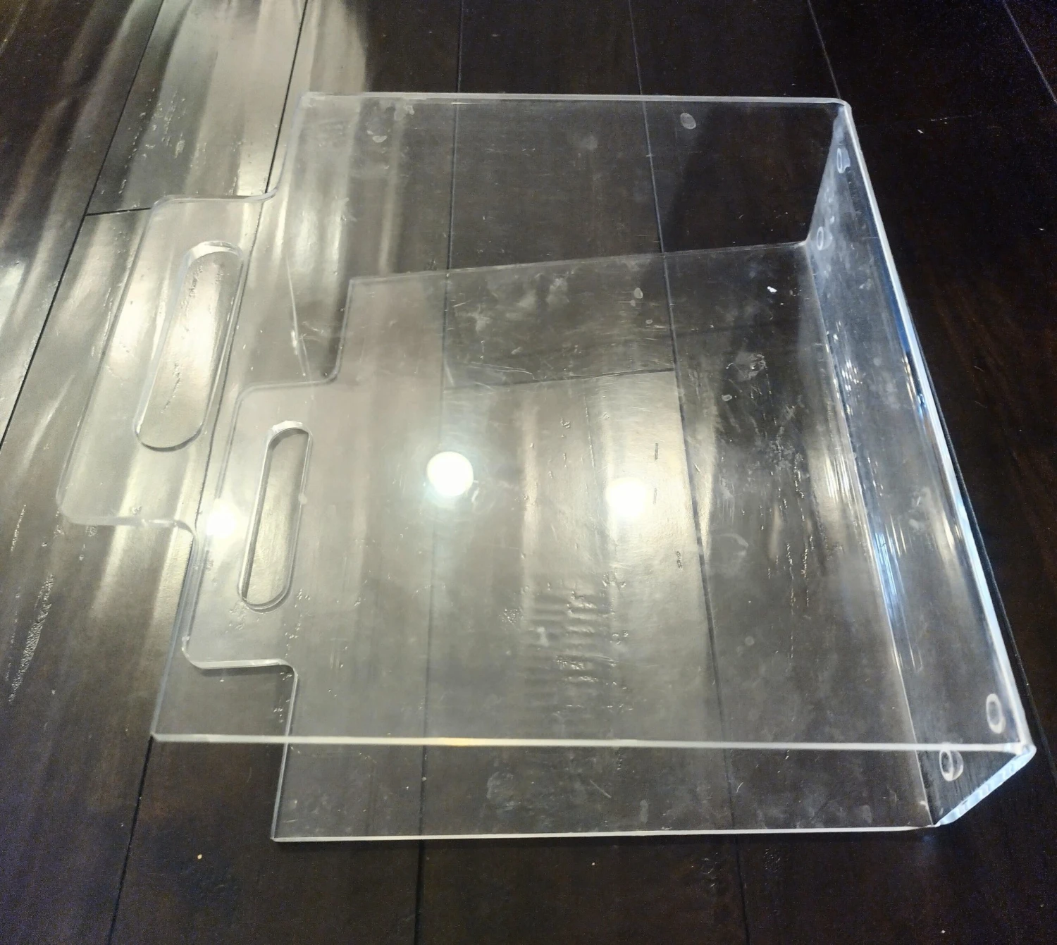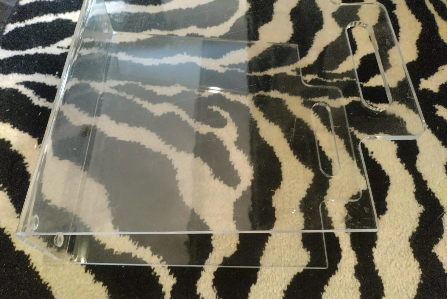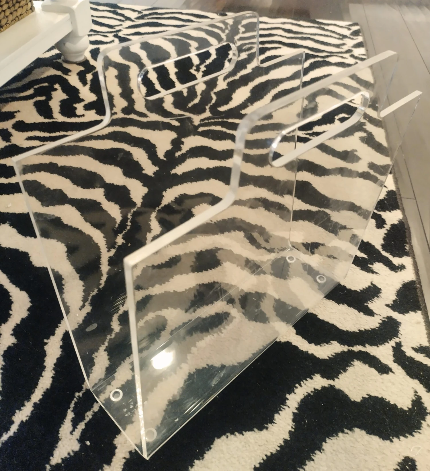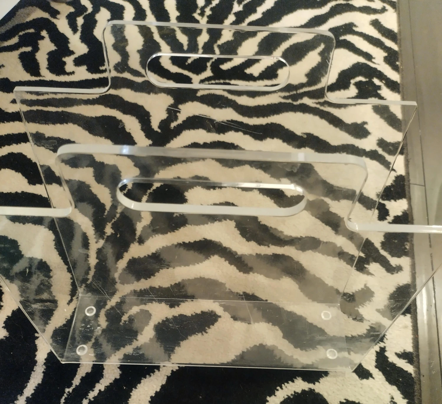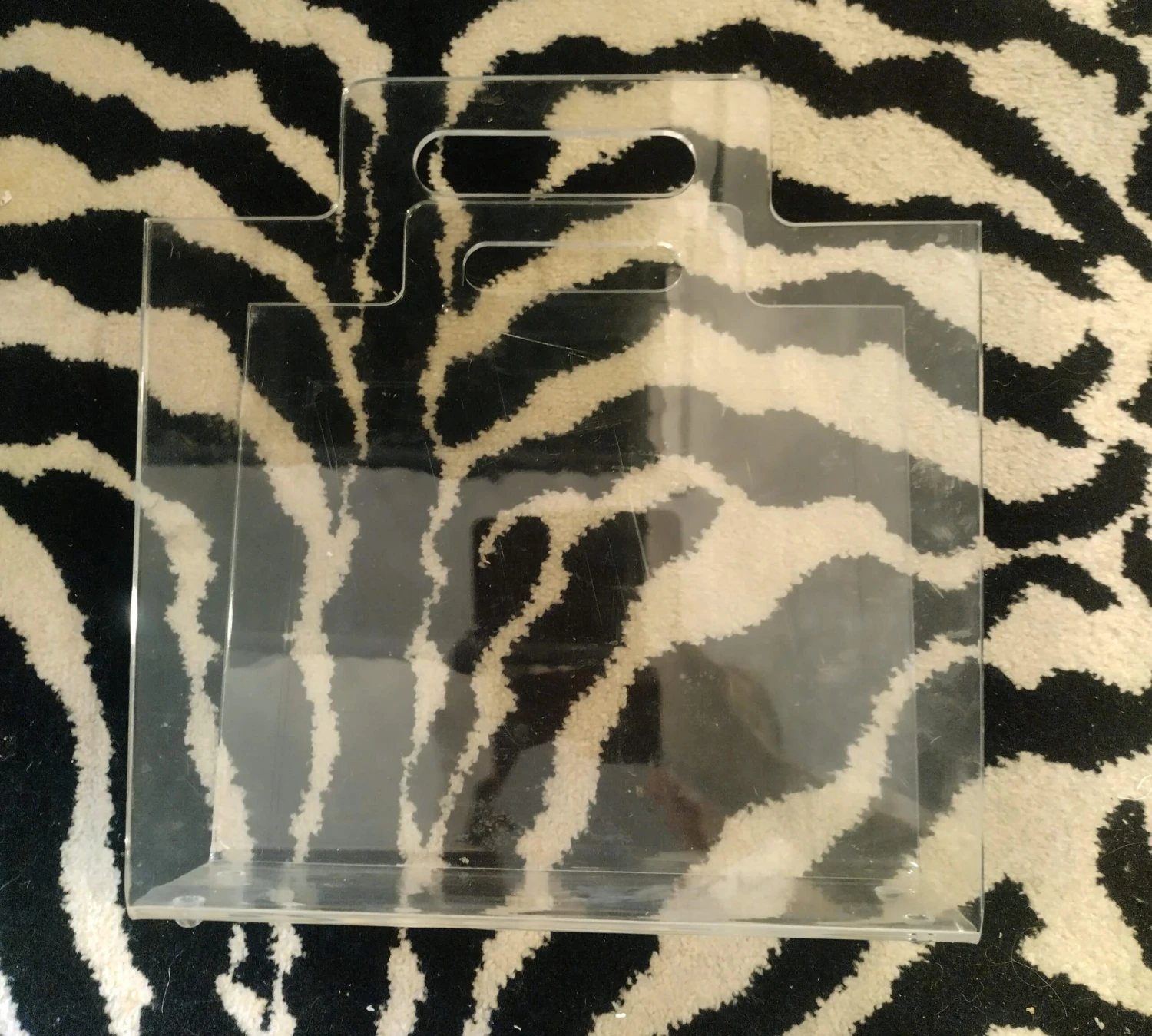 A vintage lucite magazine stand with simple lines and tiny ball feet.