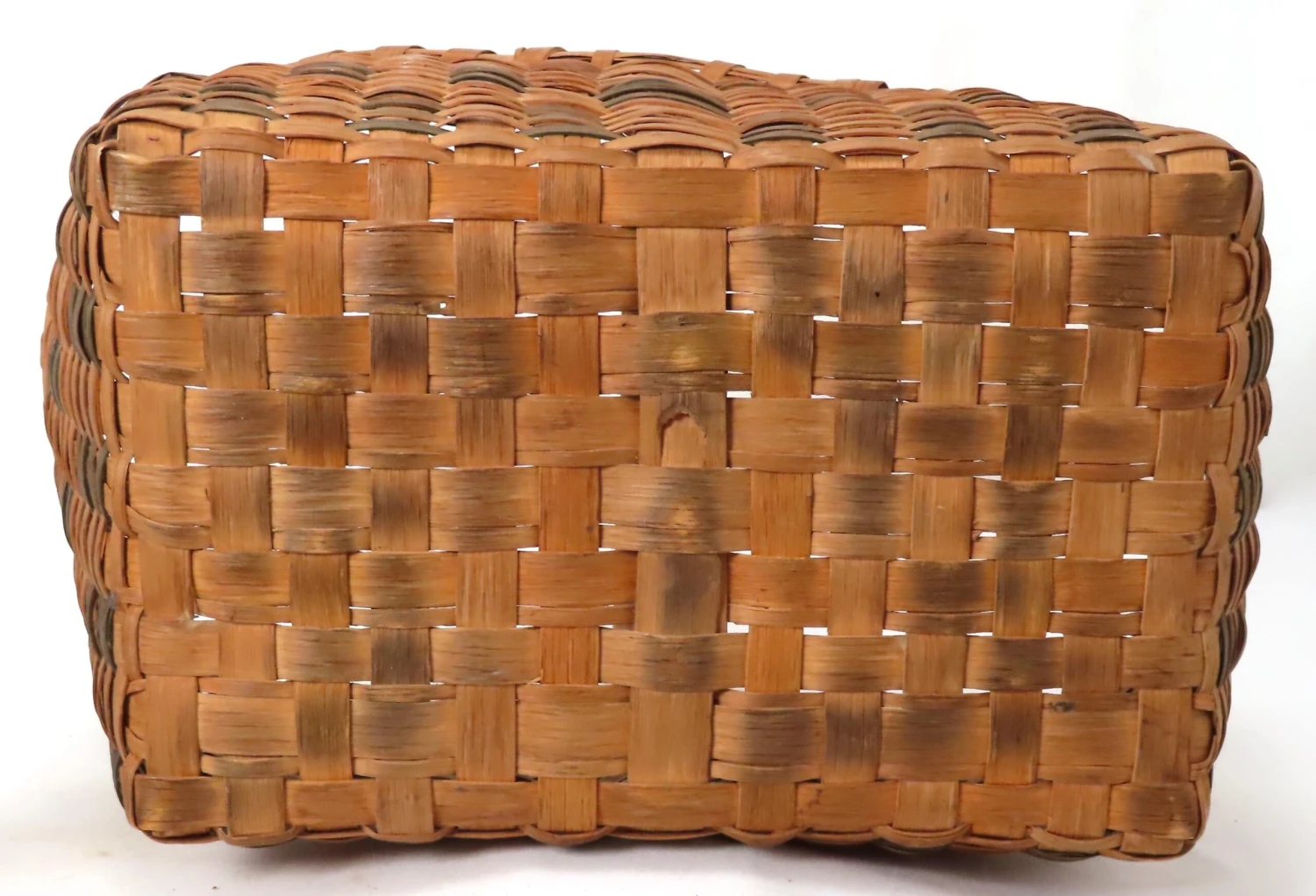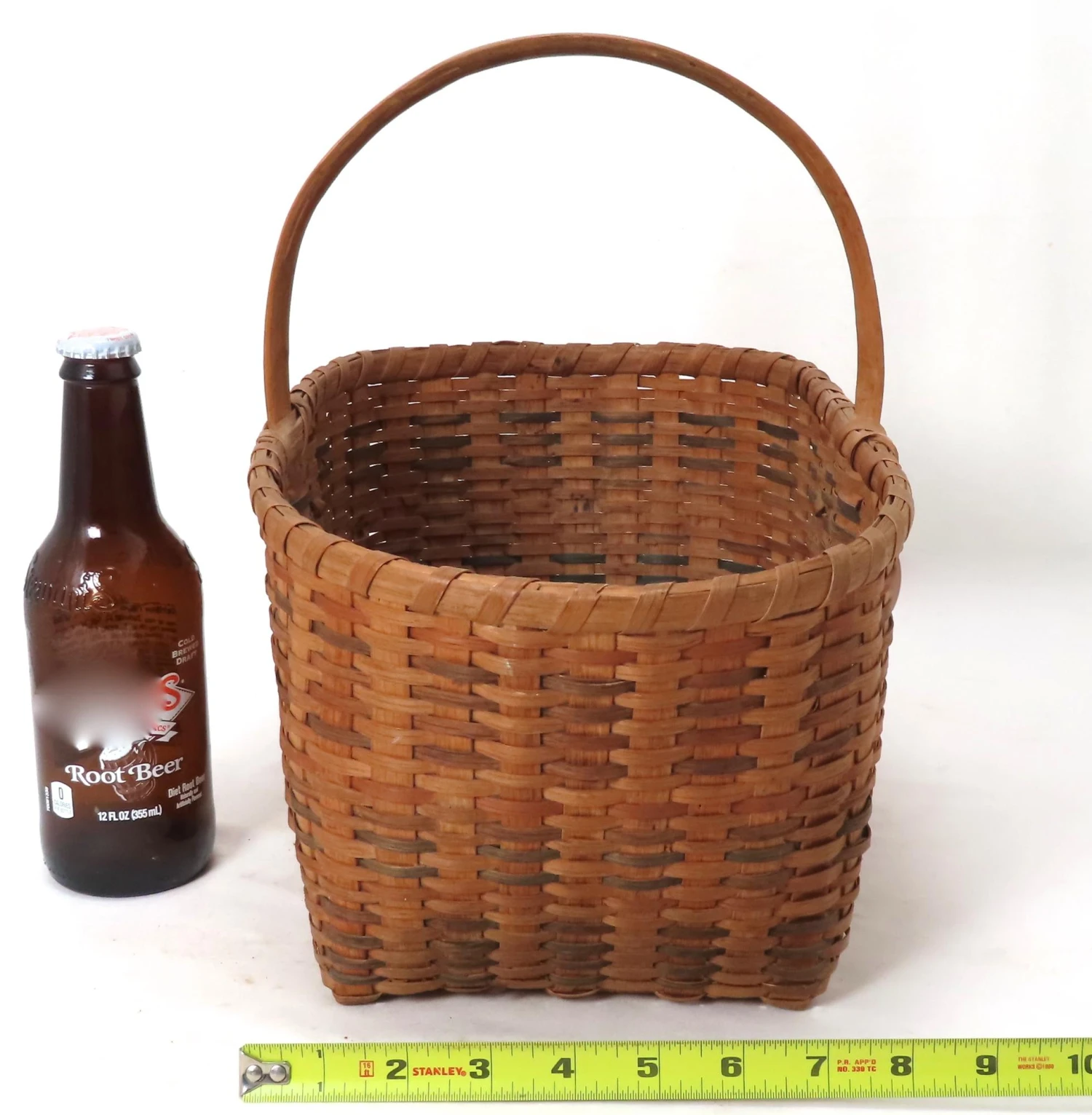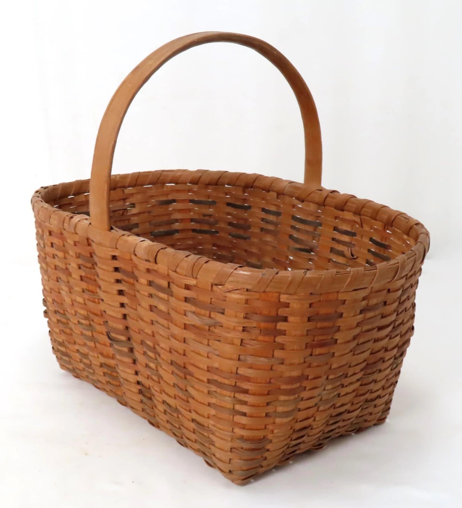 This Really is an Exceptionally Nice Vintage American Primitive Carry Basket. Circa Early to Mid 20th Century. It is Completely Hand Made – Hand Woven out of Indigenous Brown Ash Wood splint. It has Exceptionally Nice Workmanship – Attention to Detail in the Weaving – Construction – Composition Etc. It also has a Wonderful Natural Aged Color and Patina. This is a Very Strong – Heavy Gauge Splint – Tightly Woven Basket. It is in Excellent Condition – Displays Beautifully. I acquired this piece in the Down East Coastal Maine Region.