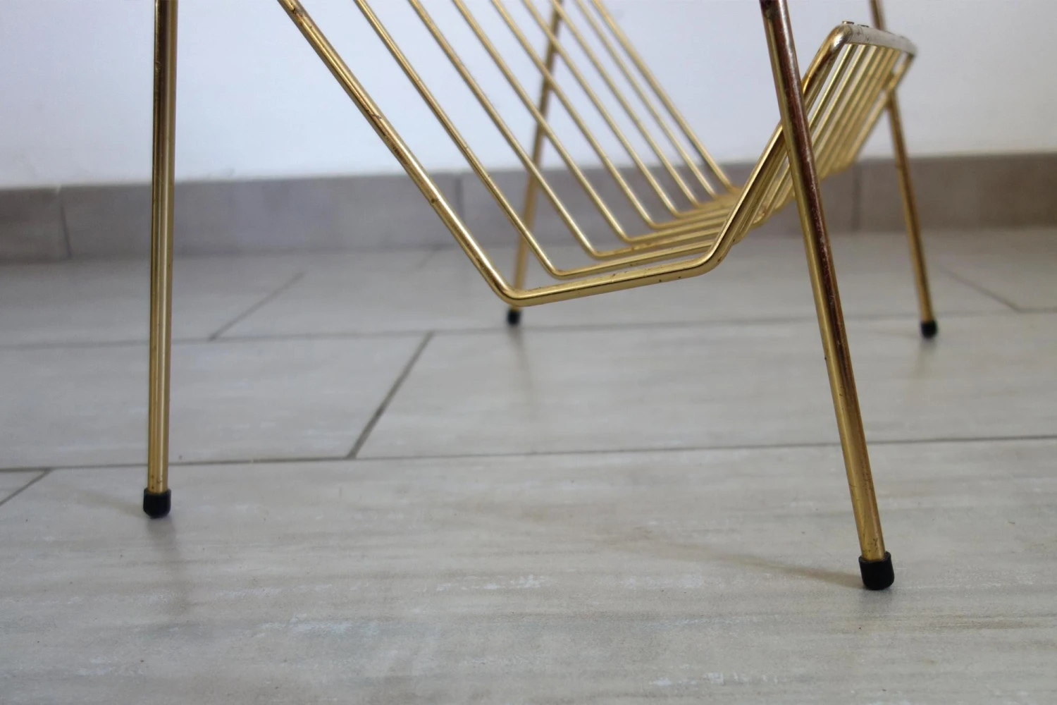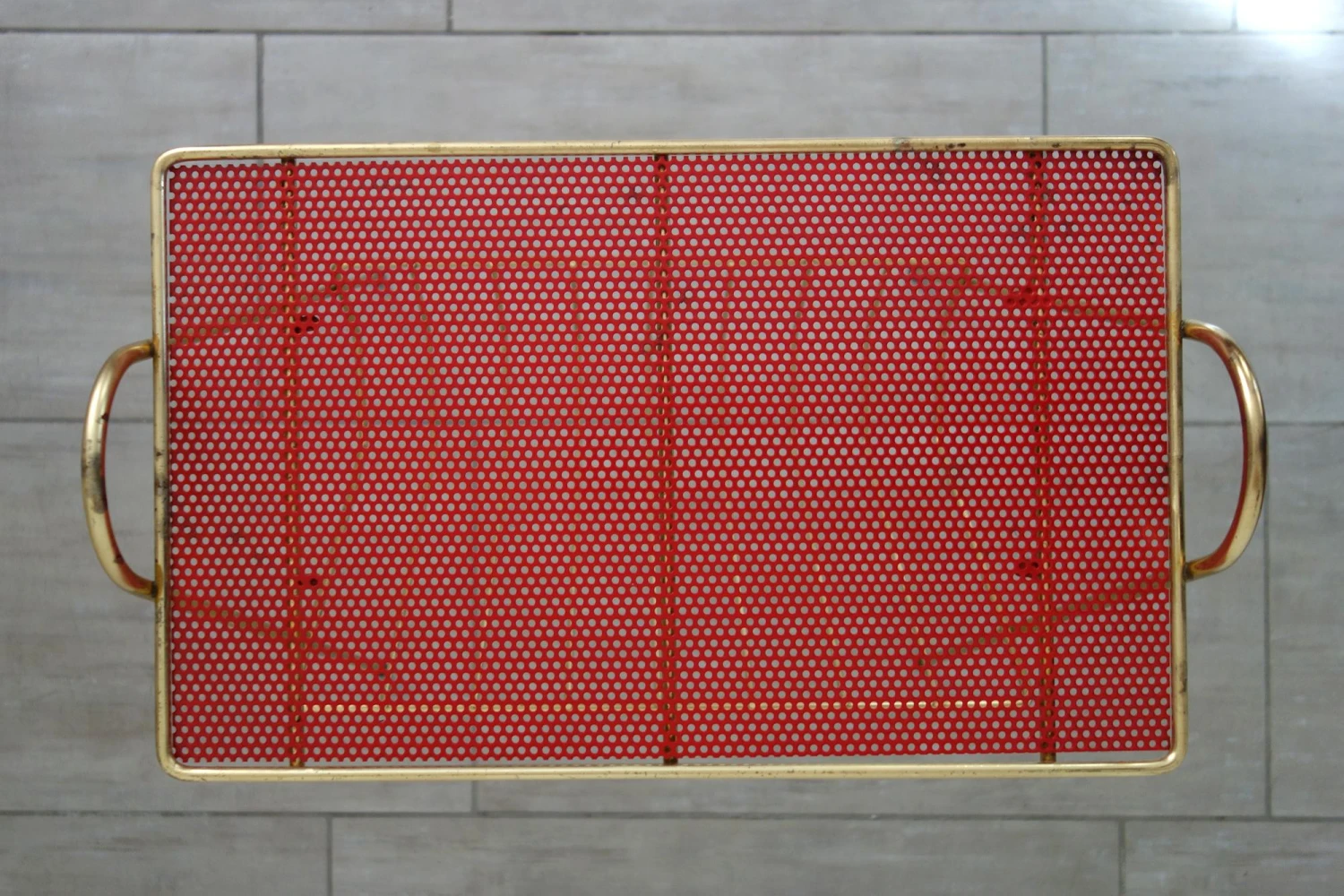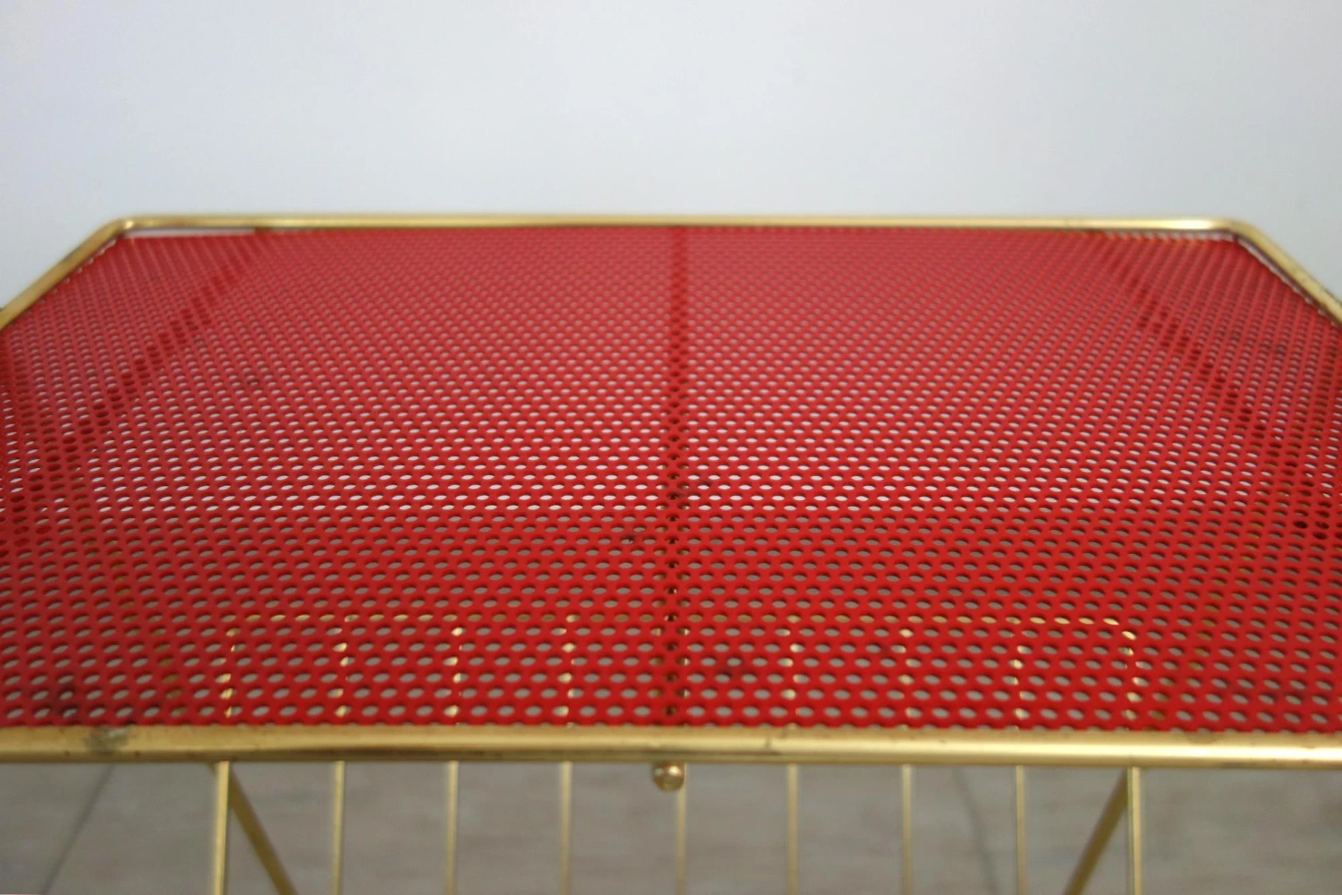 Reviews or vinyl door from the 50s and 60s. Gold metal structure and red perforated metal tray in the spirit of Mathieu Matégot’s creations. Present tips.