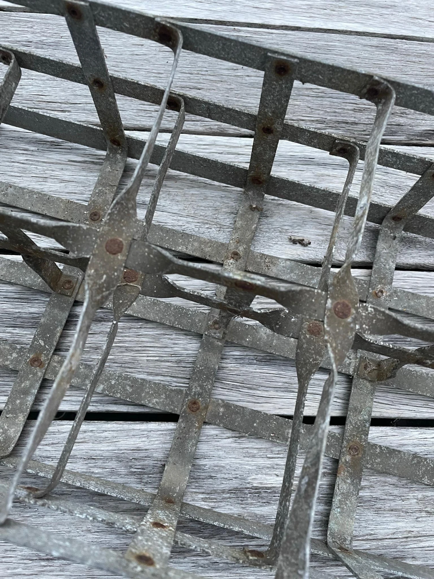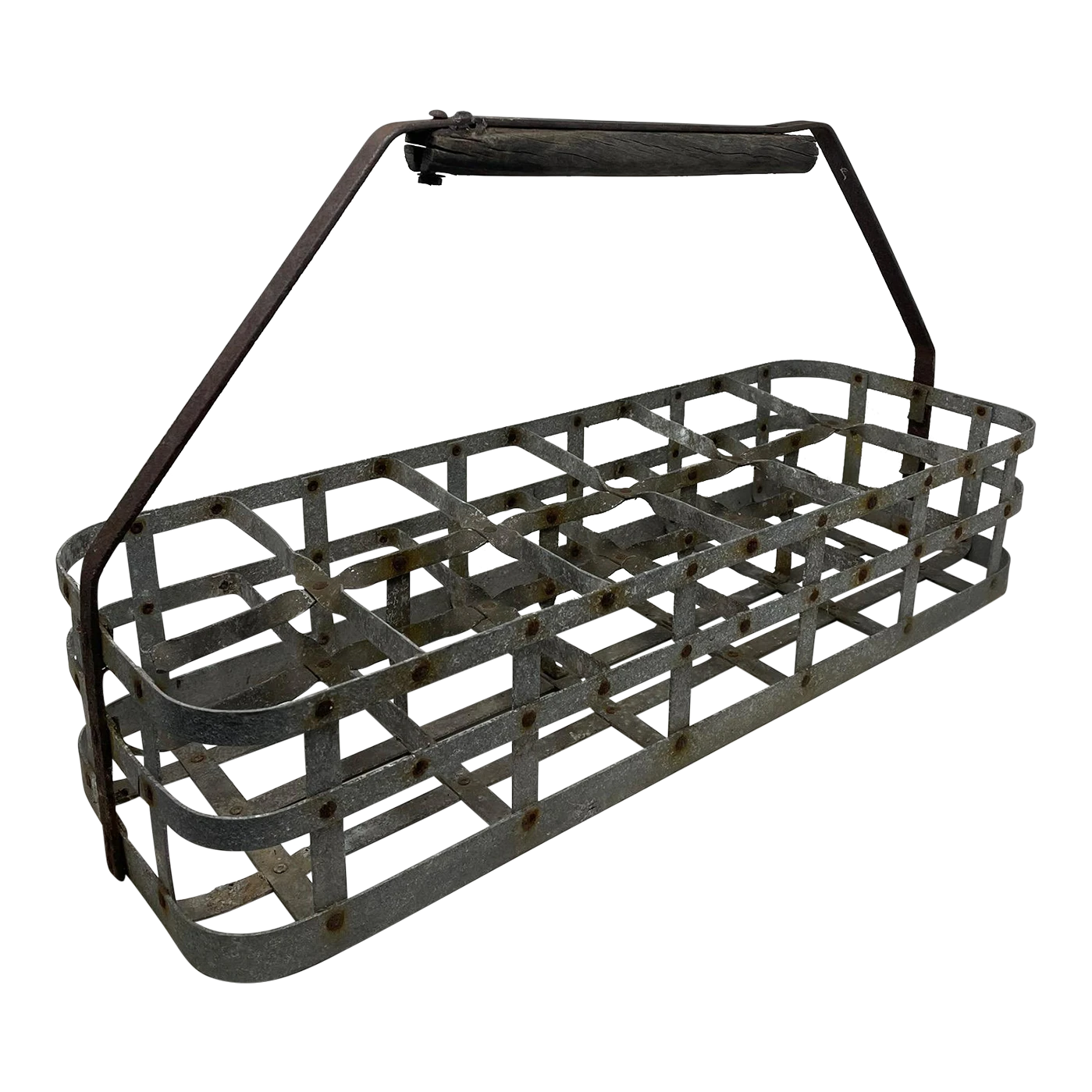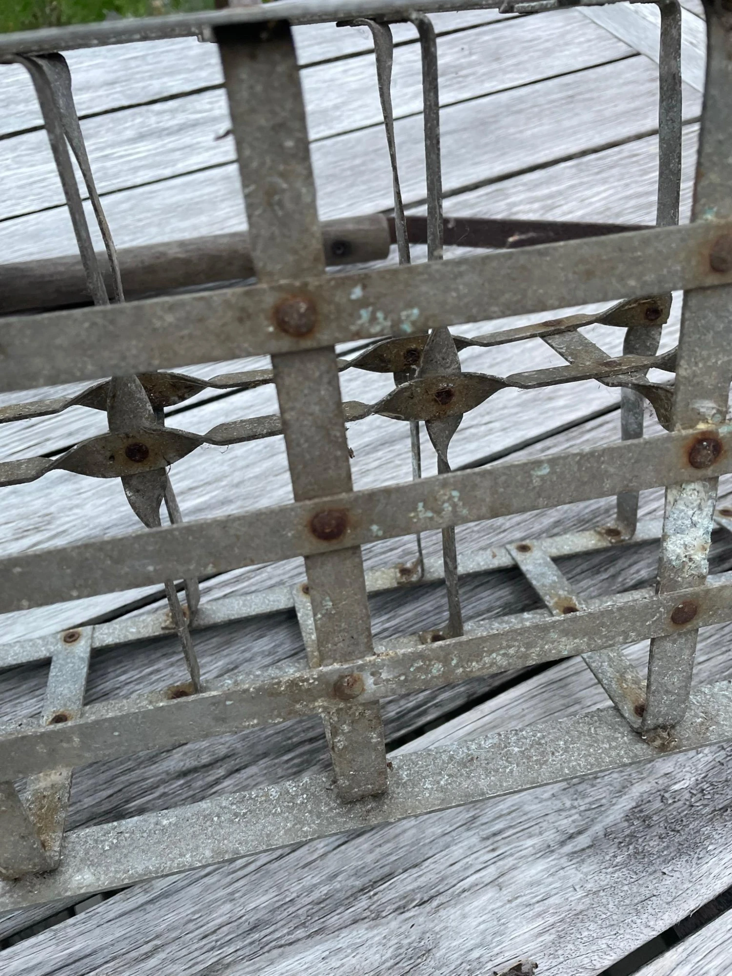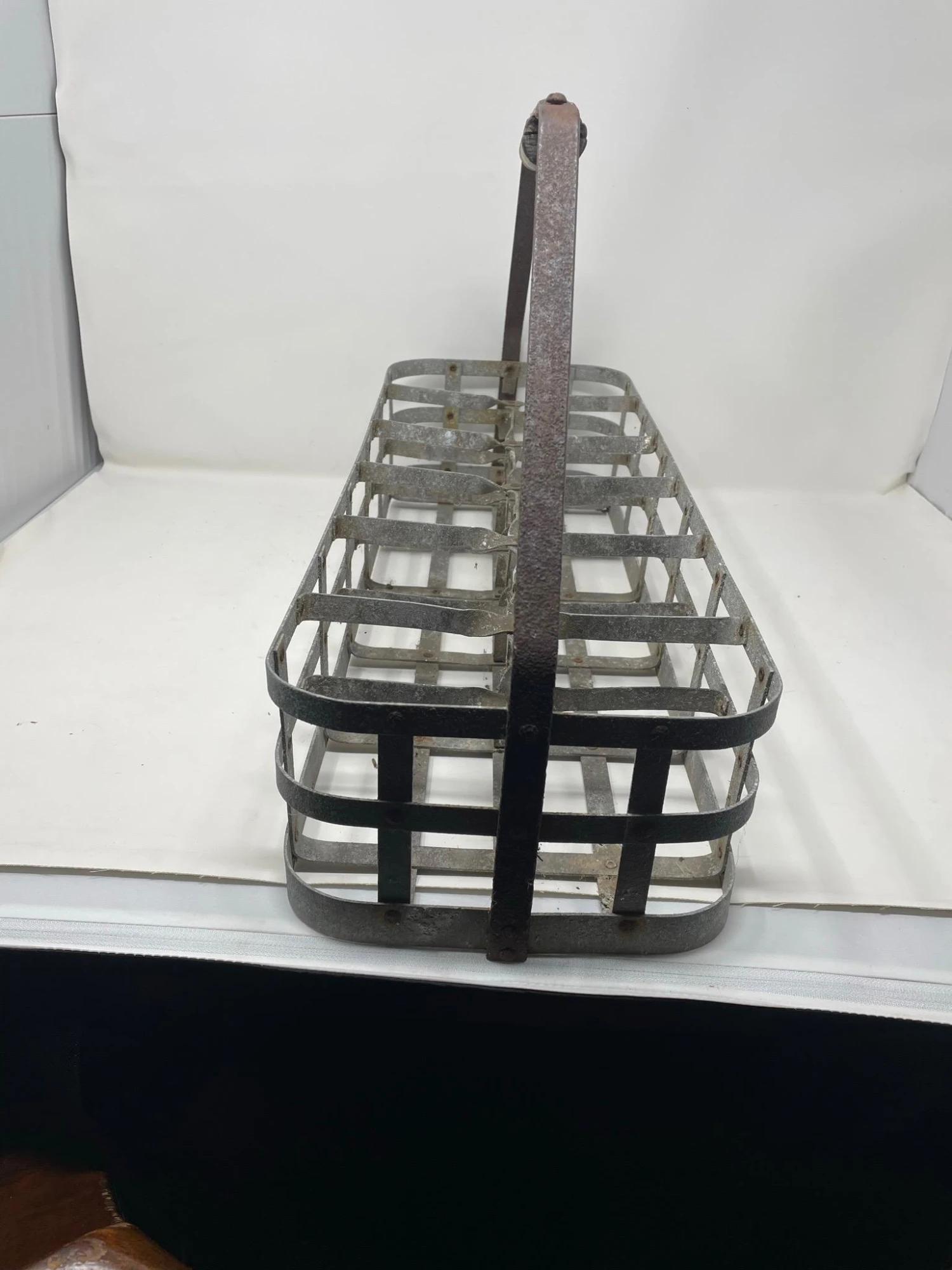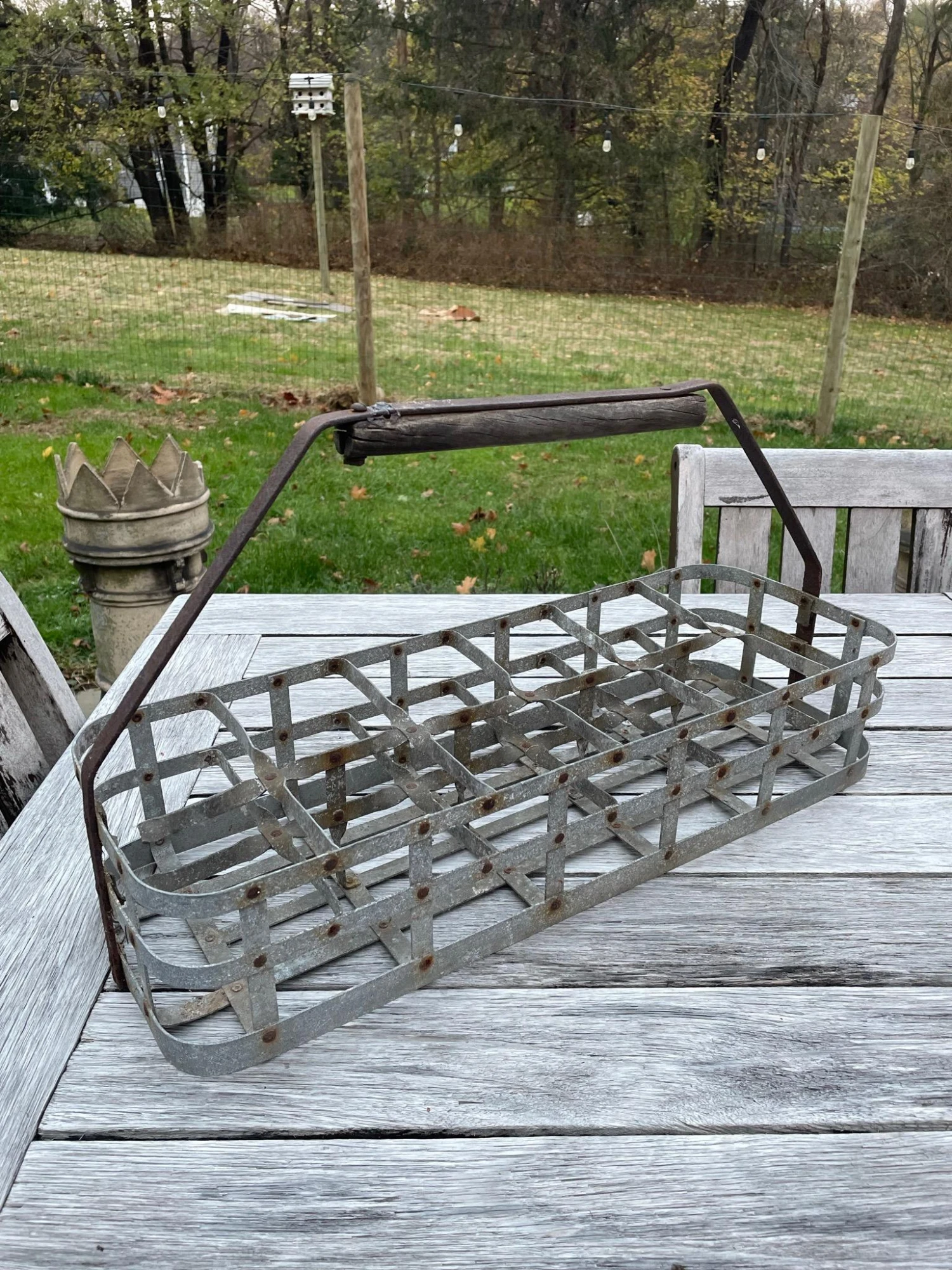 Perfect old oxidized metal crate with wood handle. Great for little garden pots of herbs or flowers.