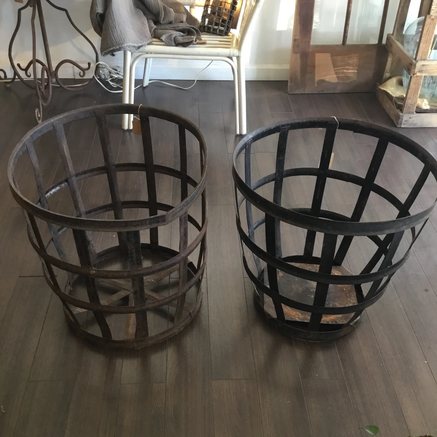 Beautiful vintage metal vintners crate. Two available. One brown metal, the other black. Both are in tact and ready for use. Great as is, as a planter or for original use of holding large Demi John vintner bottles.