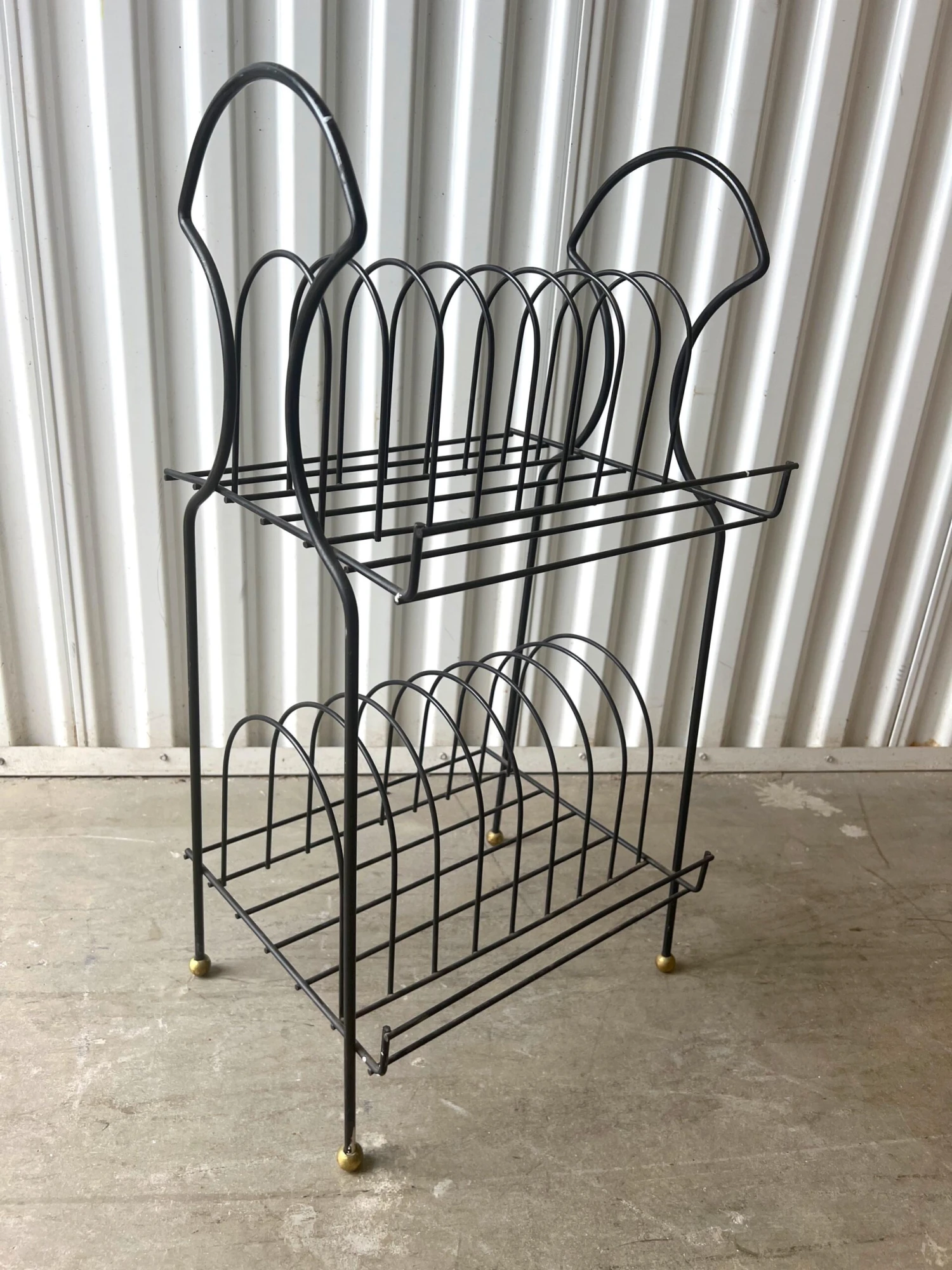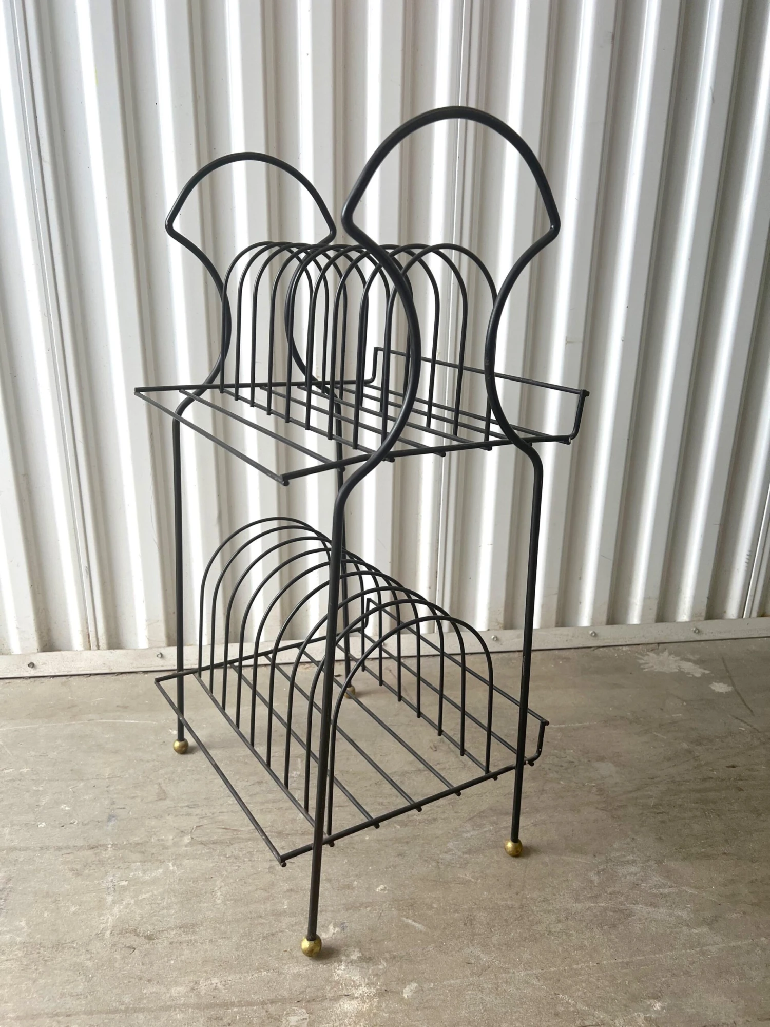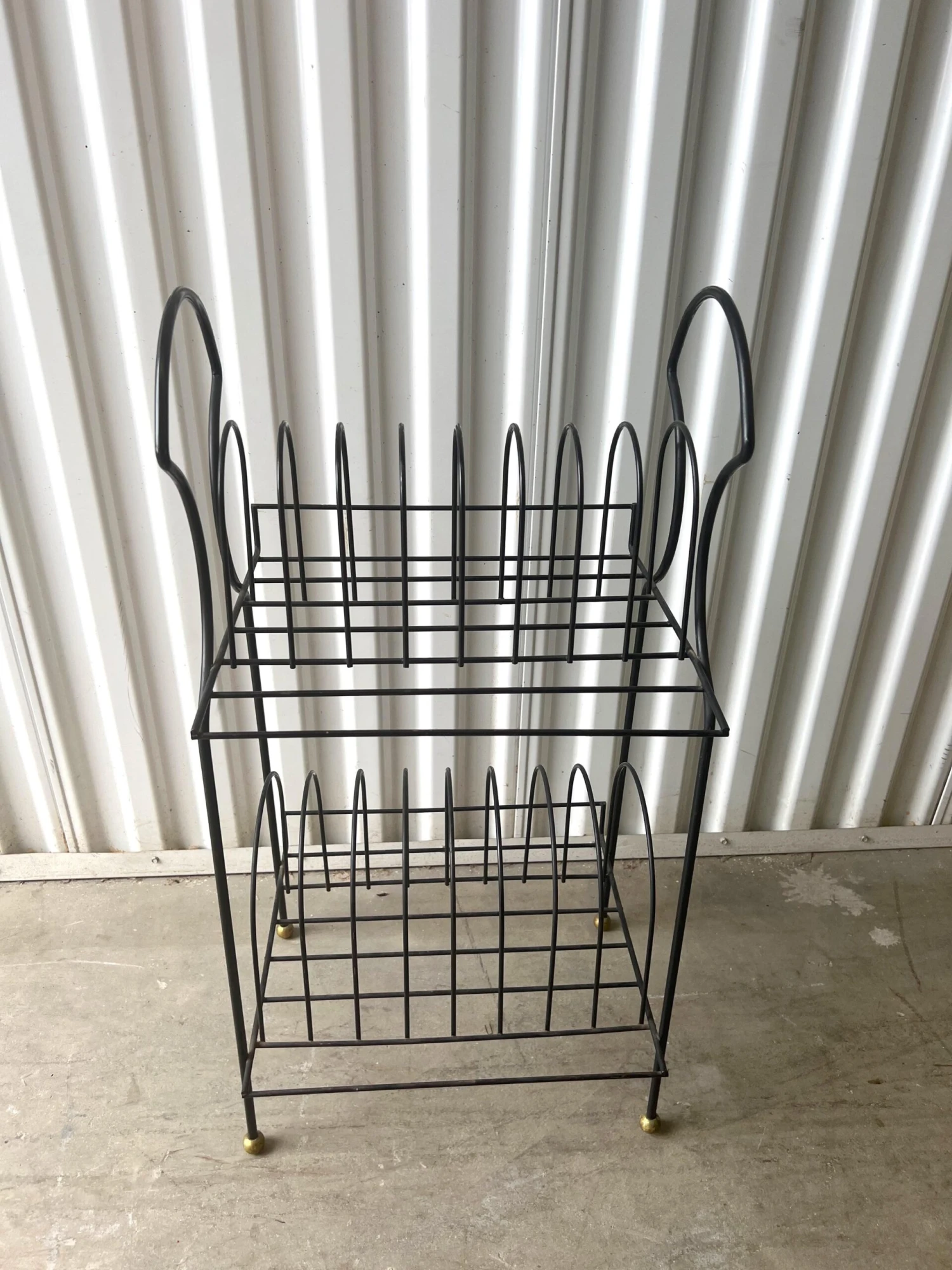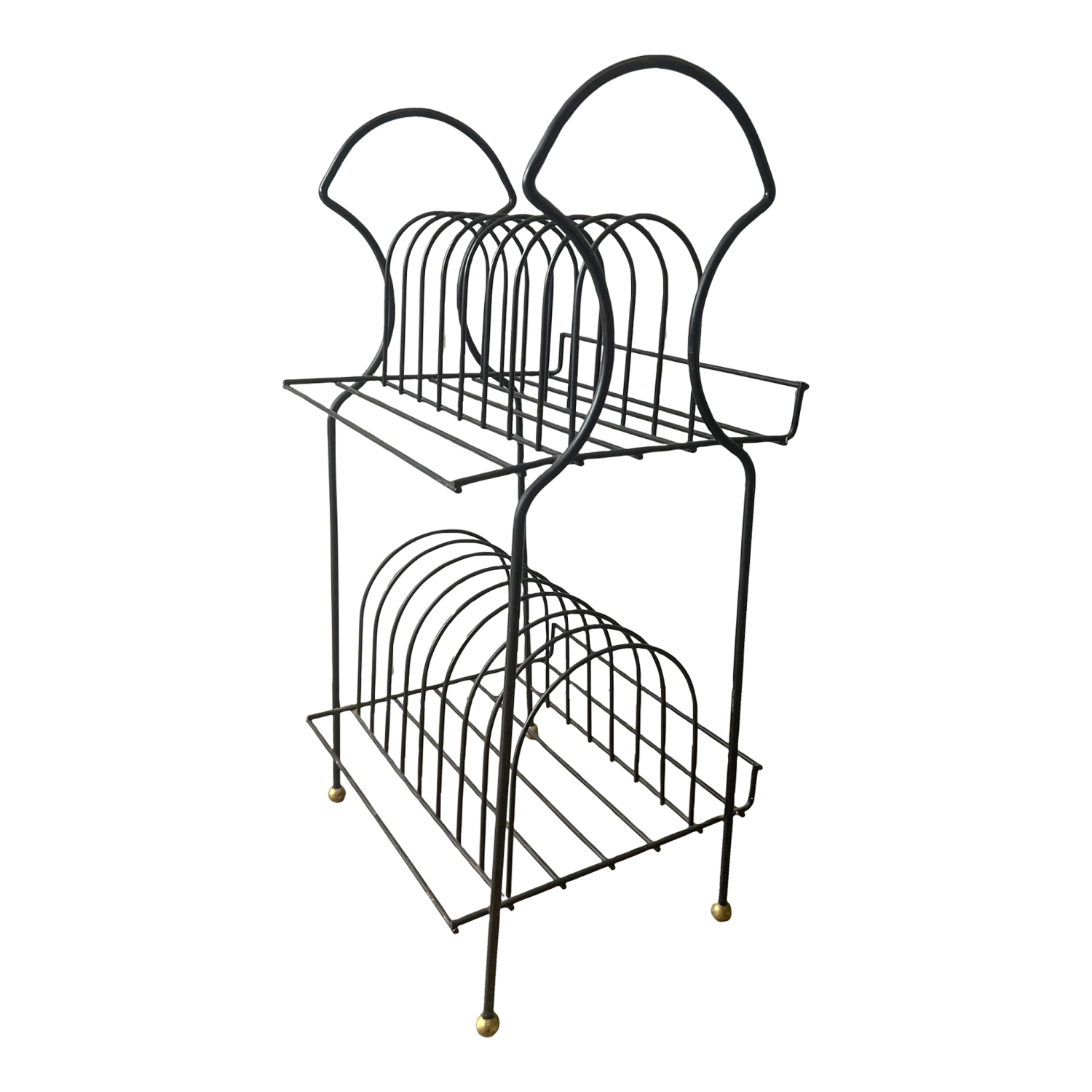 Here is a fantastic 2 tier standing record stand with an arched top. A curved lip on the back keeps records from falling off. It sits on gold balls on the legs.