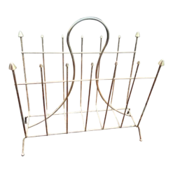 Vintage Mid-Century Modern Atomic Era Metal Wire Gold Magazine Rack Stand with arrow detail.