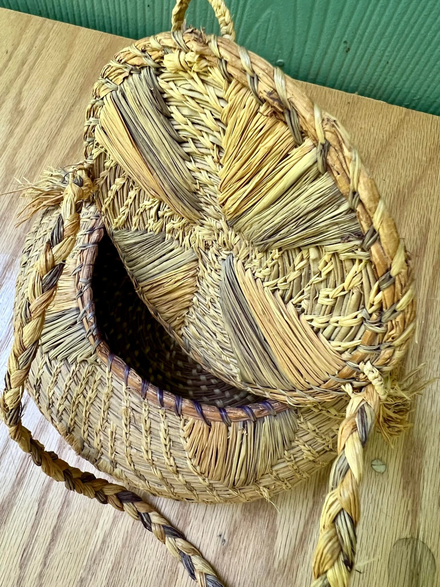Small, woven pine needle, lidded basket with braided carrying handle and braided latch for securing lid in place. Meticulous craftsmanship. …