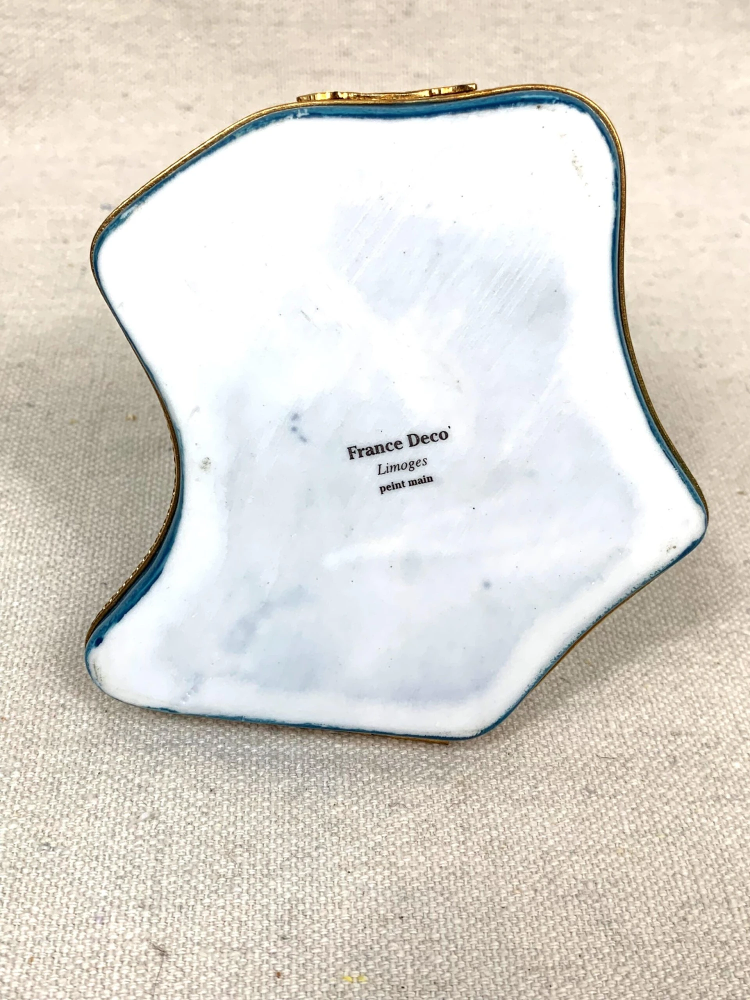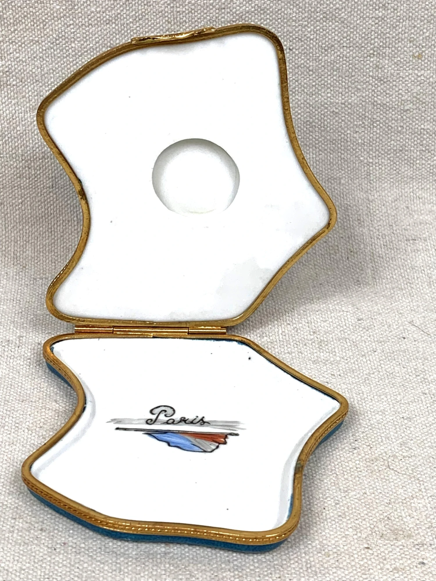 Vintage Paris Landmarks on map of France hand painted Limoges box. The four landmarks are the Eiffel Tower, Arc de Triomphe, Sacre Coeur and Notre Dame. This is a pre-owned item so please see all pictures and ask any questions.