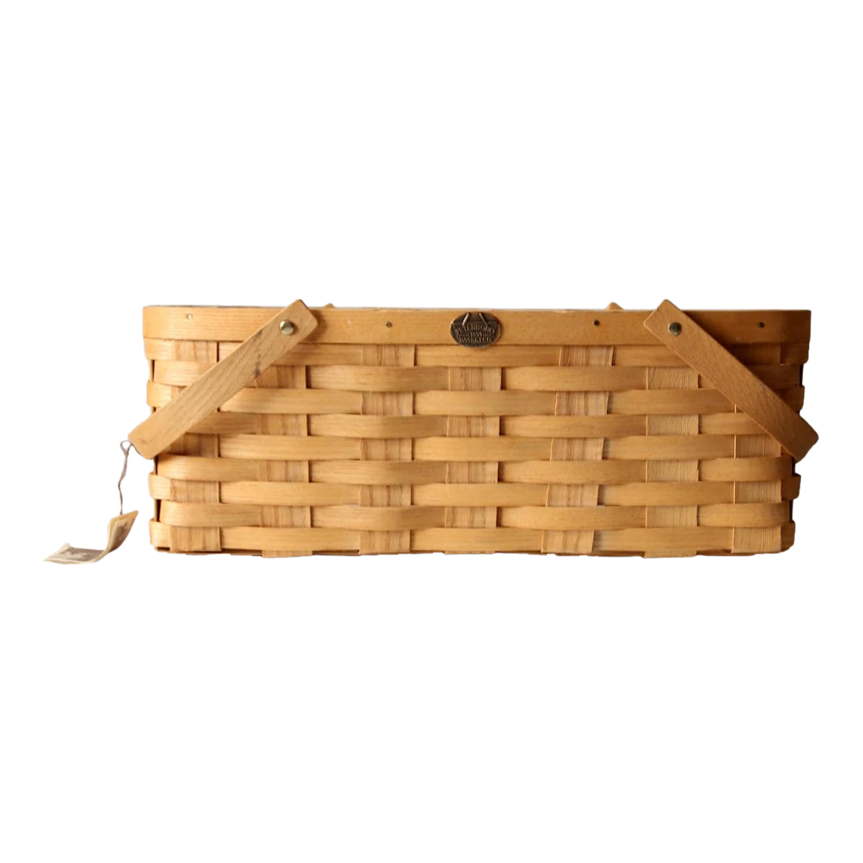 This is a vintage Peterboro Basket Co storage basket. The classic splint weave basket features double swing handles. Original paper tag on basket.