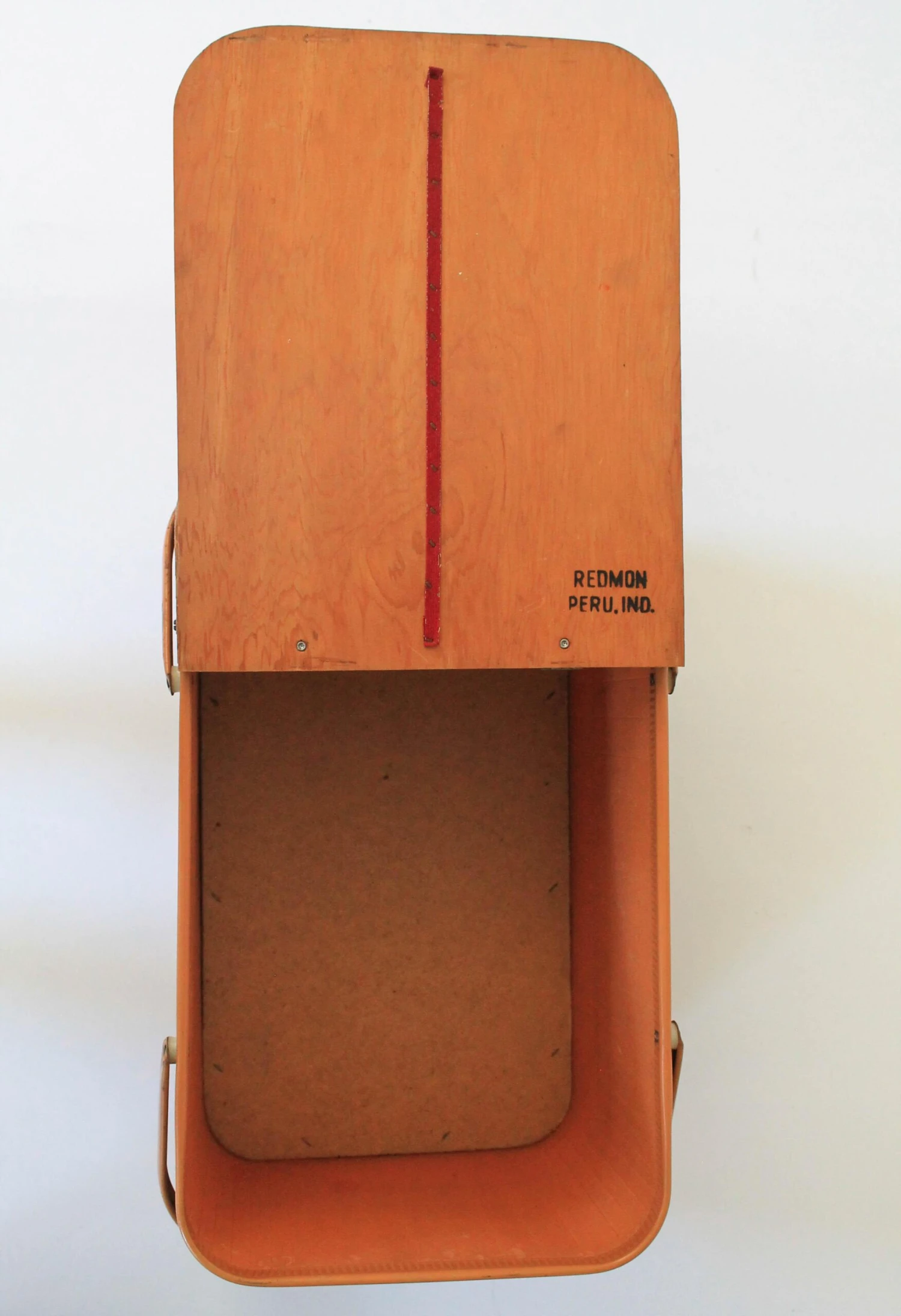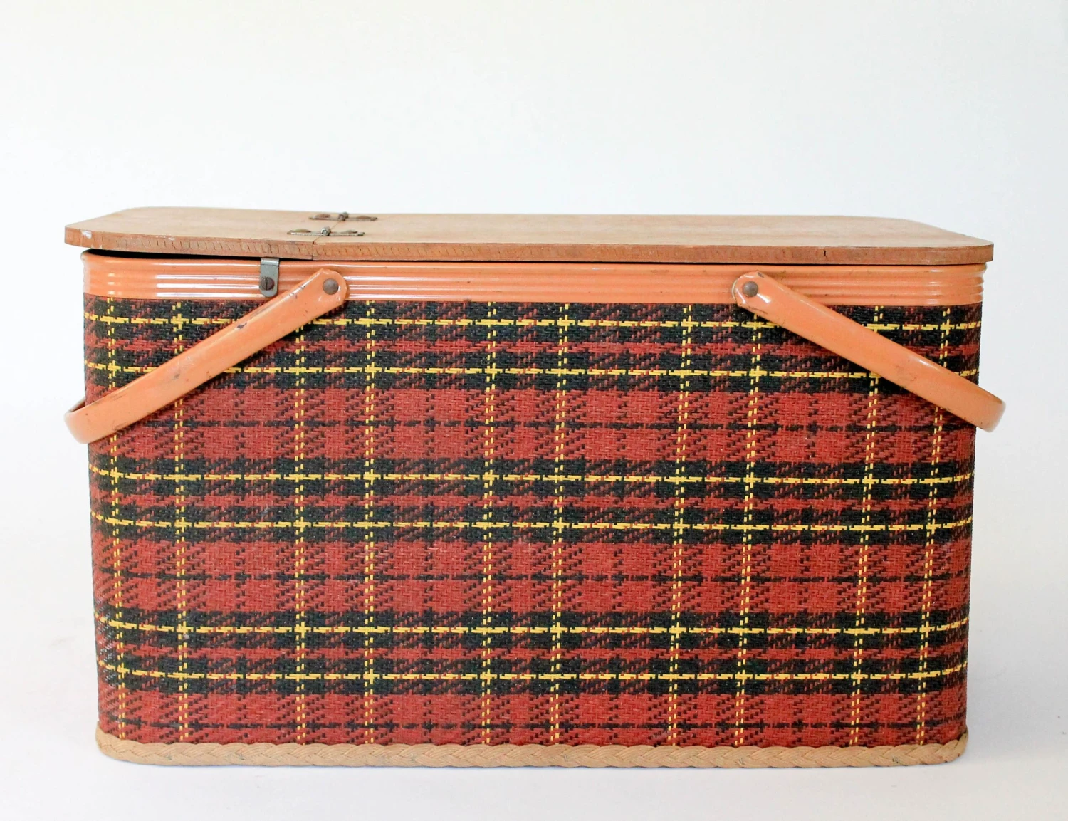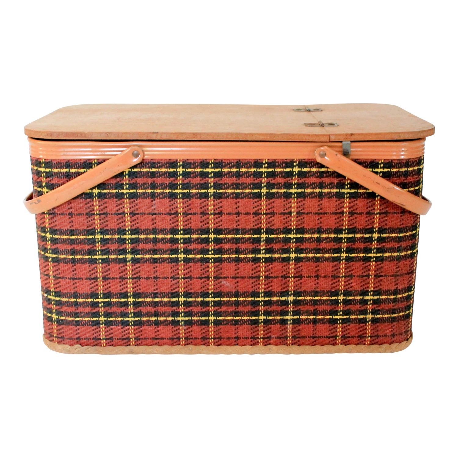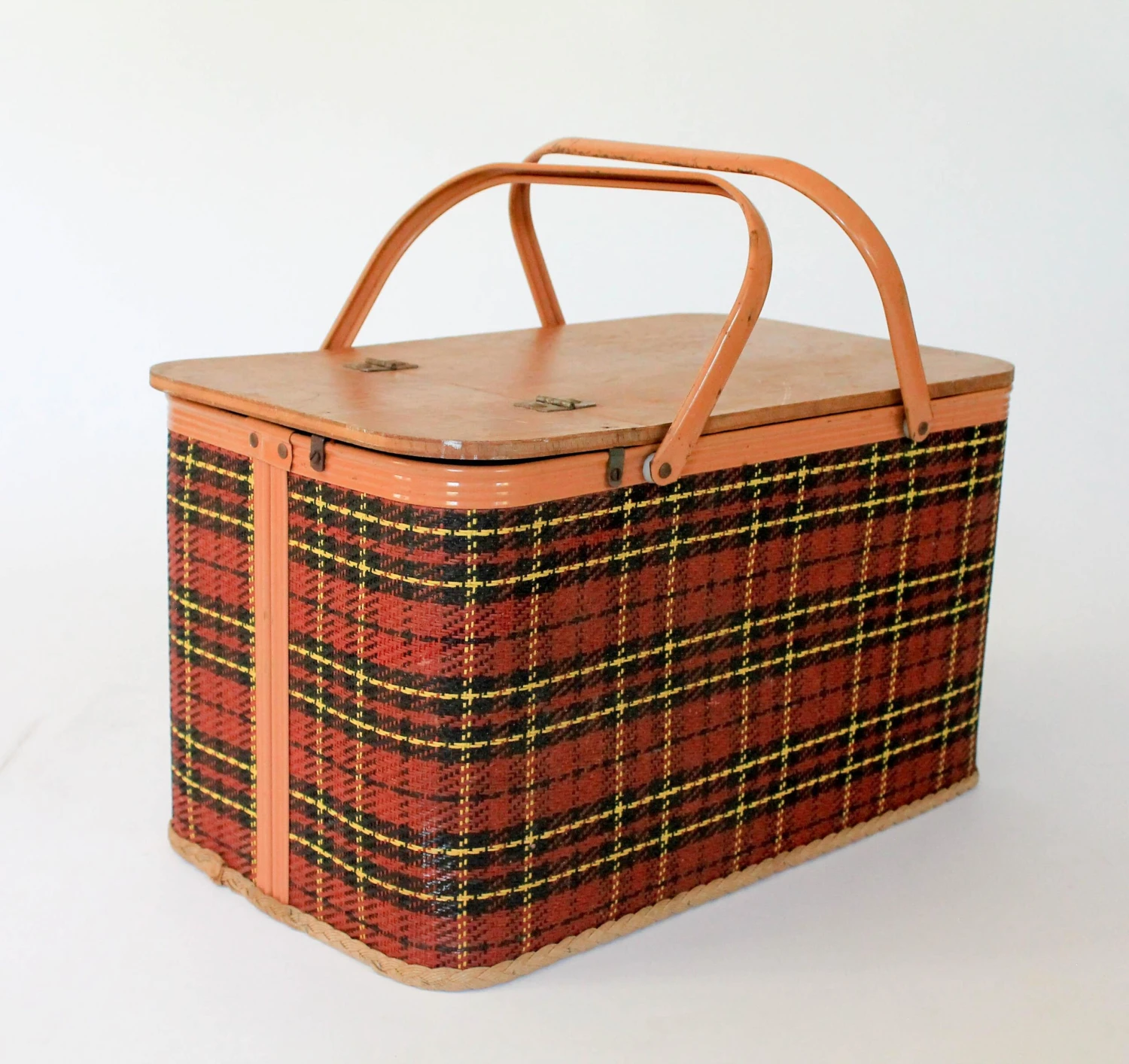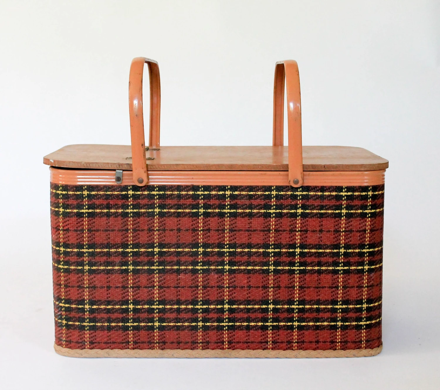 Vintage woven plaid picnic basket with small table. Hinged lid and metal handles by Redmon Preu. Ind. Makers stamp inside …