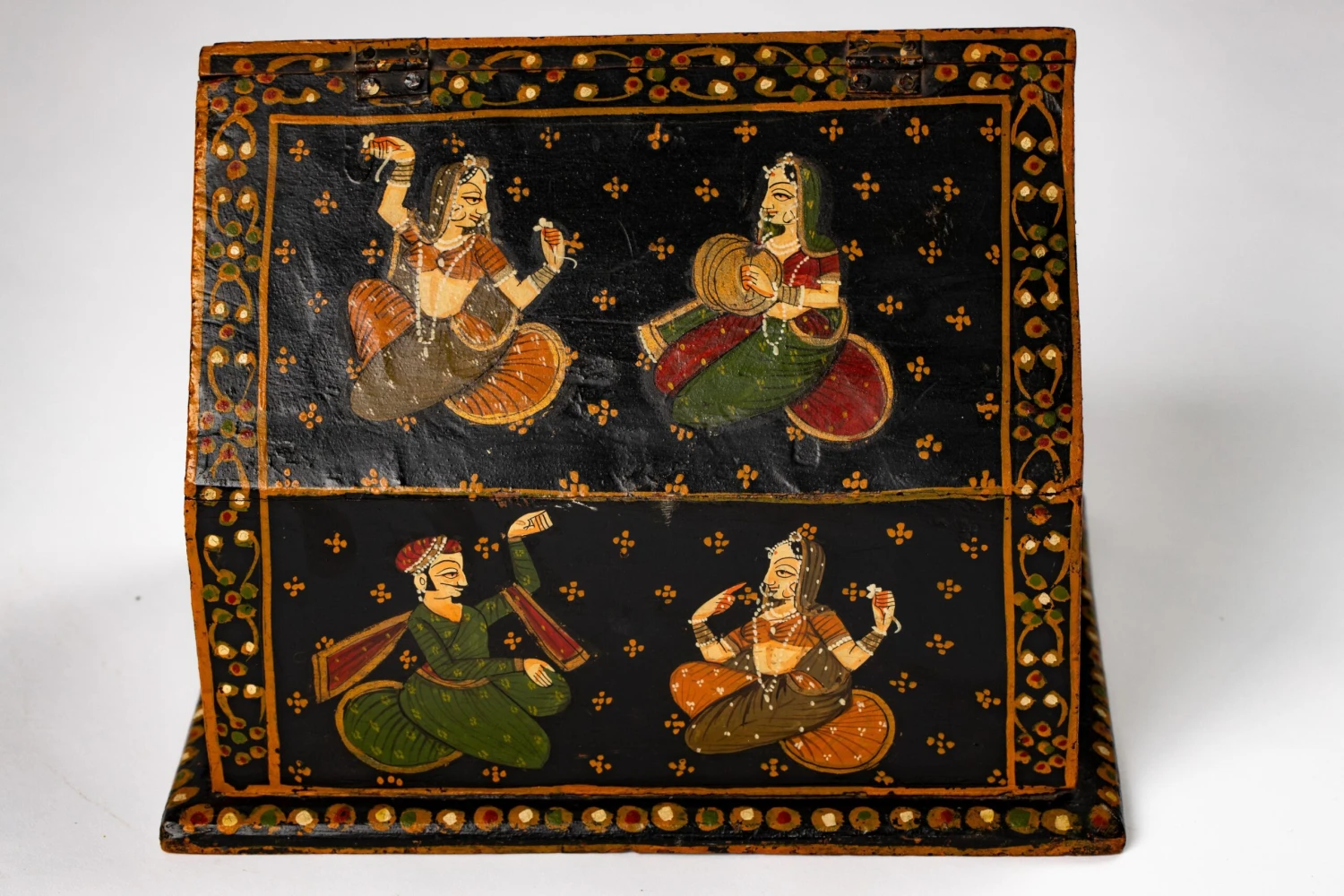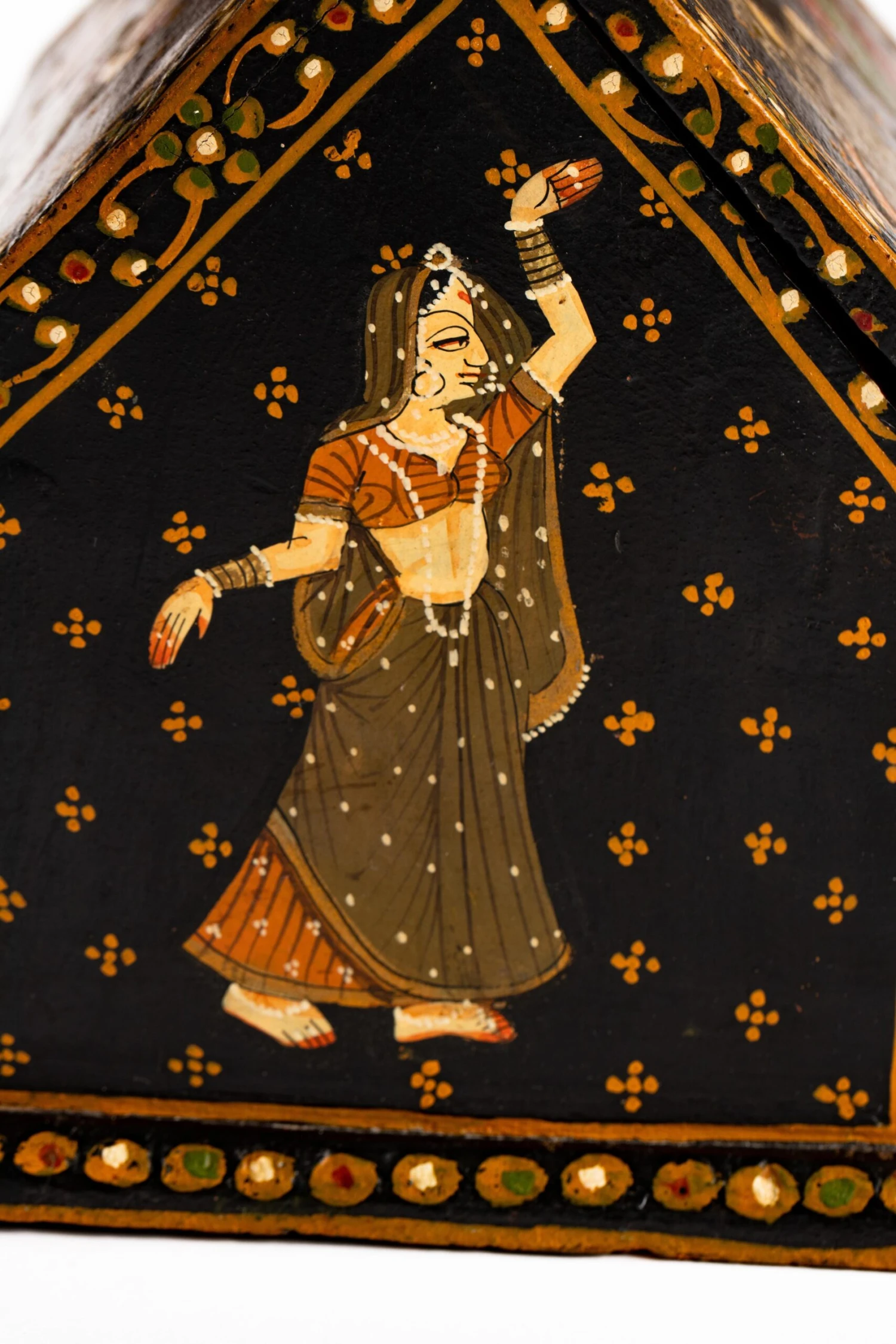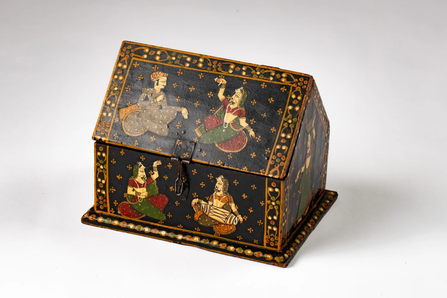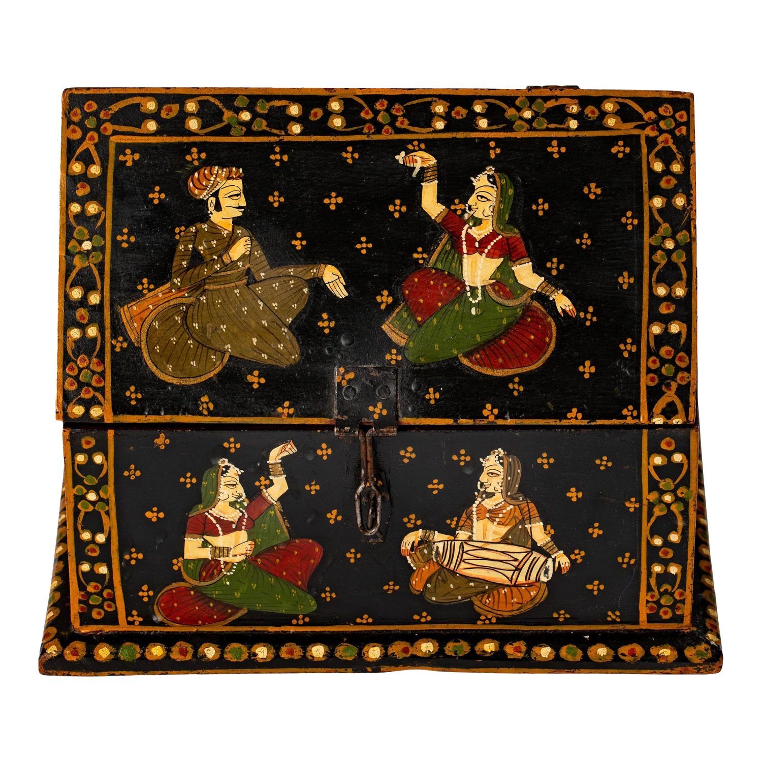 Vintage Rajasthani Indian vaulted dowry jewelry box, hand painted with Indian lovers enjoying each other, while beautiful court musicians accompany …