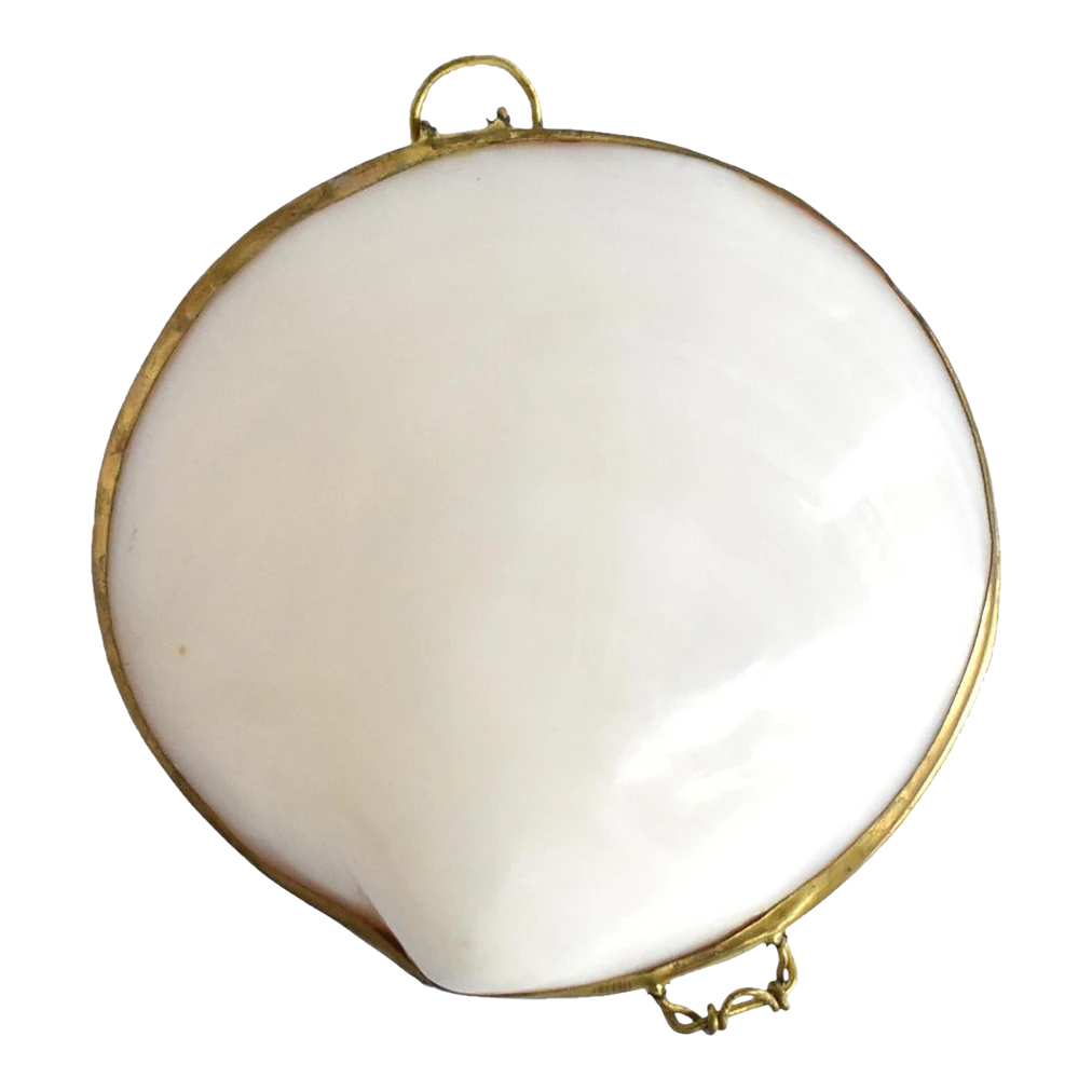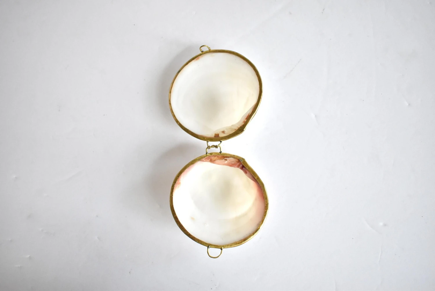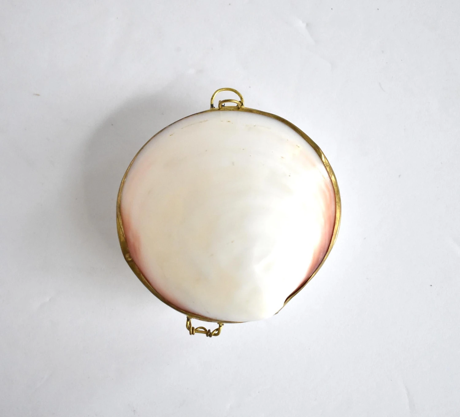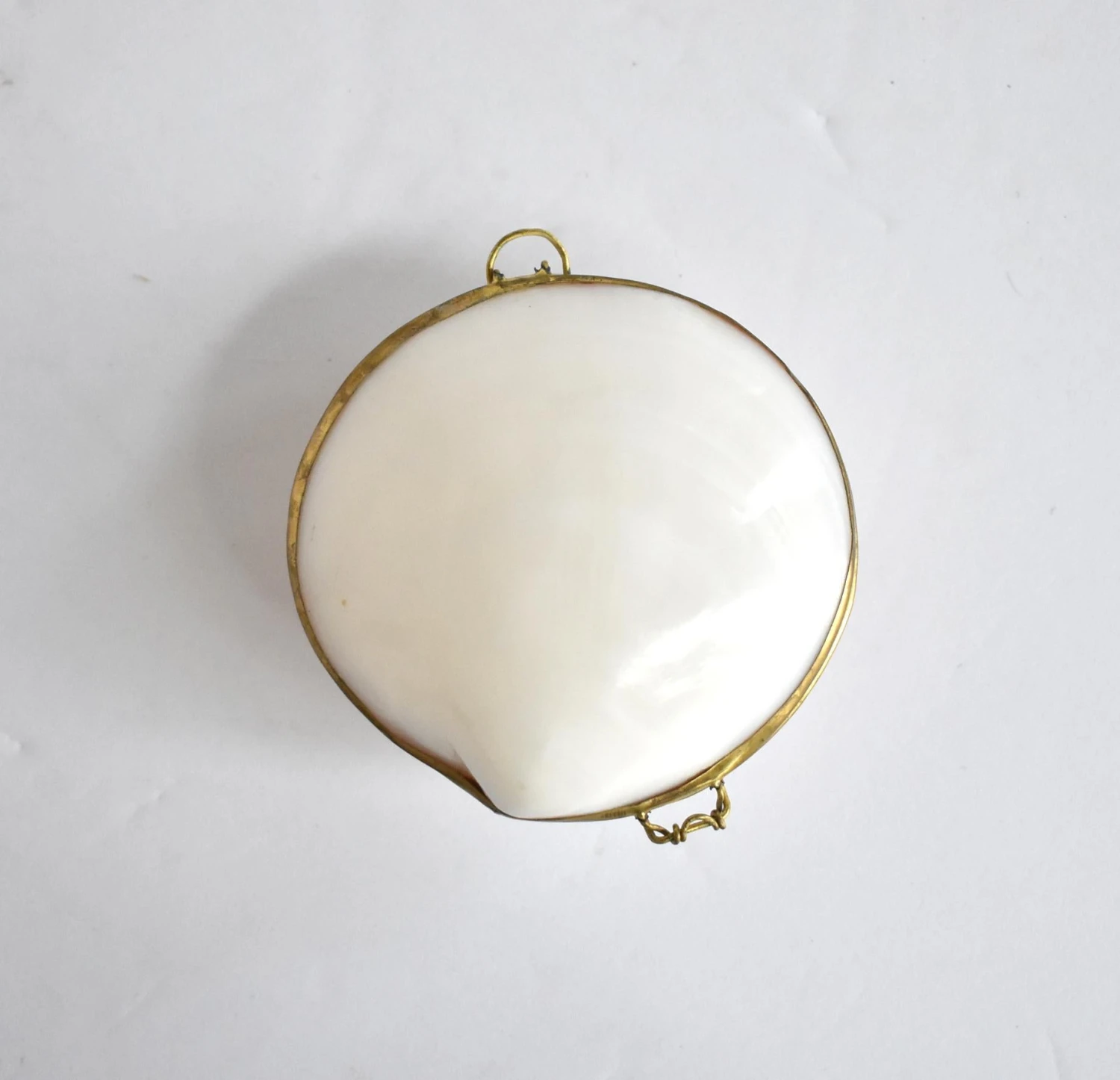 A vintage, hinged, polished white clam shell box with brass hardware. 2.75″x2.75″x1.5″.