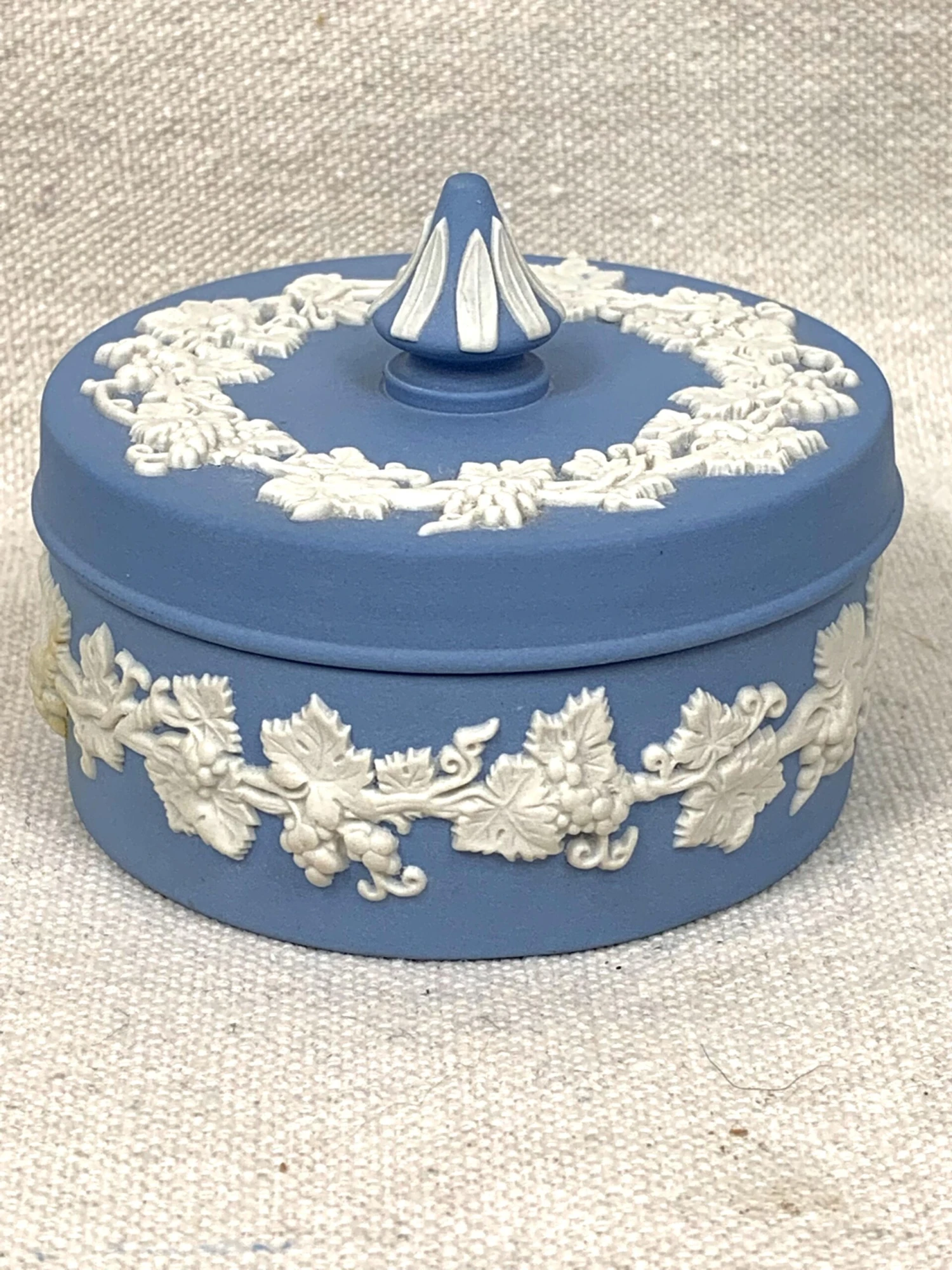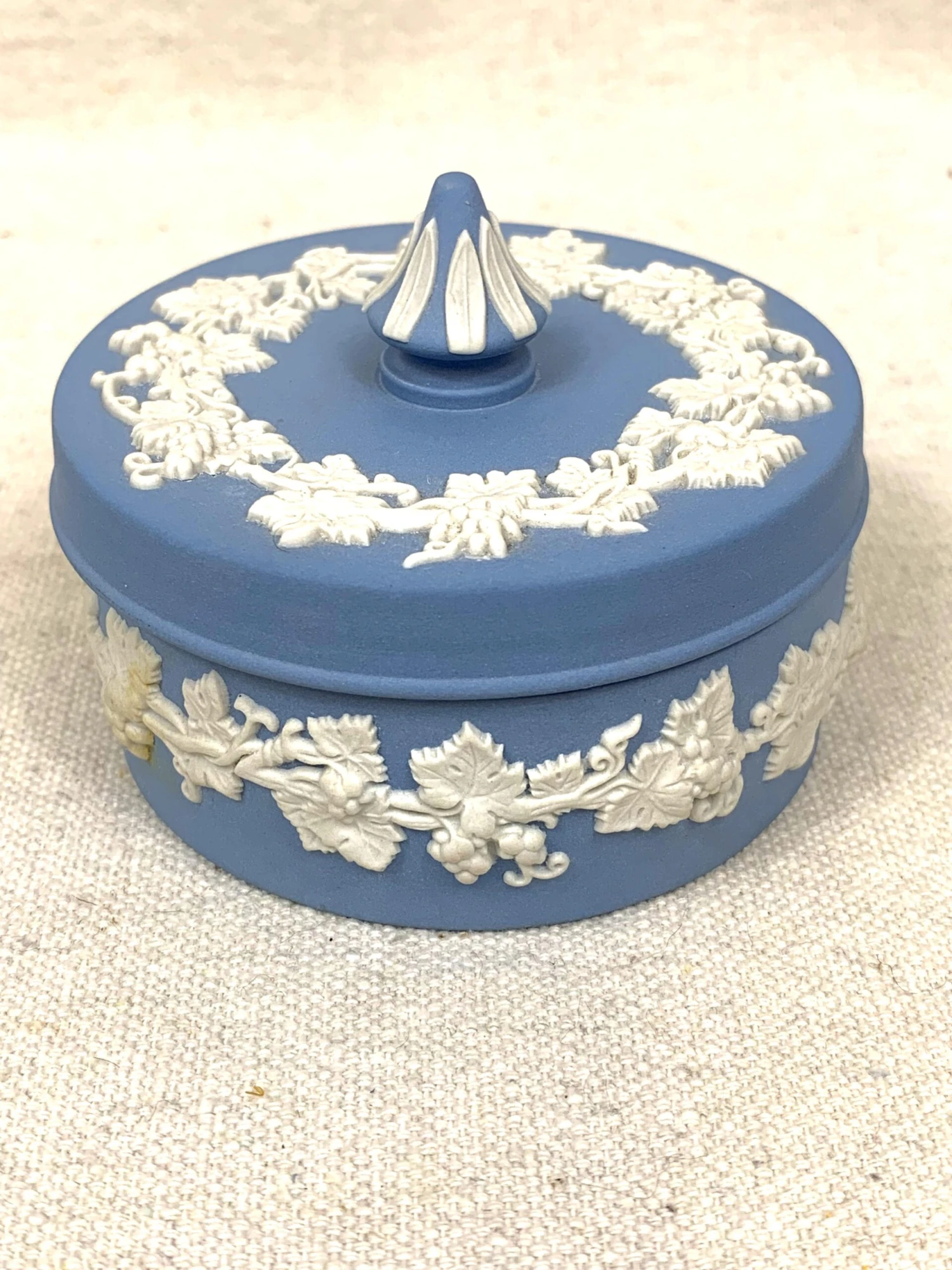 Vintage Wedgwood blue and white jasperware trinket box beautifully decorated with a grape vine design. This is a pre-owned item …