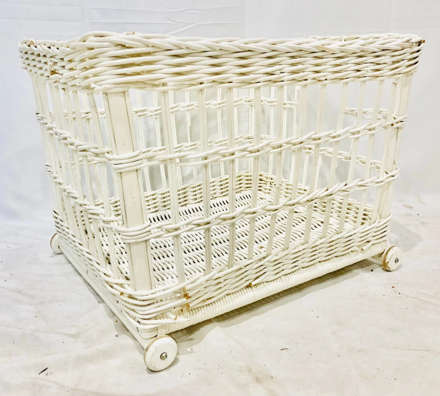 Fantastic Vintage Mid Century Era Woven White Wicker Storage Basket Cart. Original finish fittings and frame. Solid and sturdy. Great for holding beach toys, sofa throws or blankets, dog supplies or really anything! Sure to add interest to any Eclectic, Boho / Palm Beach Chic, Country Cottage or Beach House, Shabby Chic, Coastal or Traditional abode.