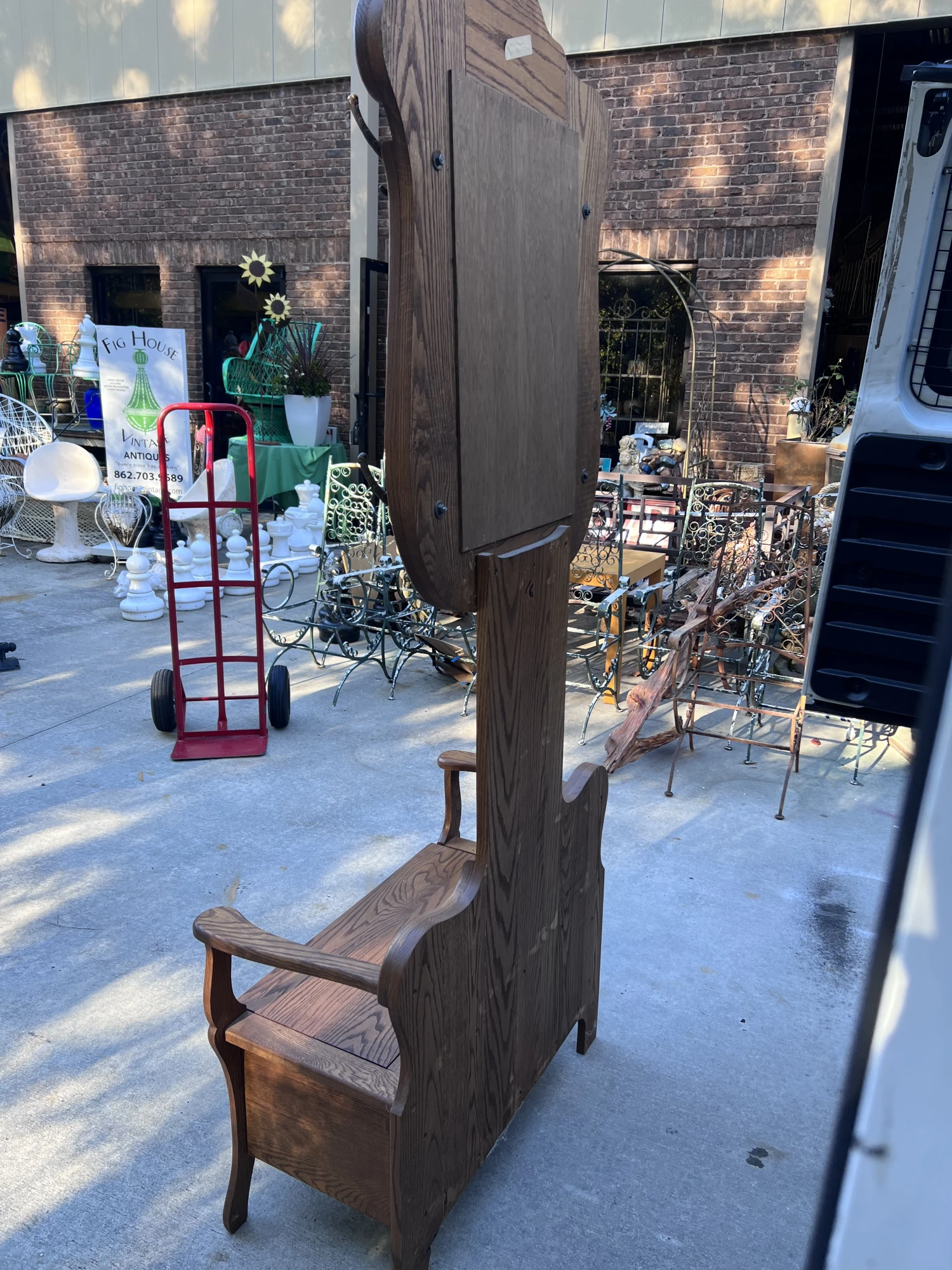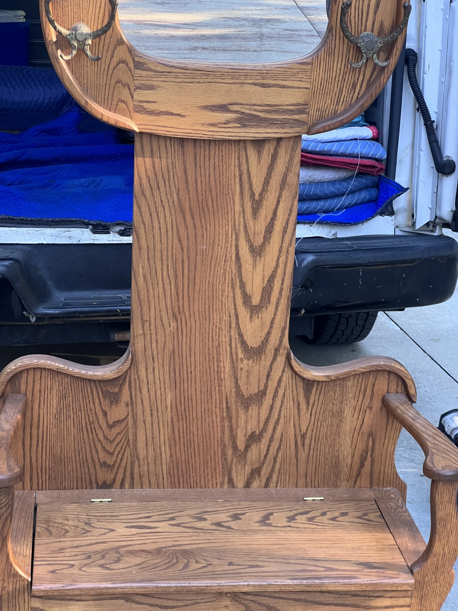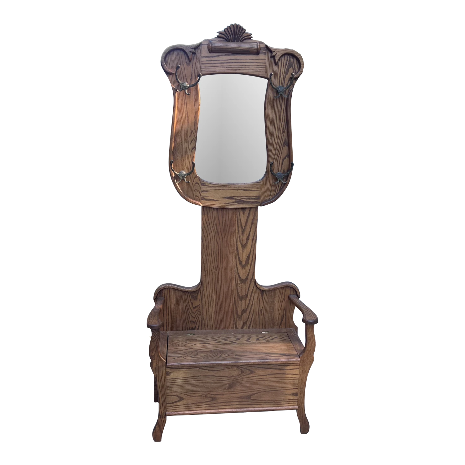 Beautiful vintage wooden hall tree with a mirror and brass coat hangers along with a bench with storage. Great piece …