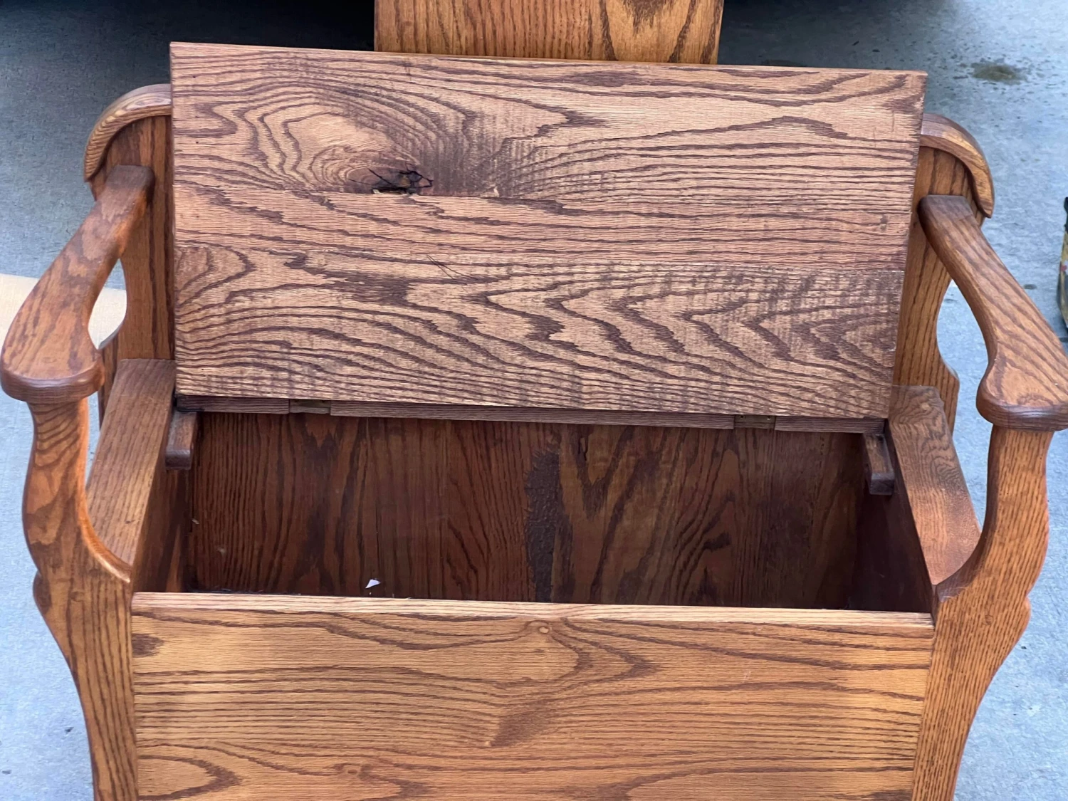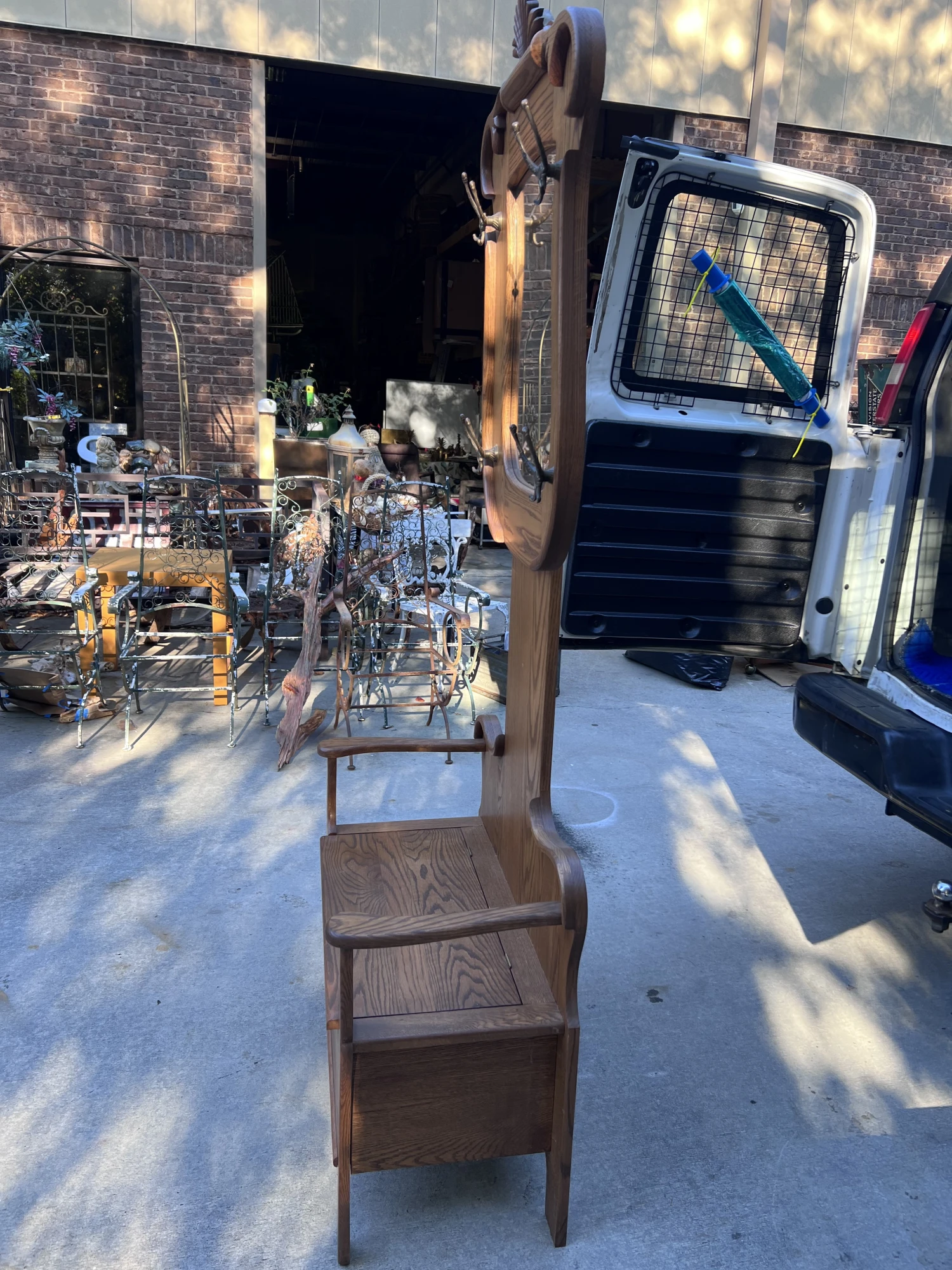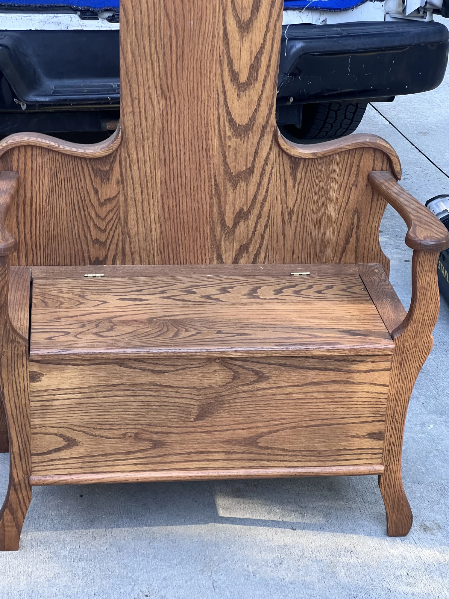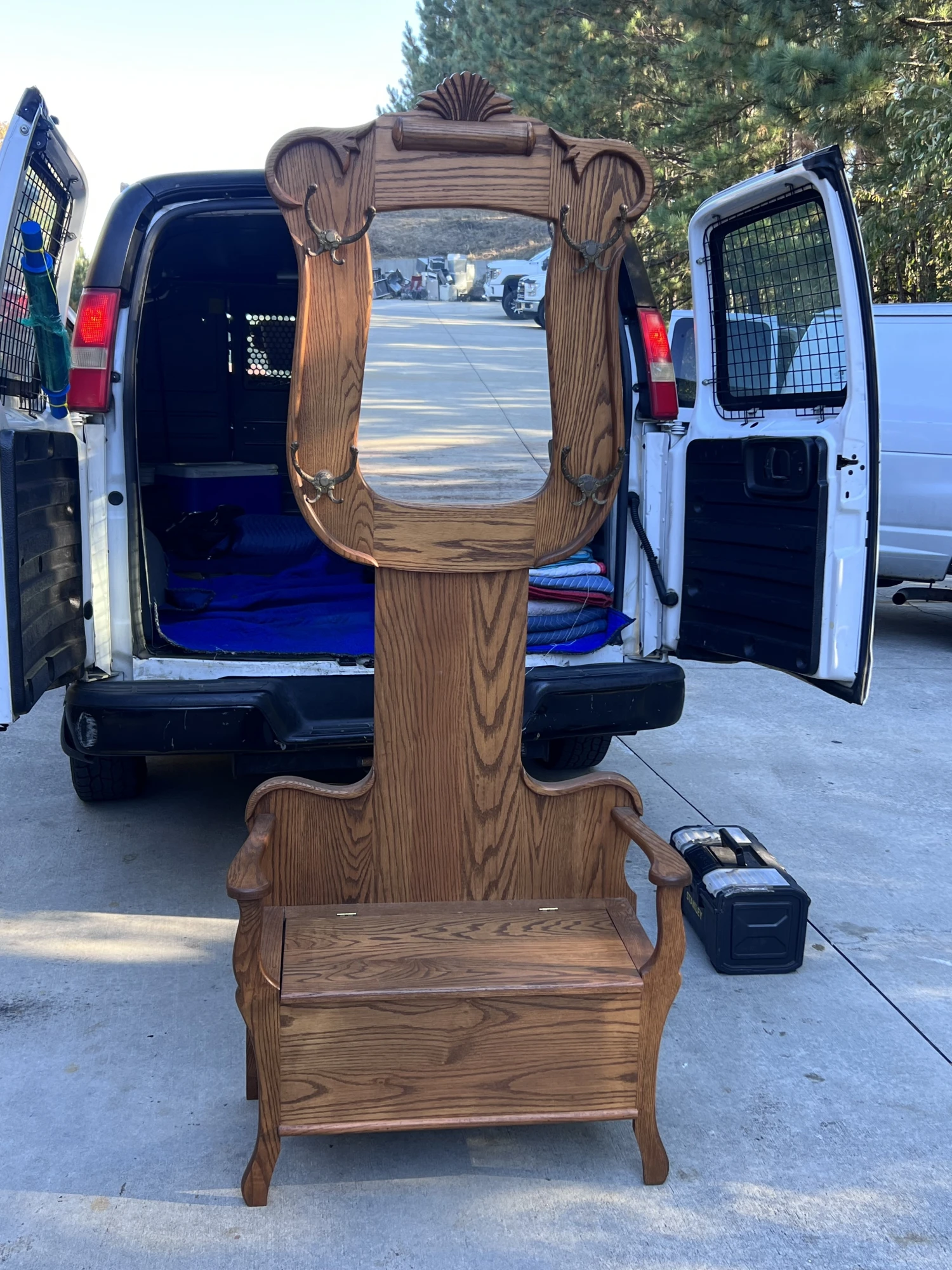 Beautiful vintage wooden hall tree with a mirror and brass coat hangers along with a bench with storage. Great piece …